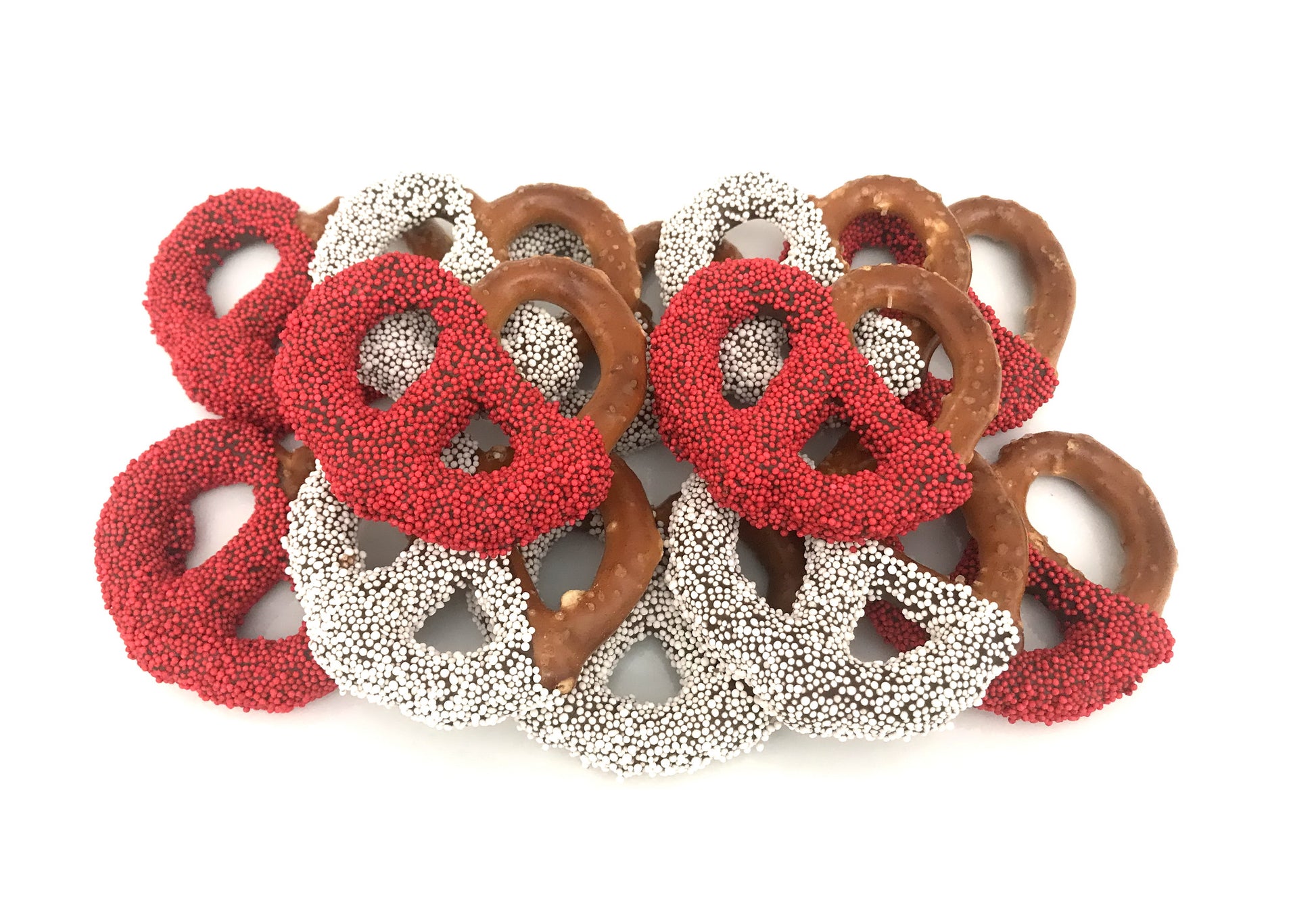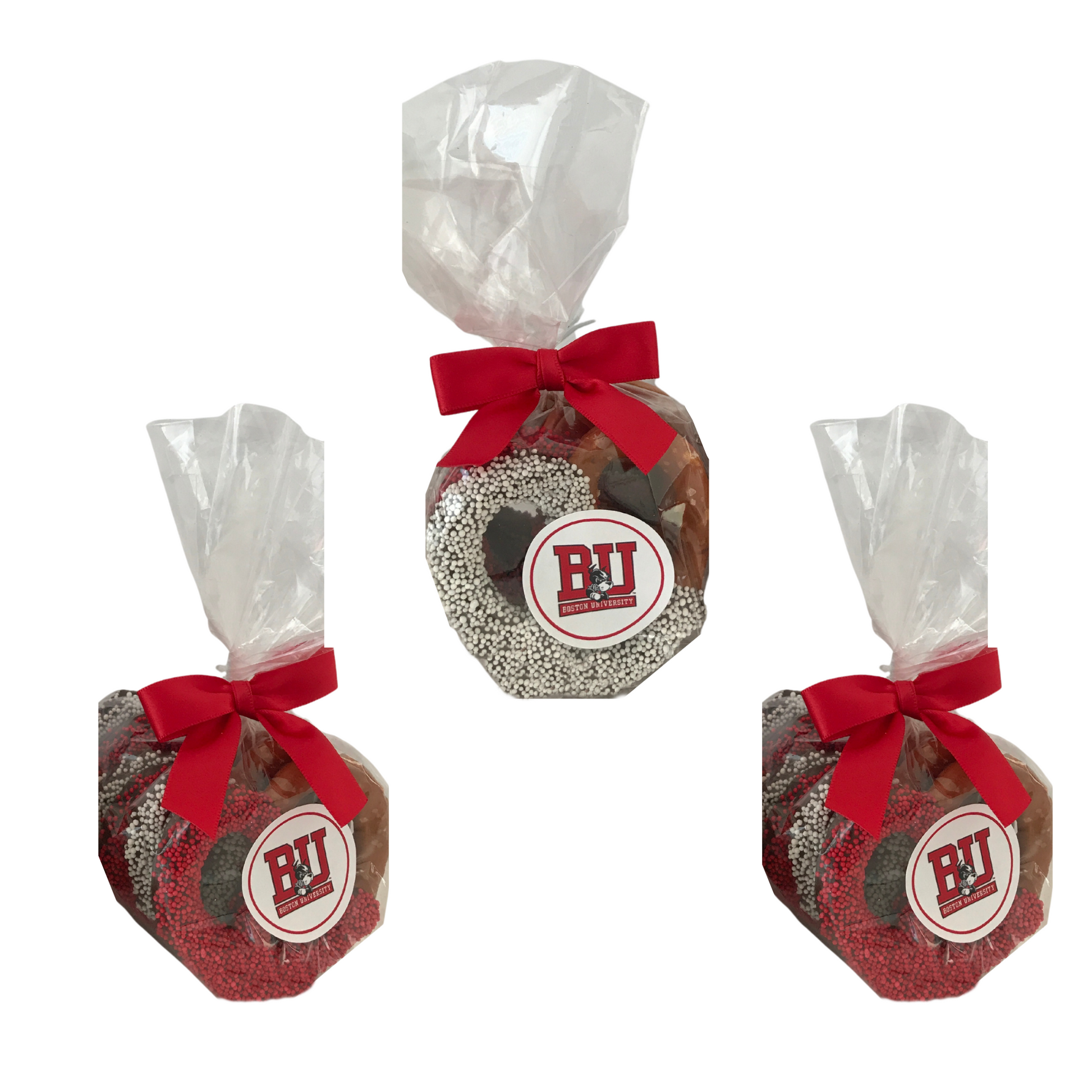 GO TERRIERS! These yummy large 3" pretzels are dipped in chocolate and topped with Boston University colored sprinkles. These are the perfect sweet and salty treat and make a wonderful college care package/gift for exams, graduation, any time, birthdays, sorority/fraternity gift, for a BU alumni, or any BU fan. Each order is beautifully packaged. (Exact packaging may vary based on availability.)