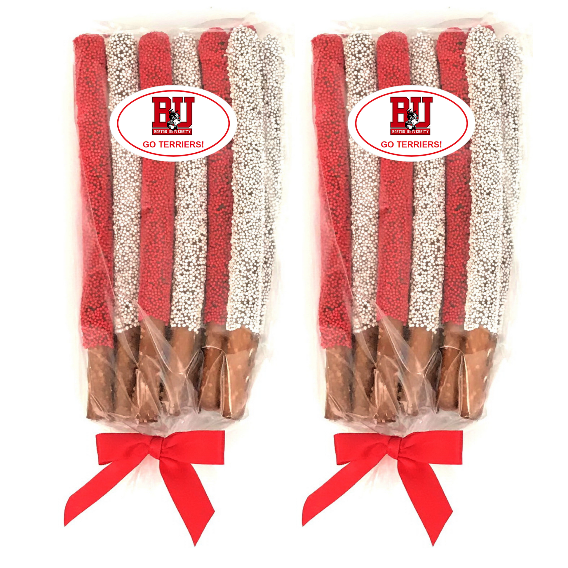 GO TERRIERS! These yummy chocolate pretzel rods are topped with Boston University colored sprinkles. These are the perfect sweet and salty treat and make a wonderful college care package/gift for exams, graduation, any time, birthdays, sorority/fraternity gift, for a BU alumni, or any BU fan. Each order is beautifully packaged. (Exact packaging may vary based on packaging product availability.)