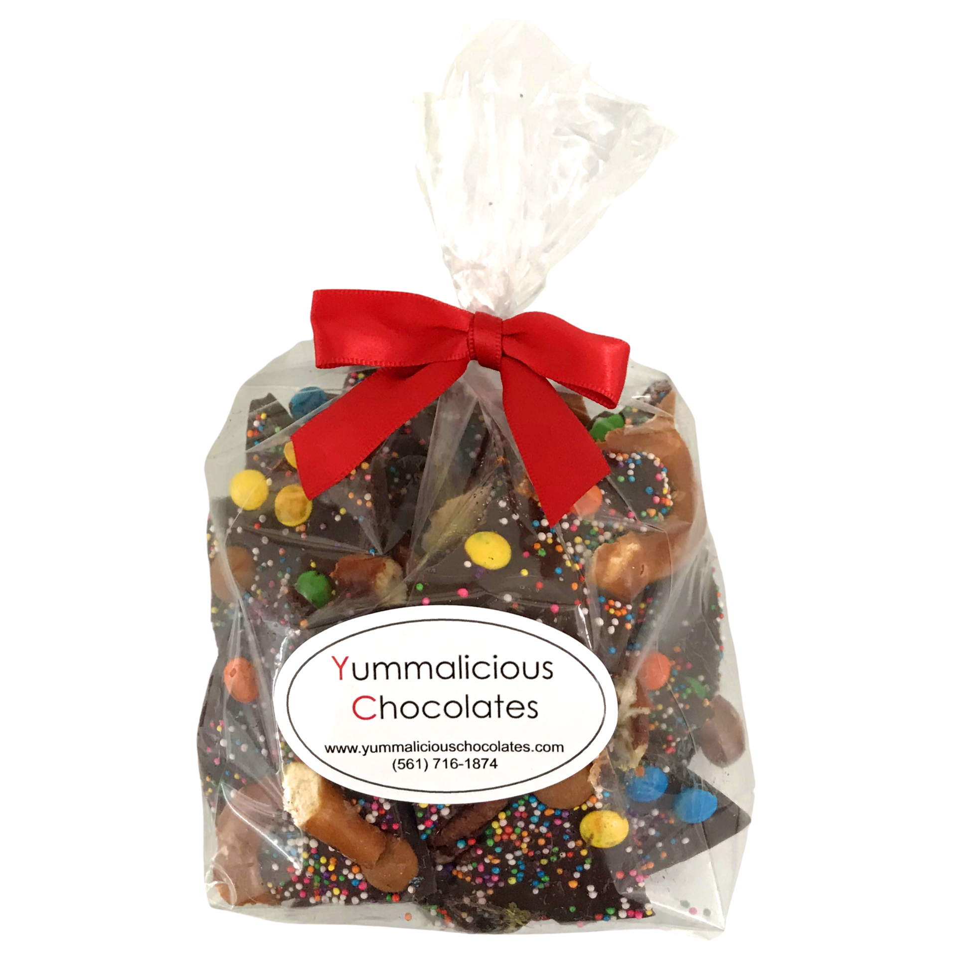 Chocolate bark is big chunks of broken up chocolate that we top with pretzels, pecans, sprinkles, M&M's, marshmallows, and caramel. This stays fresh for several weeks as long as the package is kept sealed or placed in a container. However, the bark is so yummy it probably won't even last that long! Every order is beautifully packaged.
