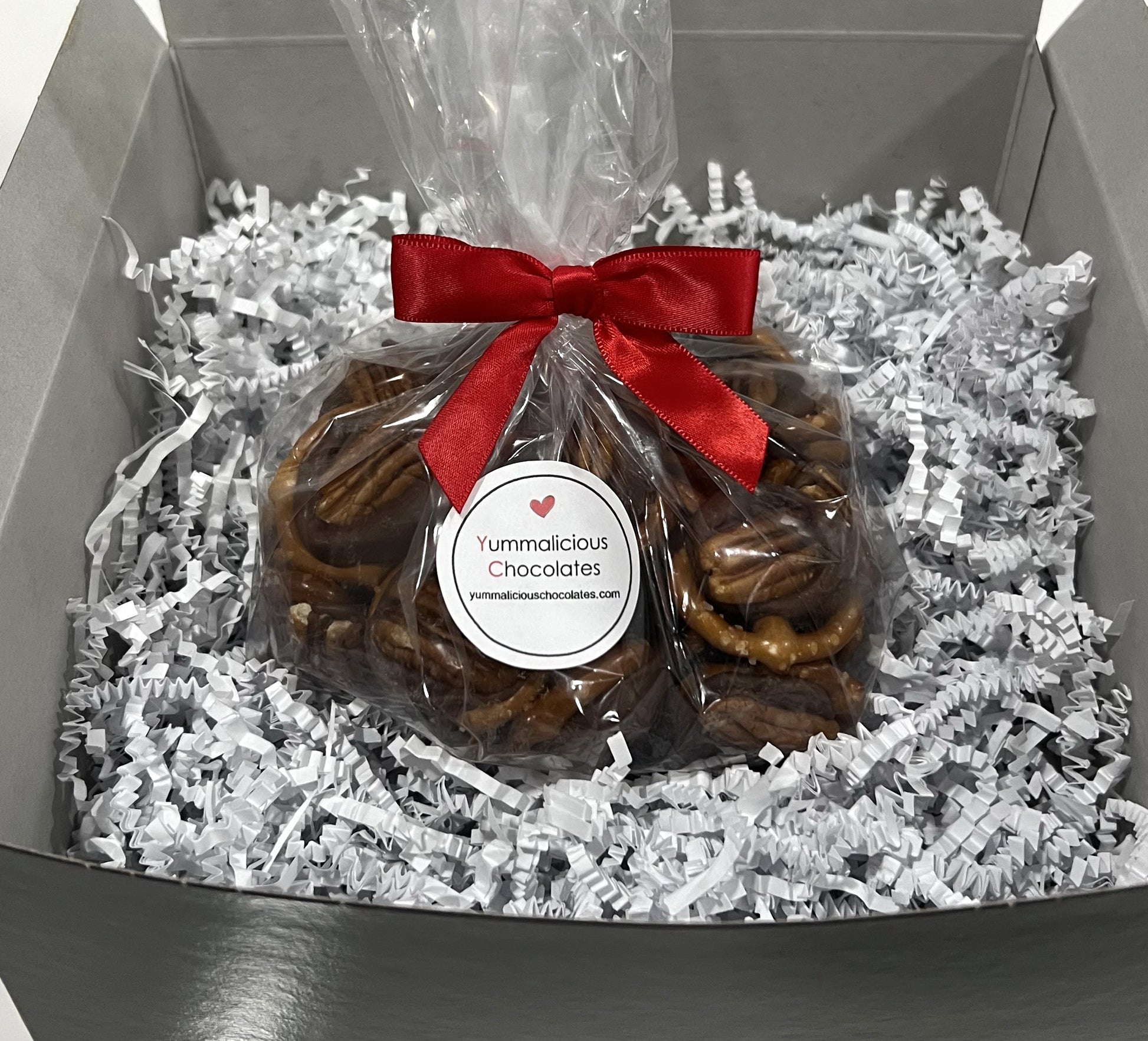 This yummy chocolate treat sits on a mini pretzel and includes a pecan and delicious caramel. These are the perfect sweet and salty treat to eat at home for any occasion! Each order is beautifully packaged. (Exact packaging may vary based on availability.)