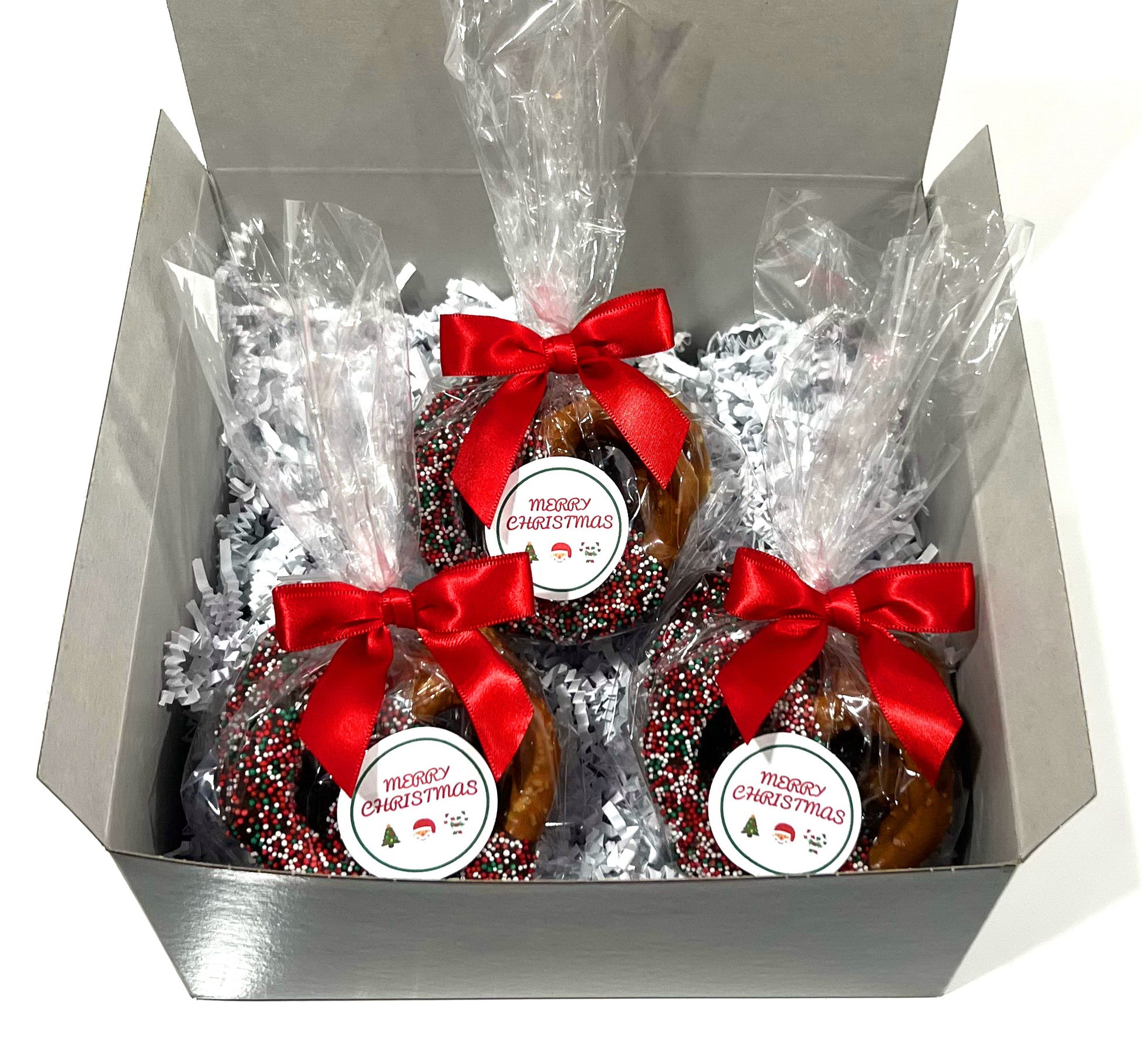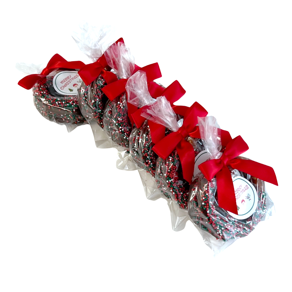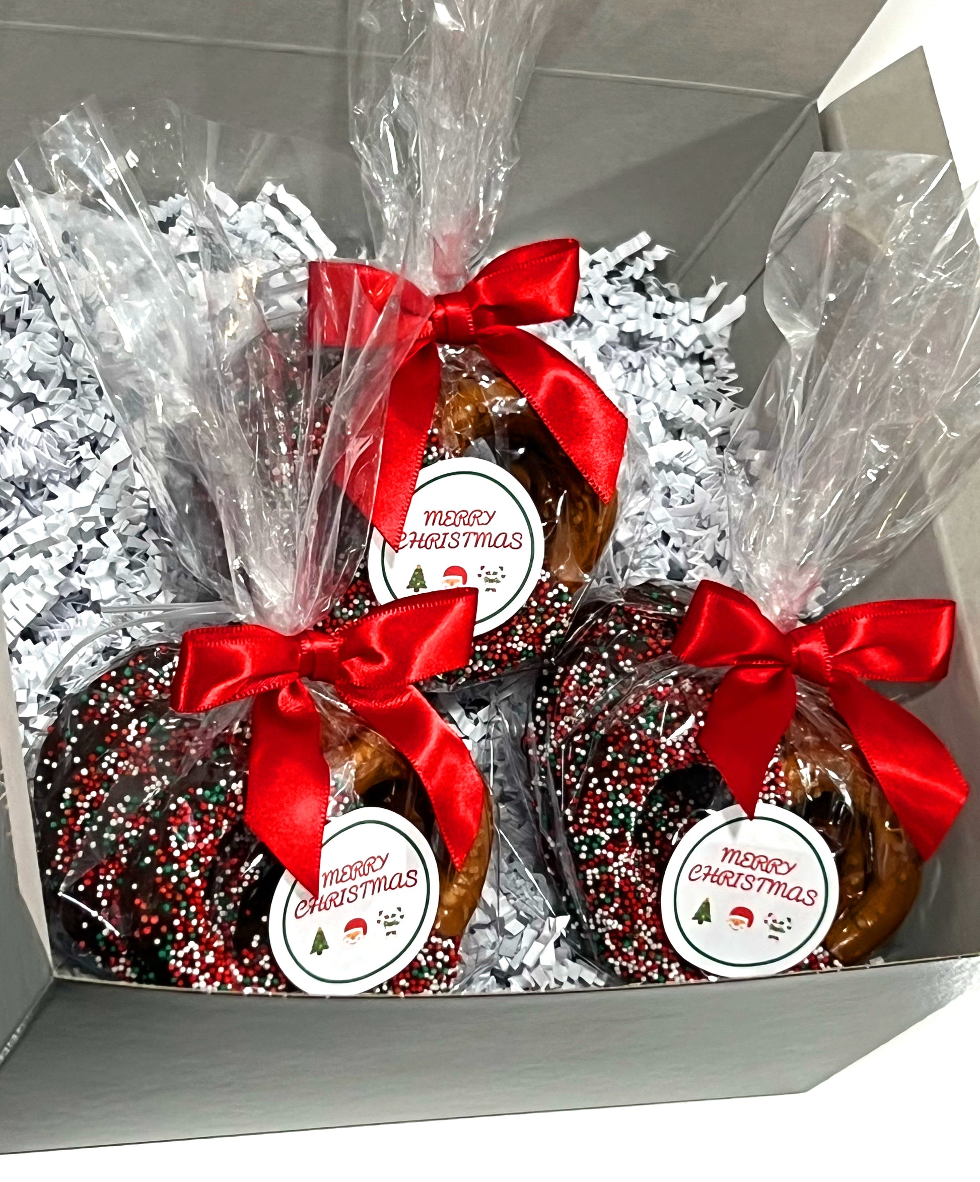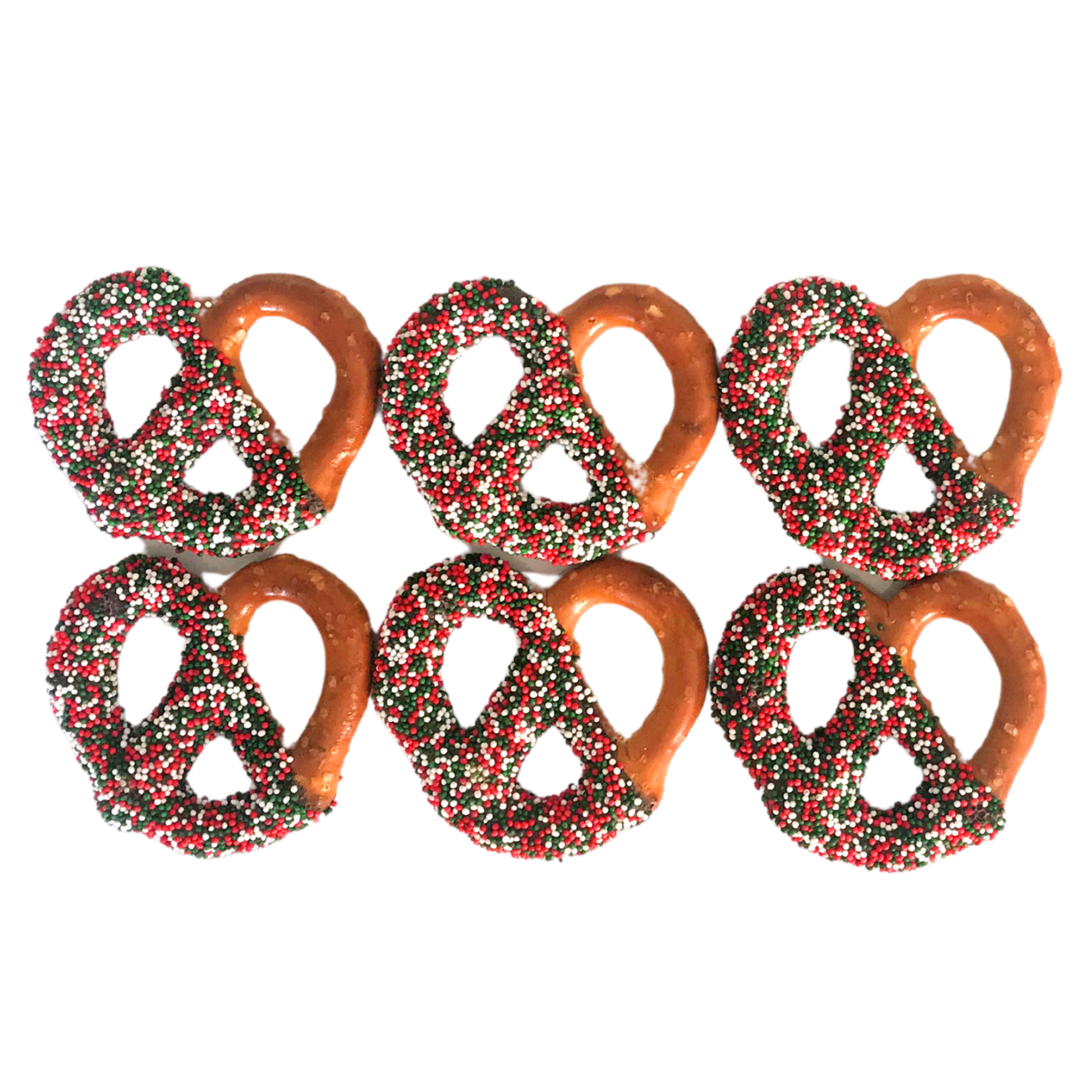 These Christmas yummies are large 3" pretzels dipped in chocolate and topped with Christmas colored sprinkles. These are the perfect sweet and salty treat to eat at home or give as Christmas gifts for teachers, coworkers, friends, stocking stuffers, Secret Santa parties, and more! Each order is beautifully packaged.