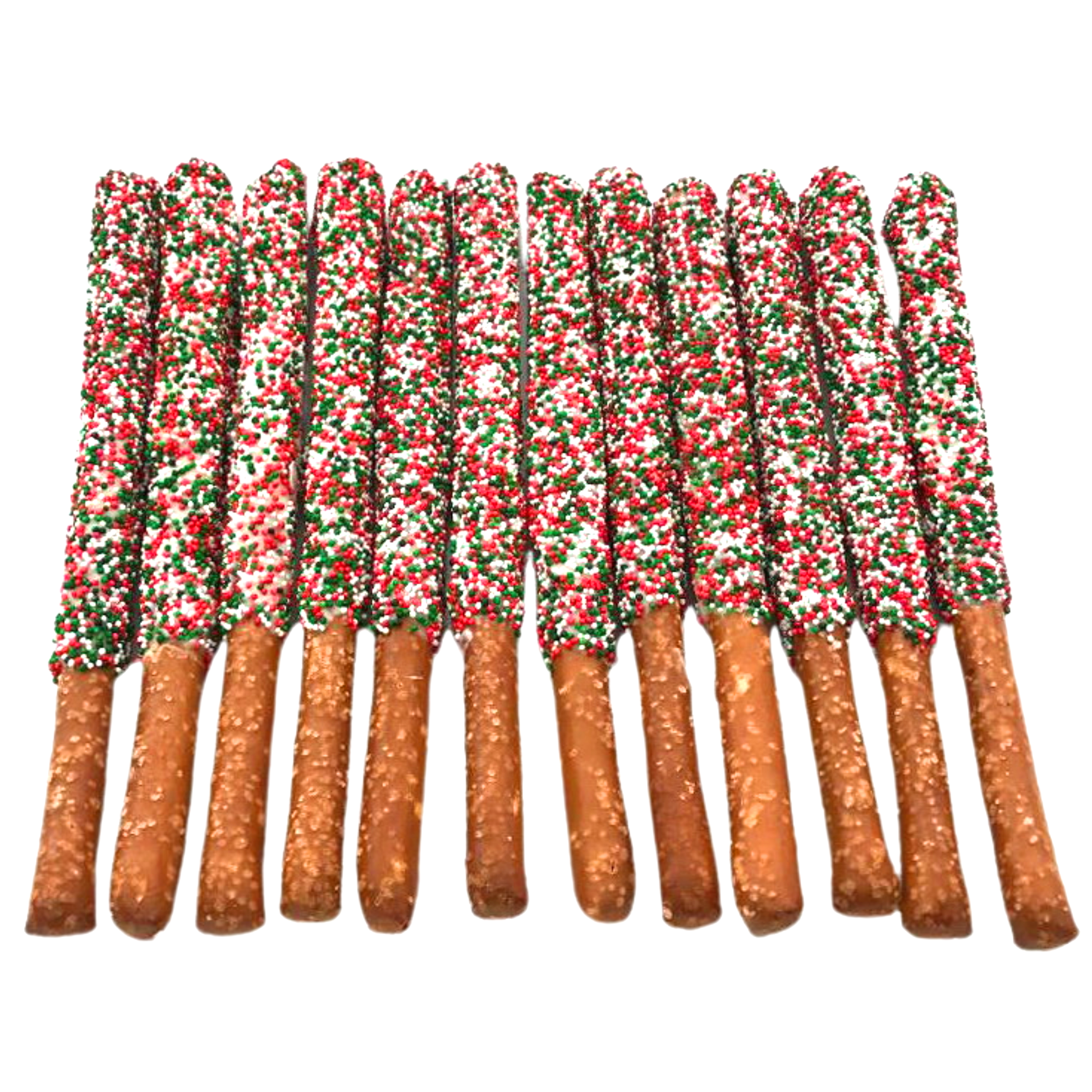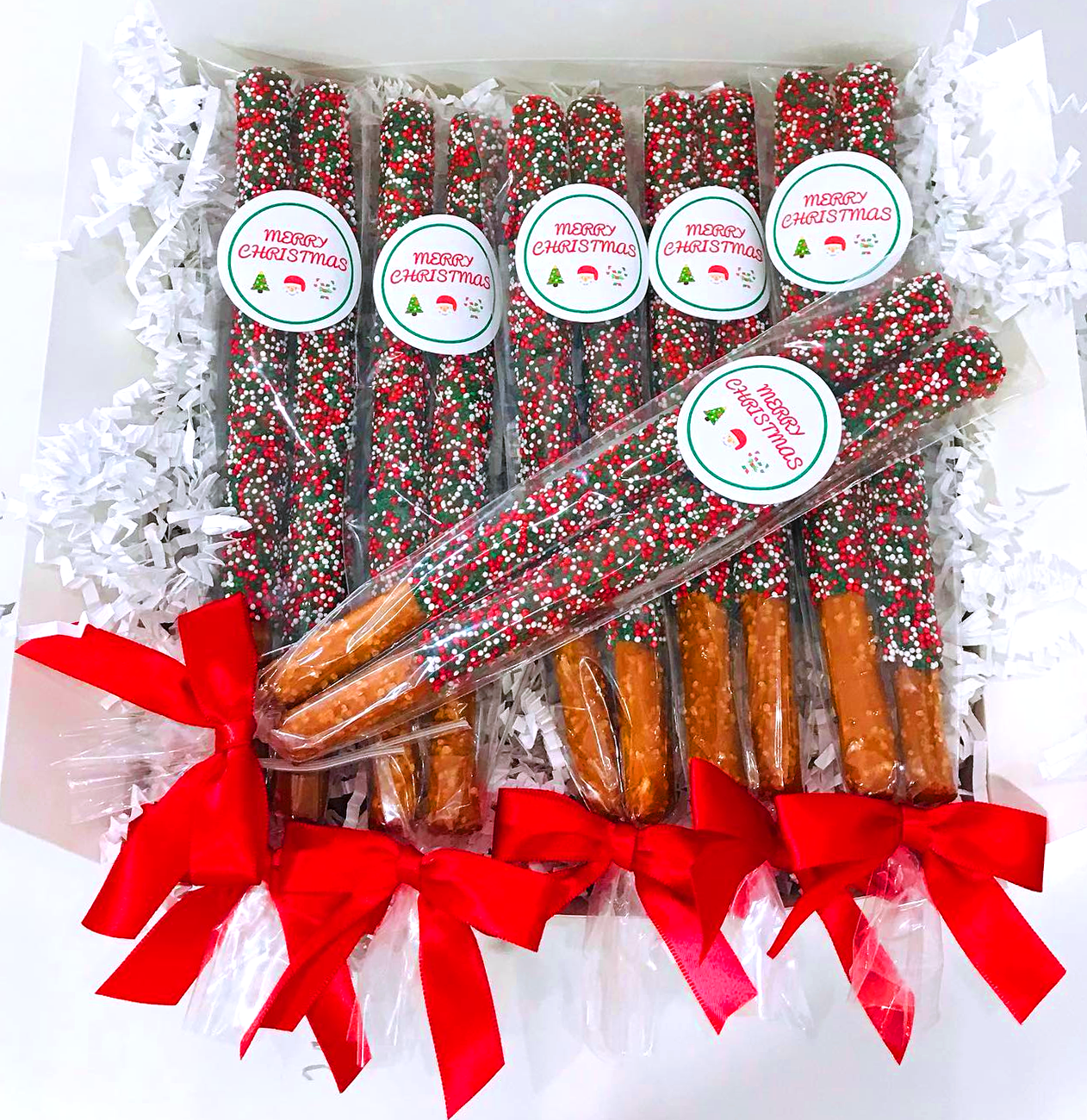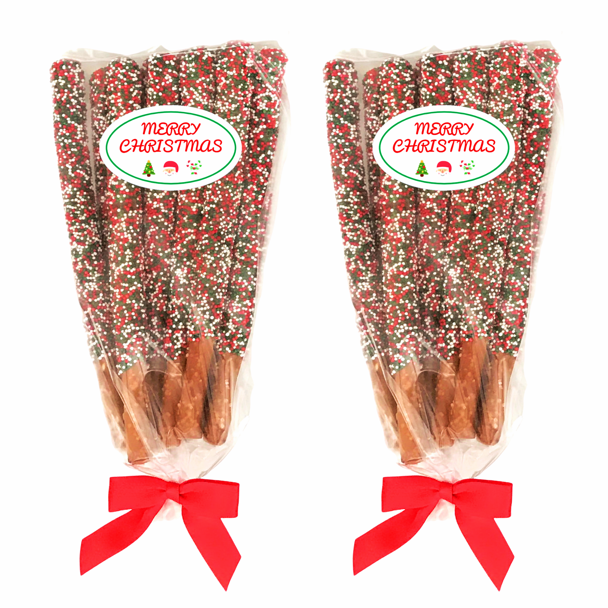 These yummy Christmas pretzel rods are dipped in chocolate and topped with Christmas colored sprinkles. They are the perfect sweet and salty treat to eat at home or give as Christmas gifts for teachers, coworkers, friends, stocking stuffers, Secret Santa parties, and more! Each order is beautifully packaged.
