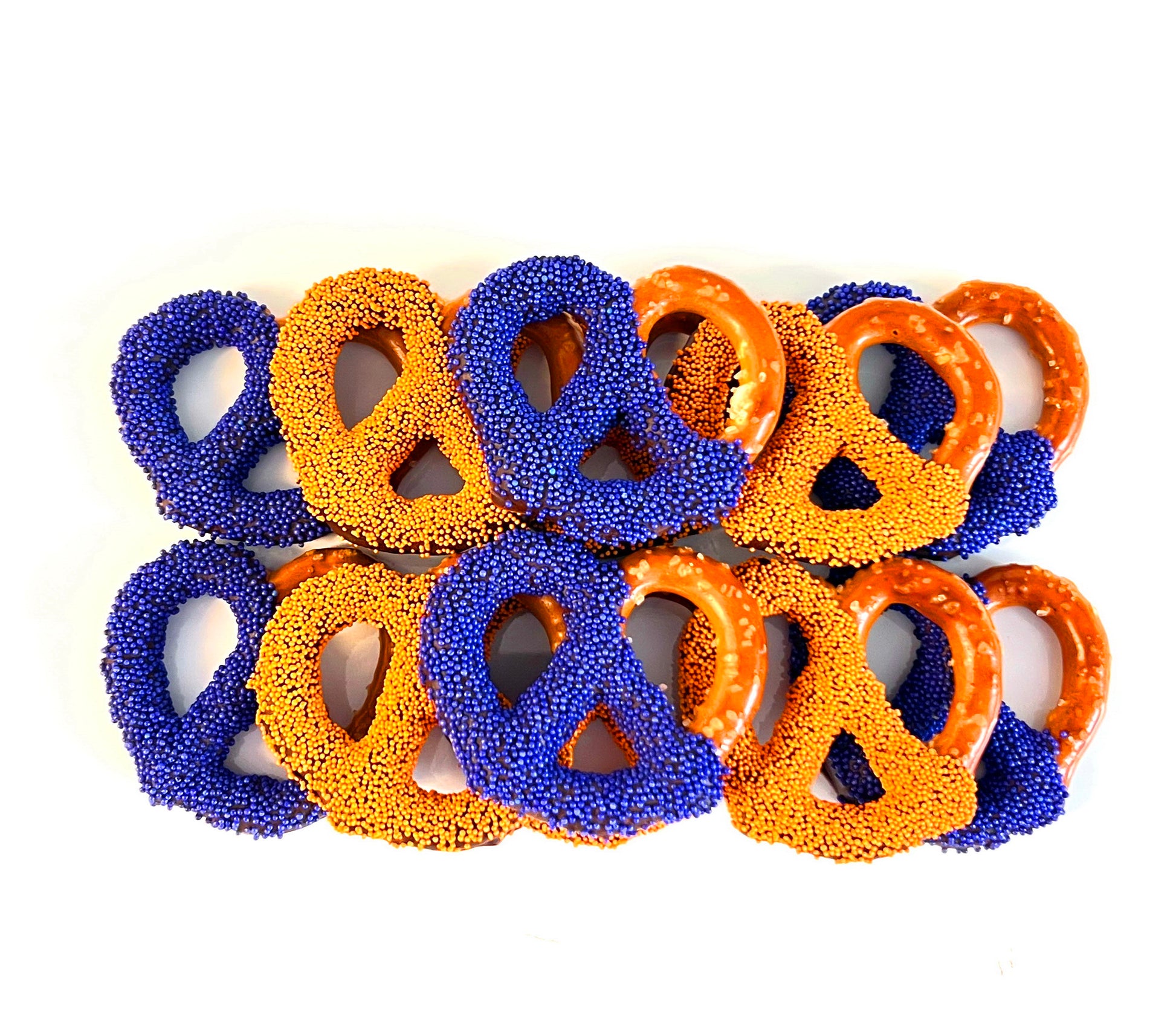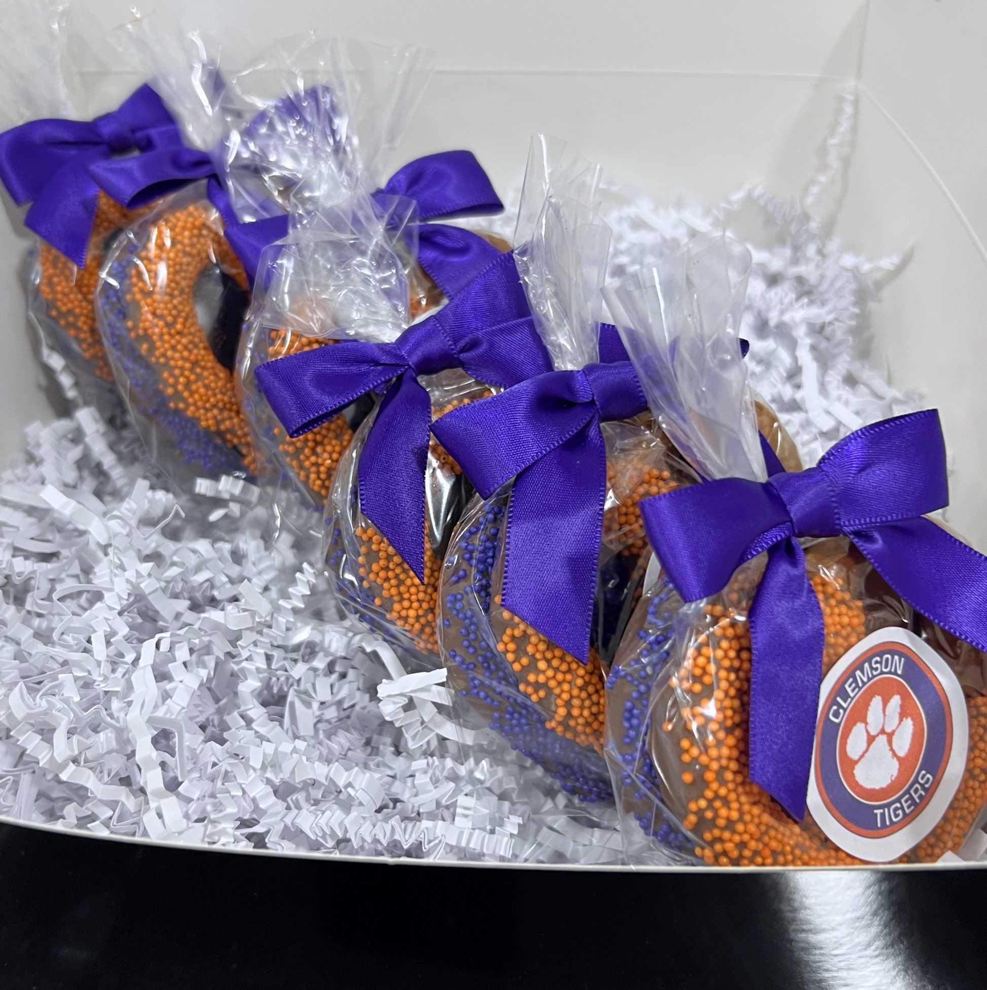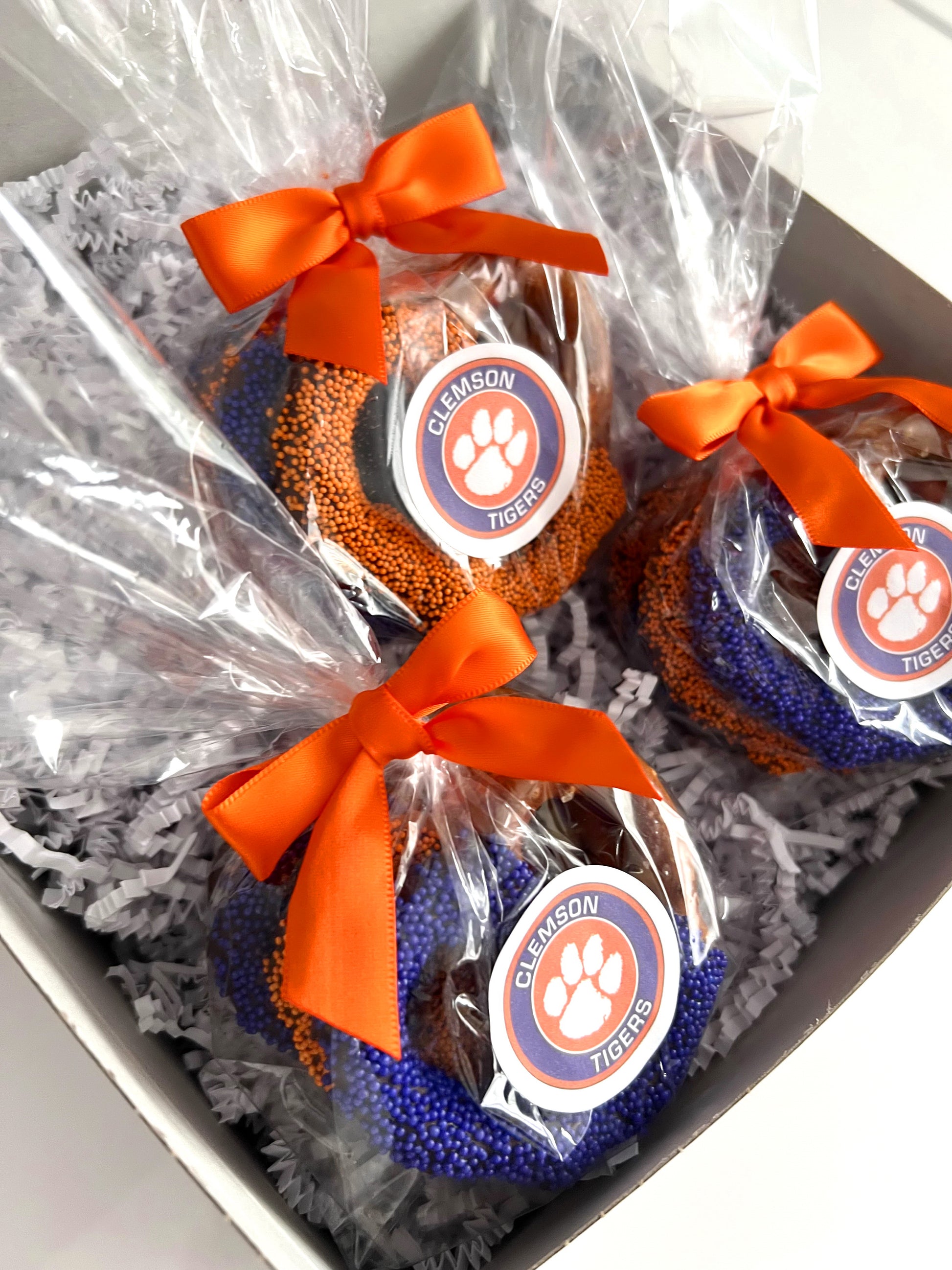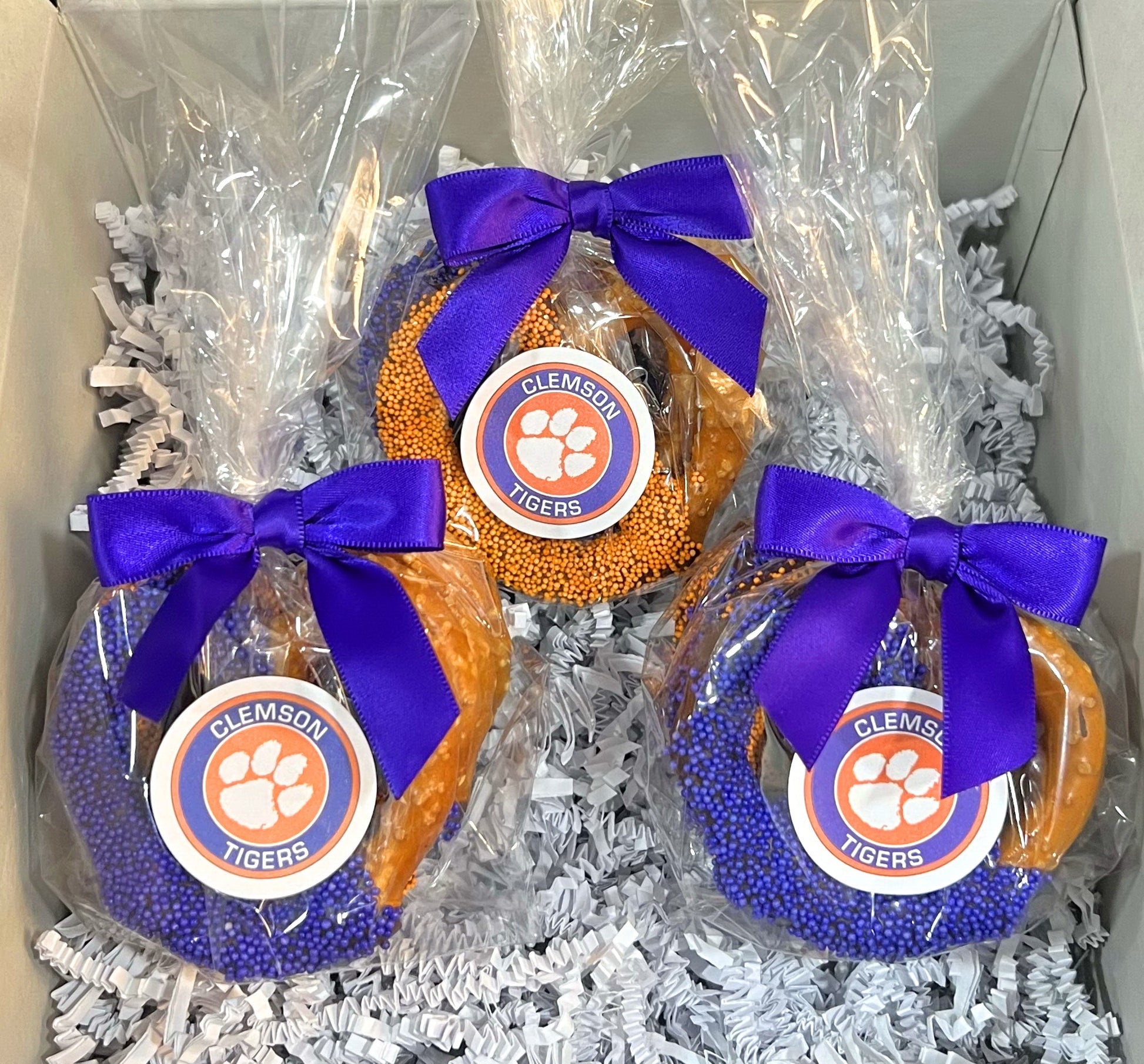 GO TIGERS! These yummy large 3" pretzels are dipped in chocolate and topped with Clemson University colored sprinkles. These are the perfect sweet and salty treat and make a wonderful college acceptance gift, college care package, gift for exams, graduation, any time, birthdays, sorority/fraternity gift, for a Clemson alumni, or any Clemson fan. Each order is beautifully packaged. (Exact packaging may vary based on availability.)