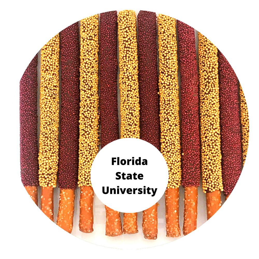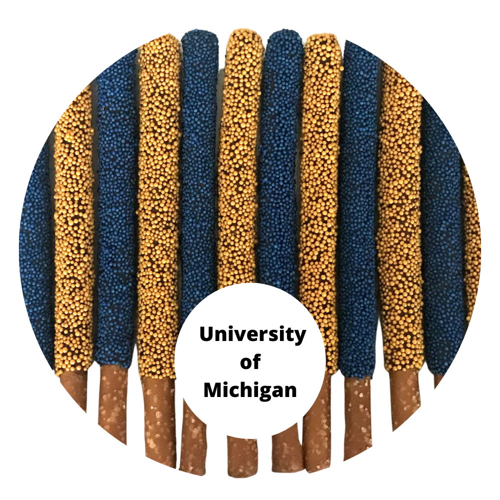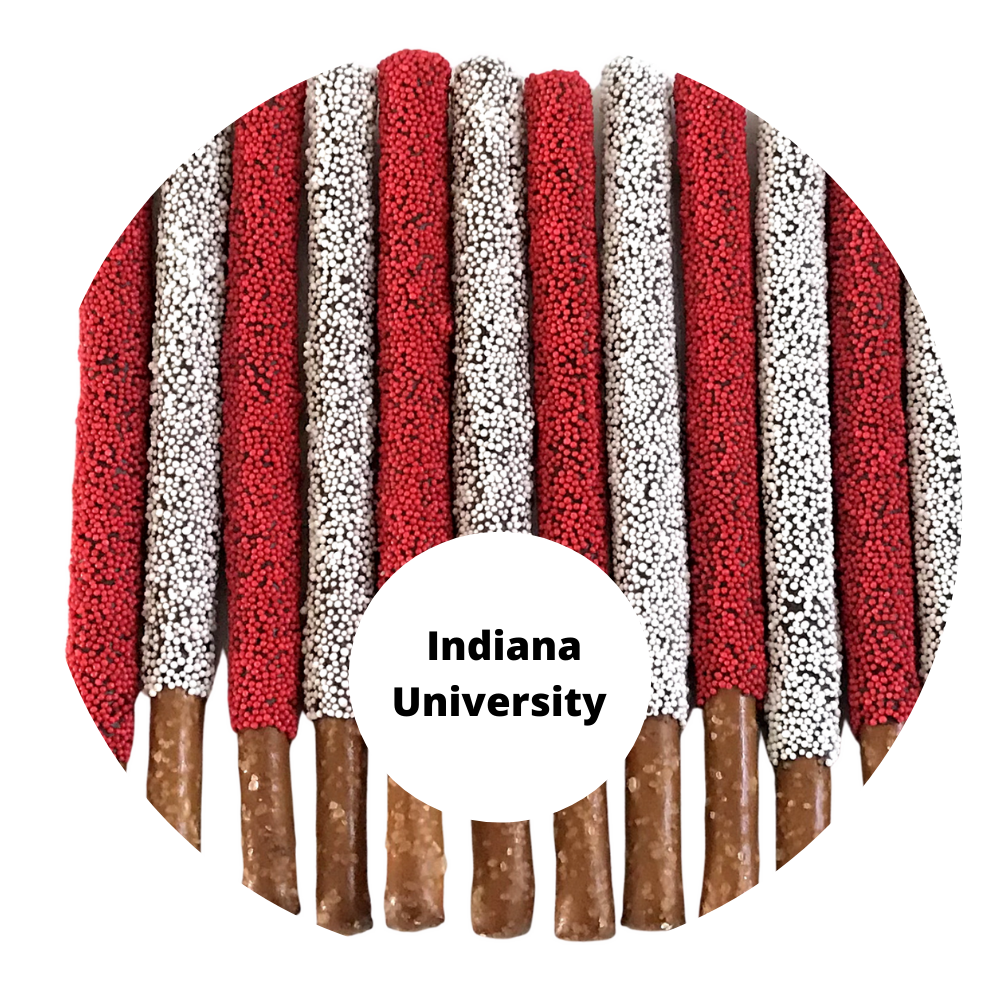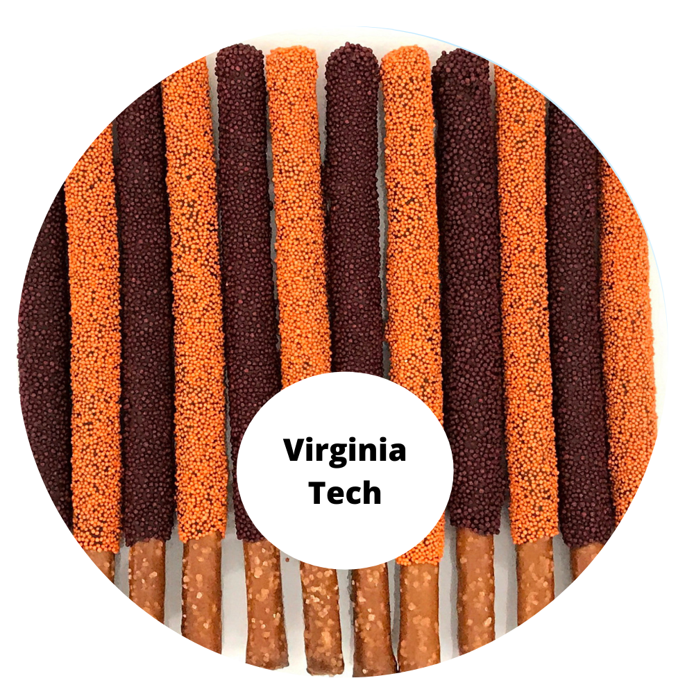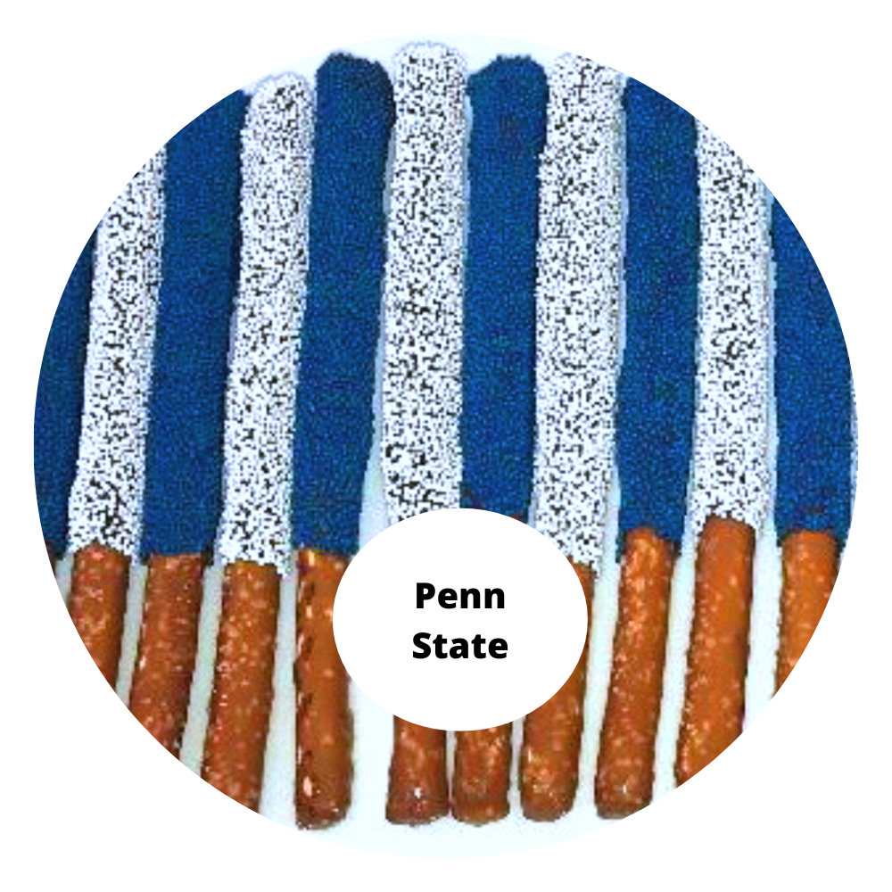 - 1/2 Dozen Chocolate Covered Pretzel Rods: Three 2-Packs (as shown). Topped with college colored sprinkles.
