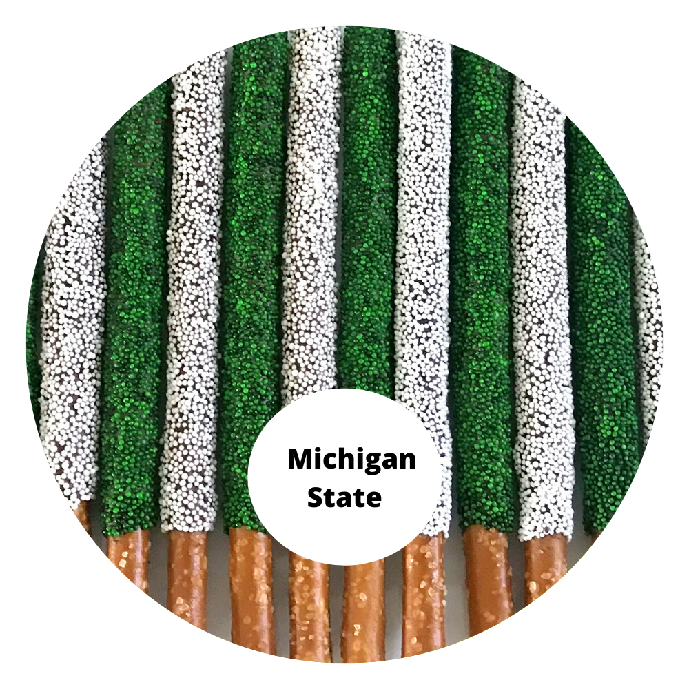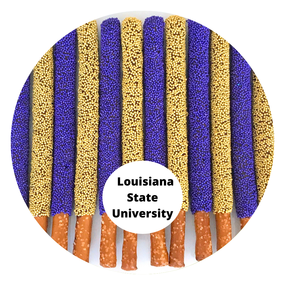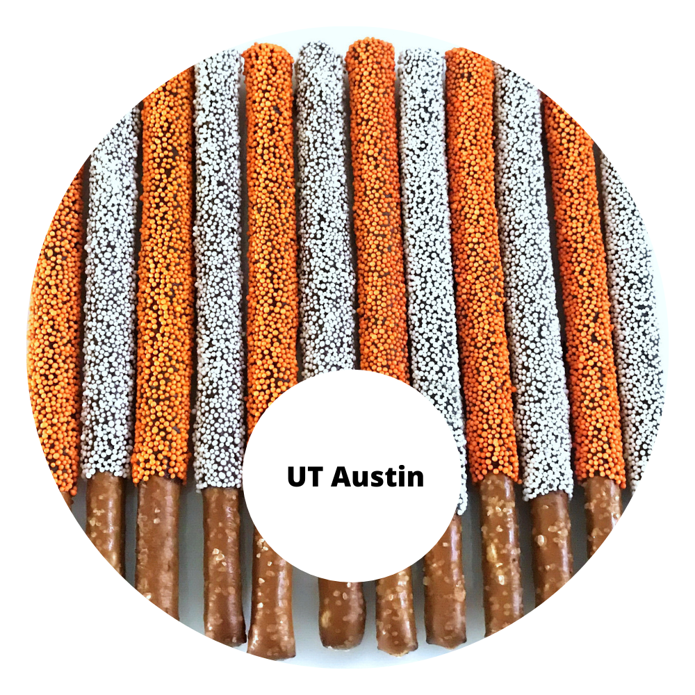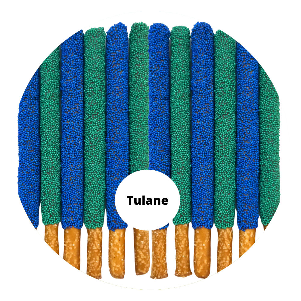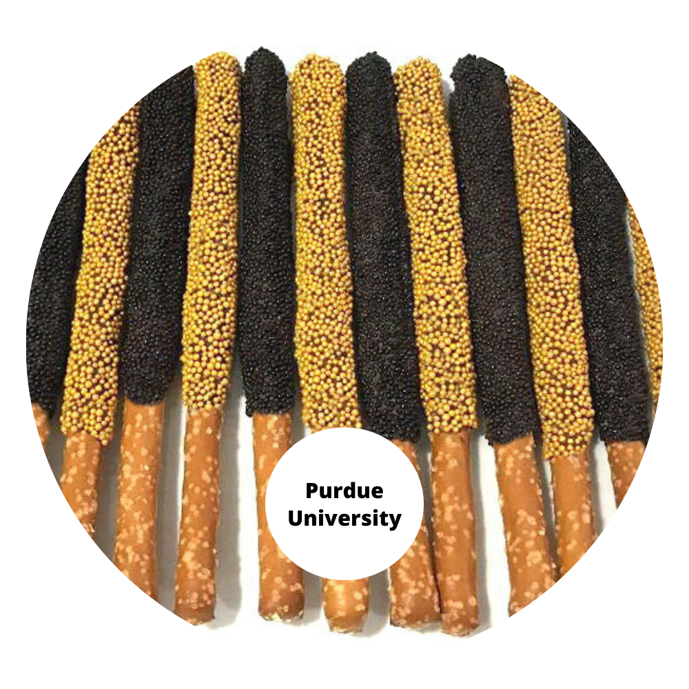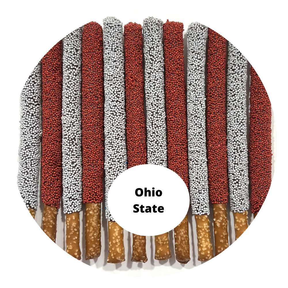 - 1/2 Dozen Chocolate Covered Pretzel Rods: Three 2-Packs (as shown). Topped with college colored sprinkles.