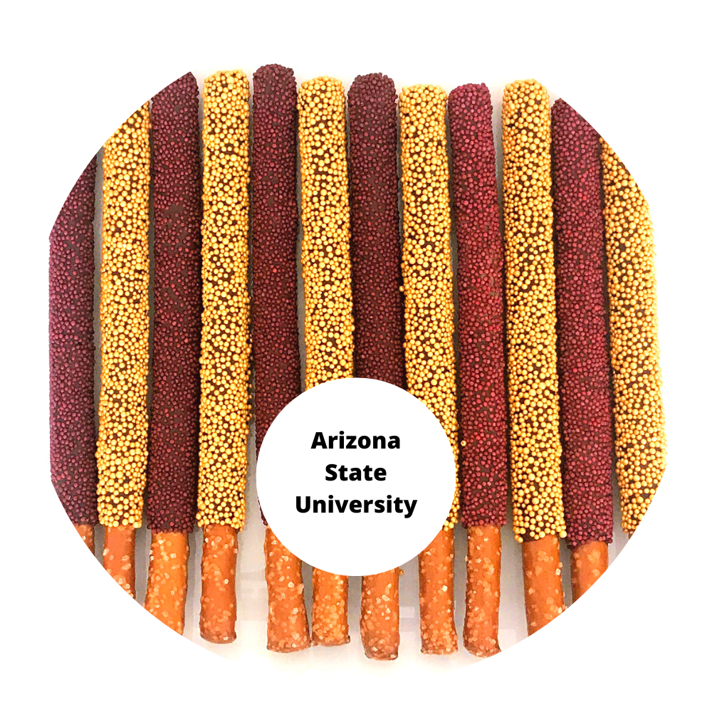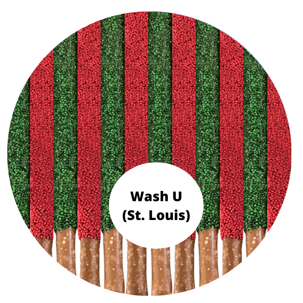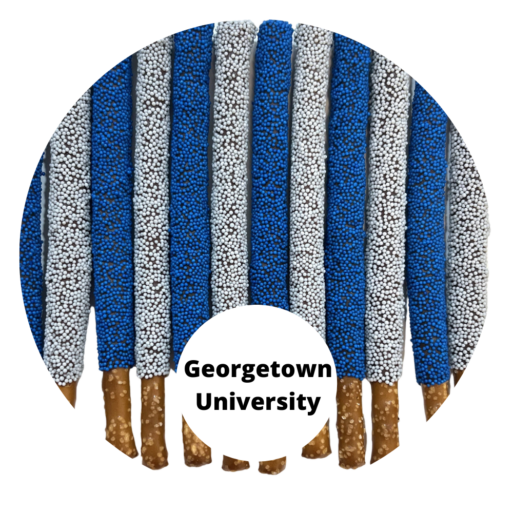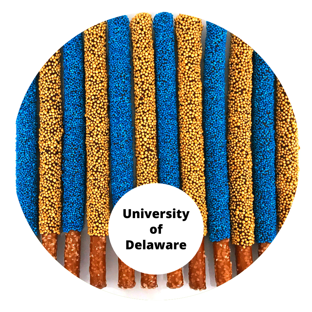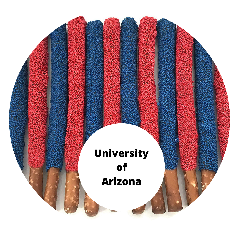 - 1/2 Dozen Chocolate Covered Pretzel Rods: Three 2-Packs (as shown). Topped with college colored sprinkles.