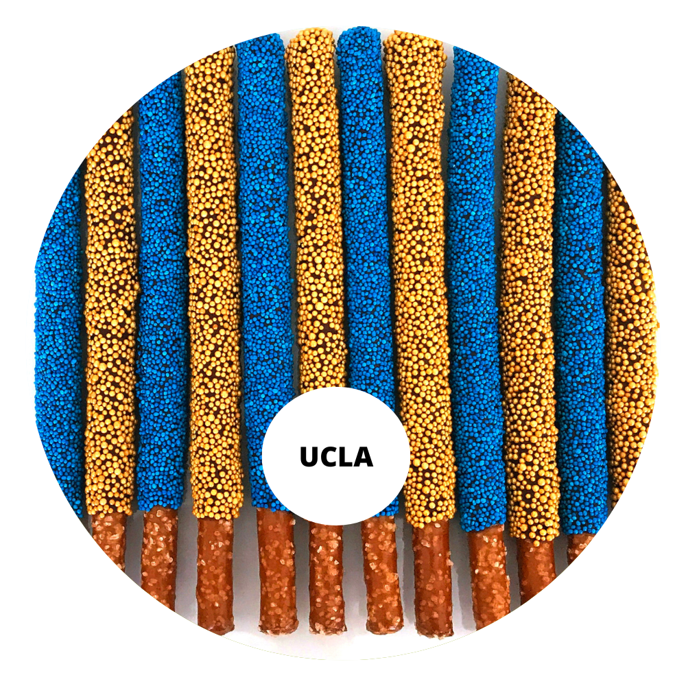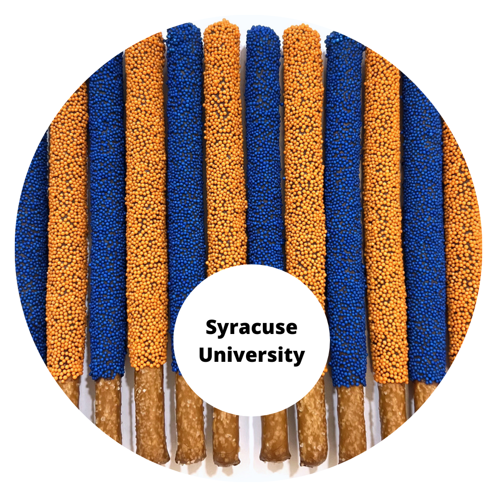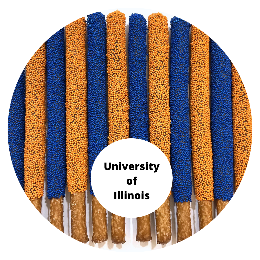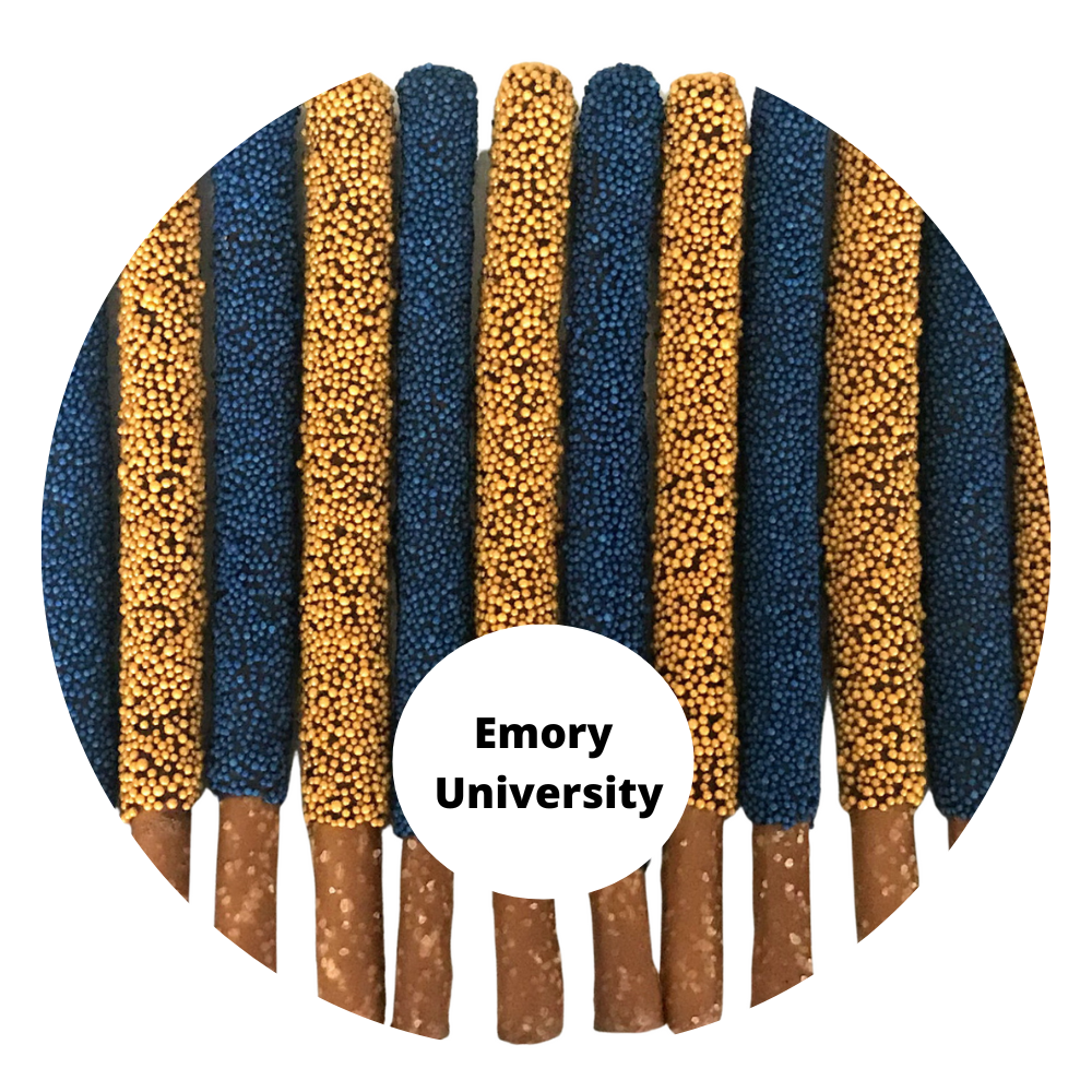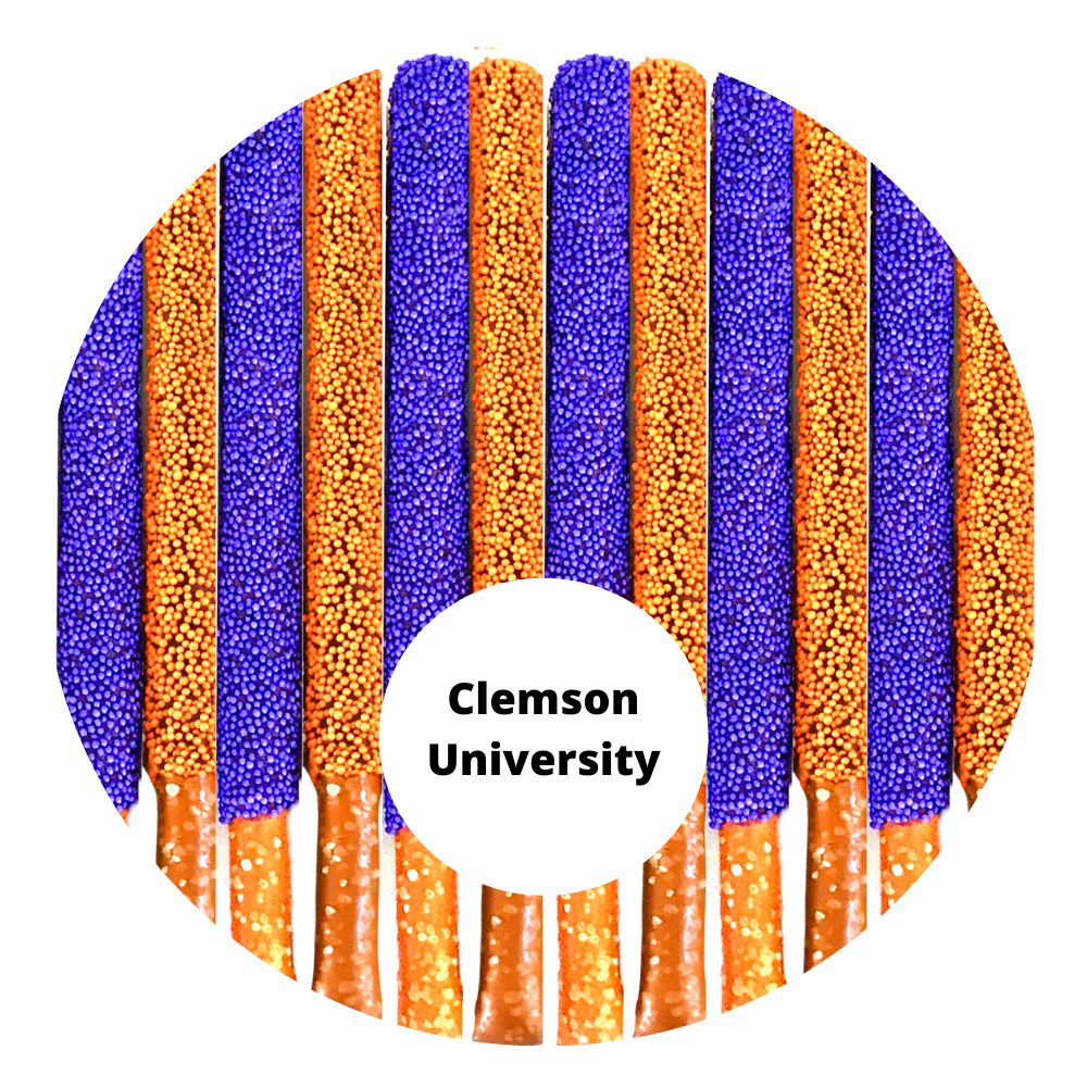 - 1/2 Dozen Chocolate Covered Pretzel Rods: Three 2-Packs (as shown). Topped with college colored sprinkles.