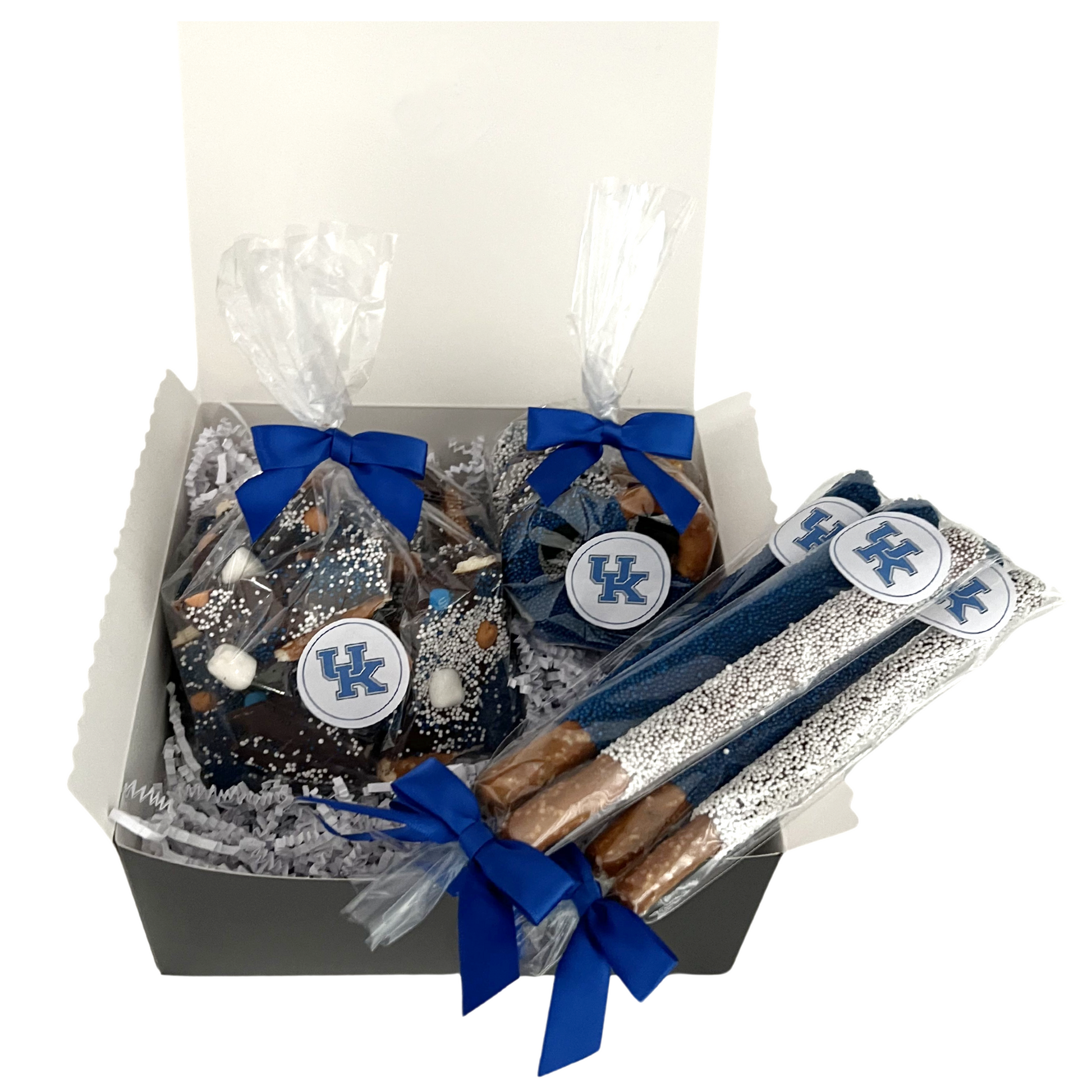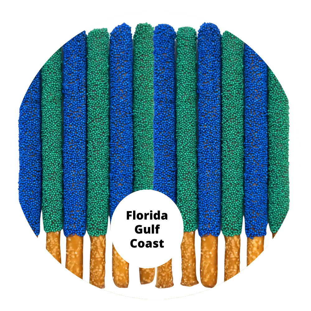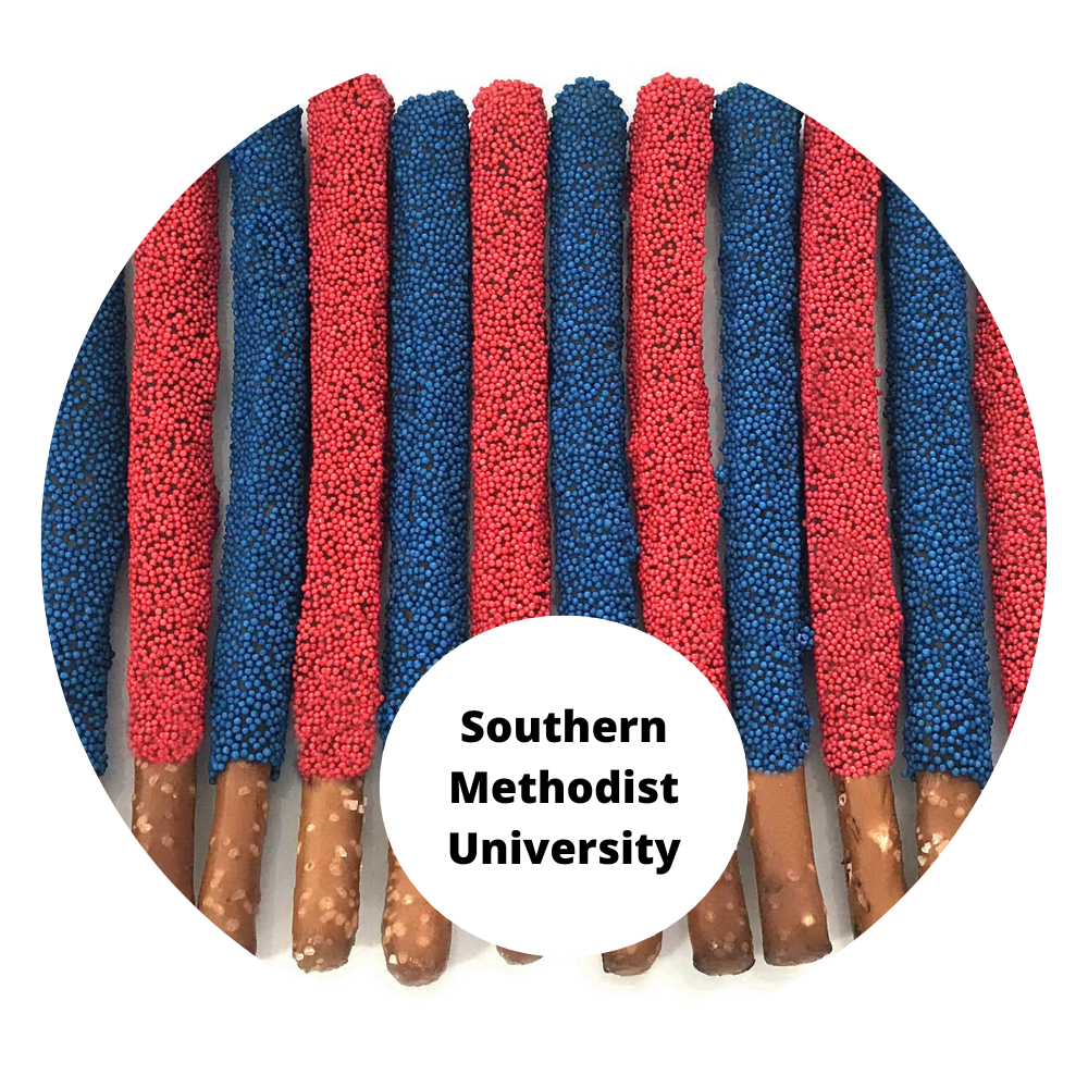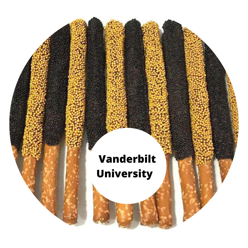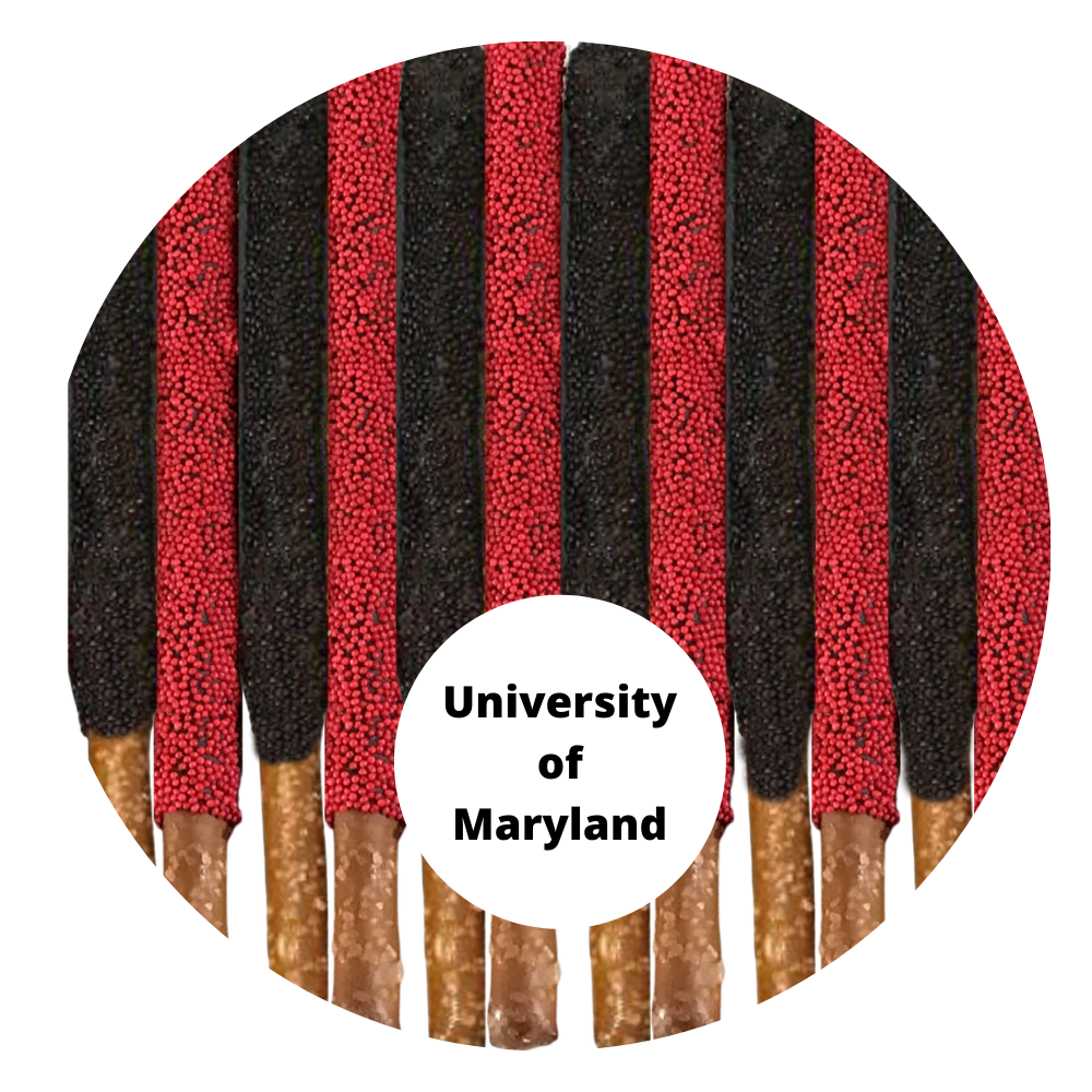 - 1/2 Dozen Chocolate Covered Pretzel Rods: Three 2-Packs (as shown). Topped with college colored sprinkles.