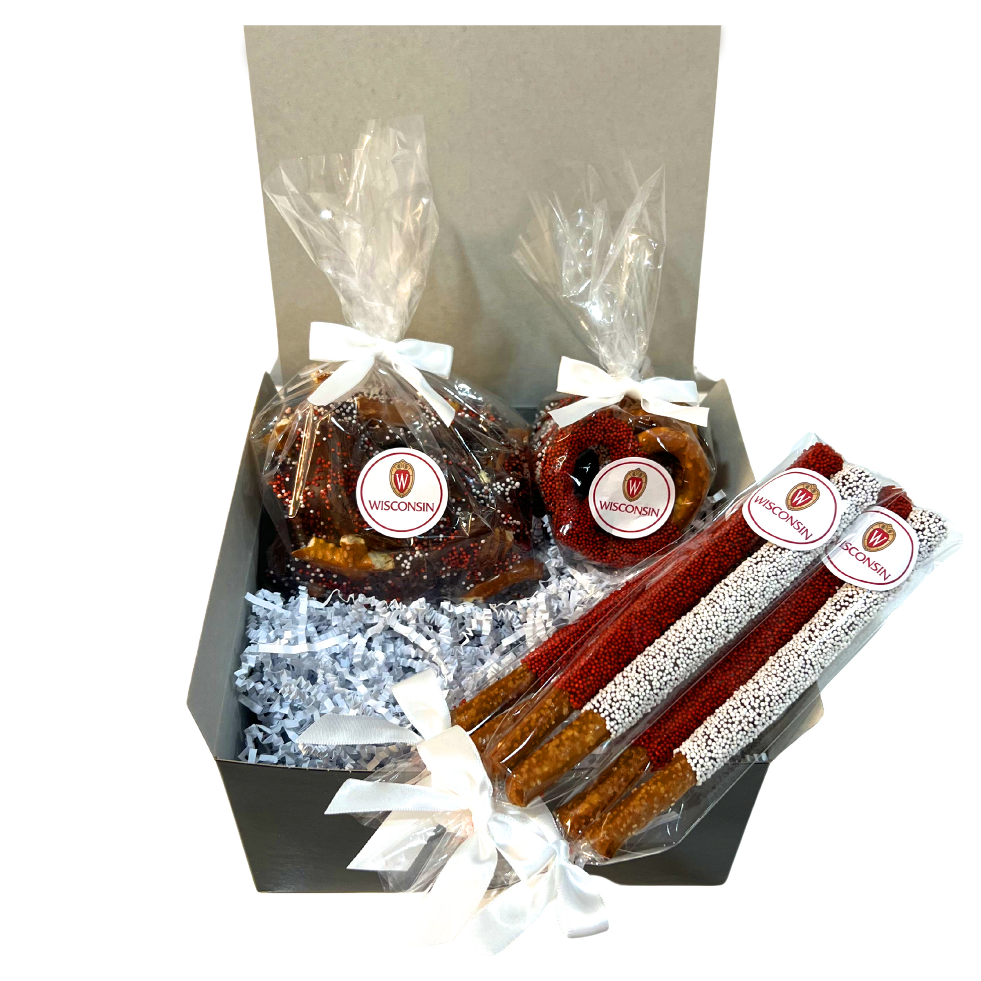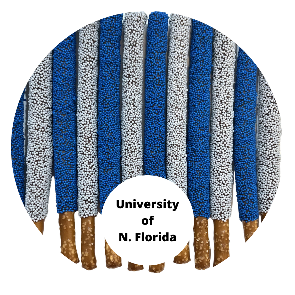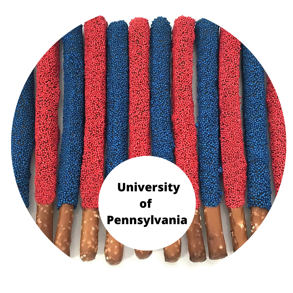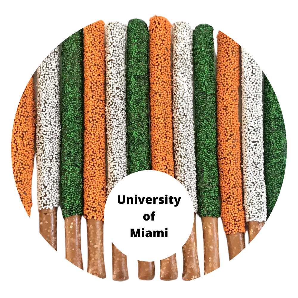- 1/2 Dozen Chocolate Covered Jumbo 3" Pretzels: Topped with college colored sprinkles.