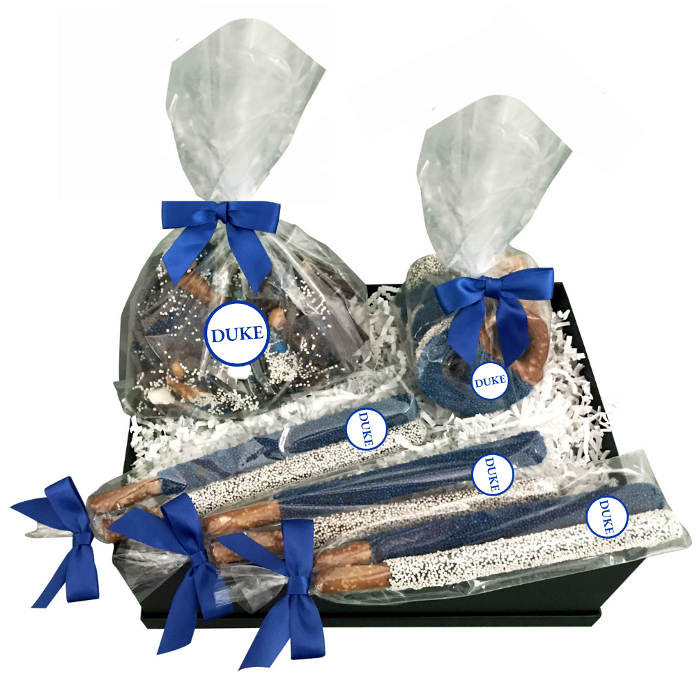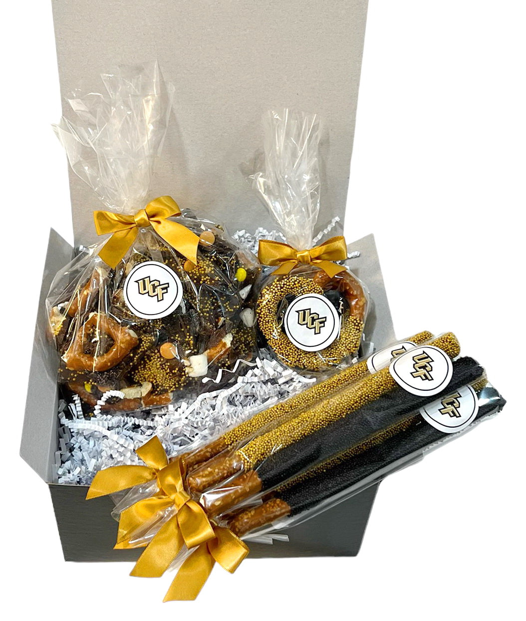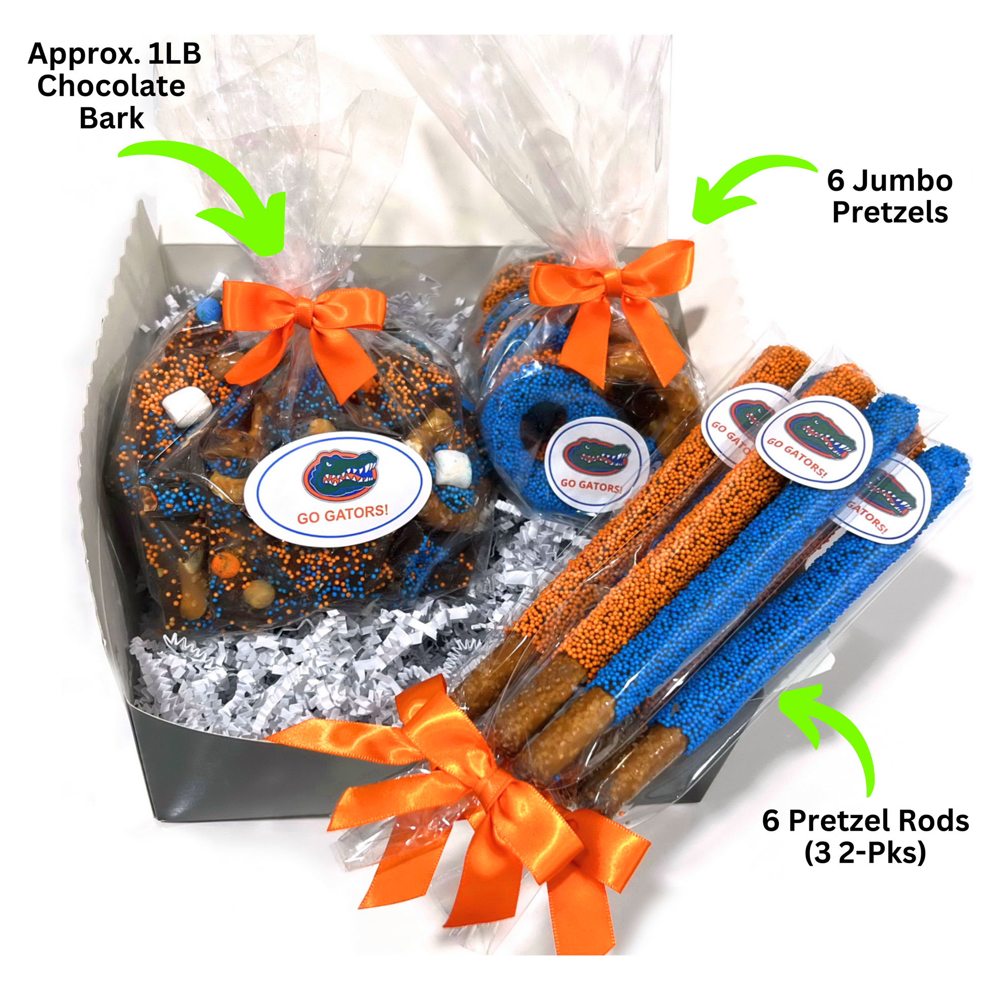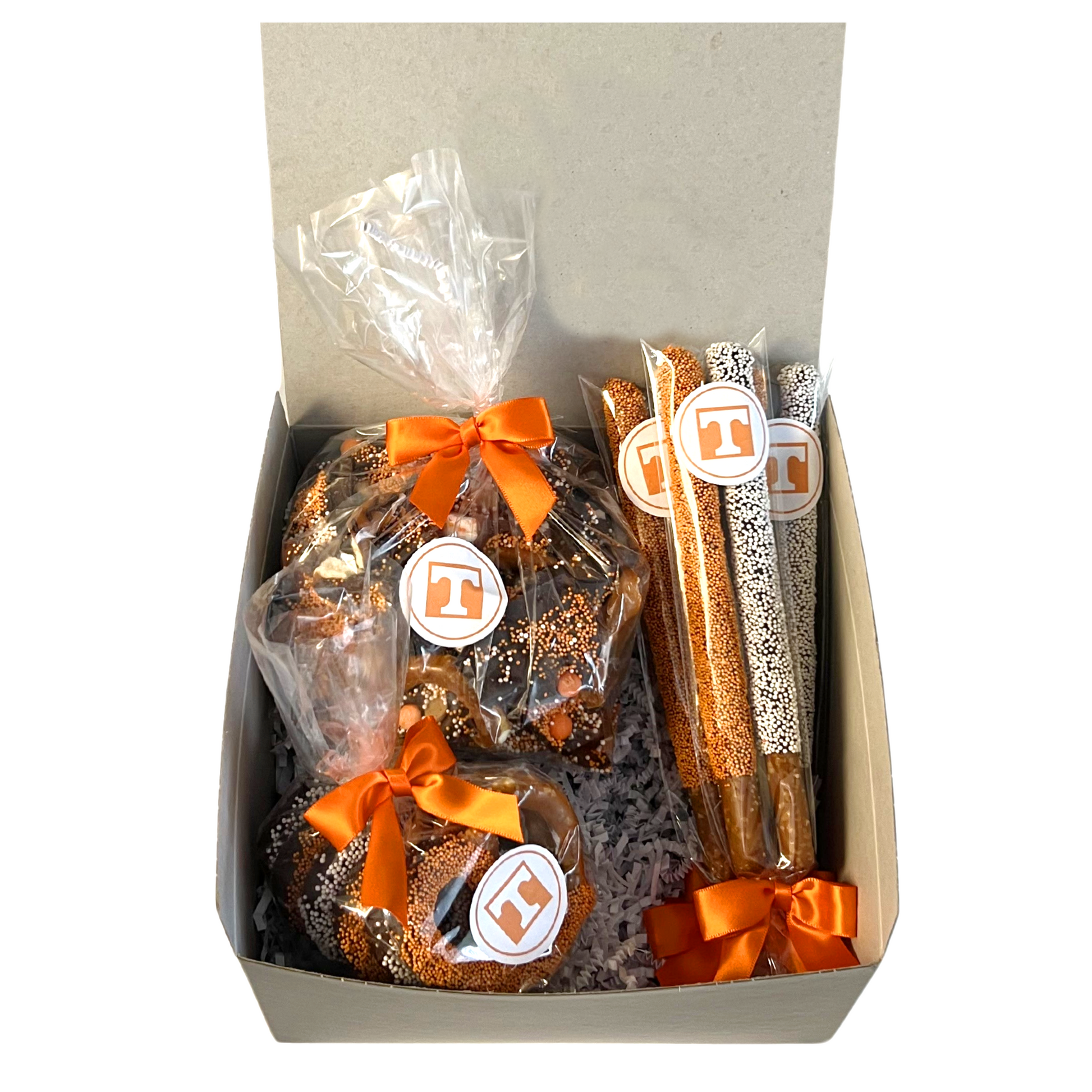 - 1/2 Dozen Chocolate Covered Jumbo 3" Pretzels: Topped with college colored sprinkles.