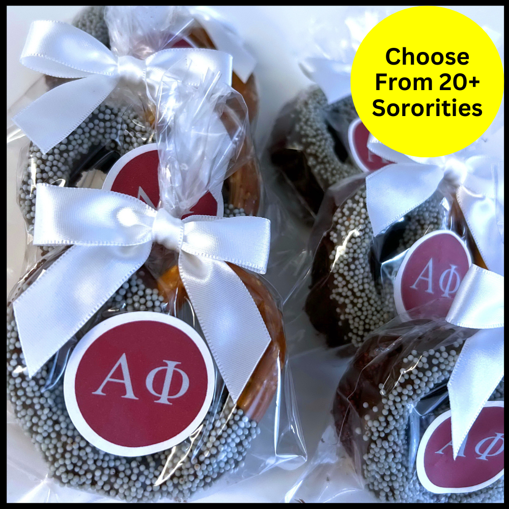 Celebrate Bid Day, Initiation Day, your Big Sister, Little Sister, or alum with our delicious sweet and salty chocolate covered sorority themed jumbo 3" pretzels. Each order is beautifully color coordinated to your sorority. First, choose your sorority from the pull-down list. Second, choose how you want them packaged. Then, we will dip the pretzels in chocolate and top them with sprinkles in 2 colors from your sorority. We then add a sticker with your sorority letters that is attached to the outside packaging, along with a pretty bow. (Exact packaging/bows may vary based on availability.) Pretzels stay fresh 3-4 weeks when sealed in packaging.