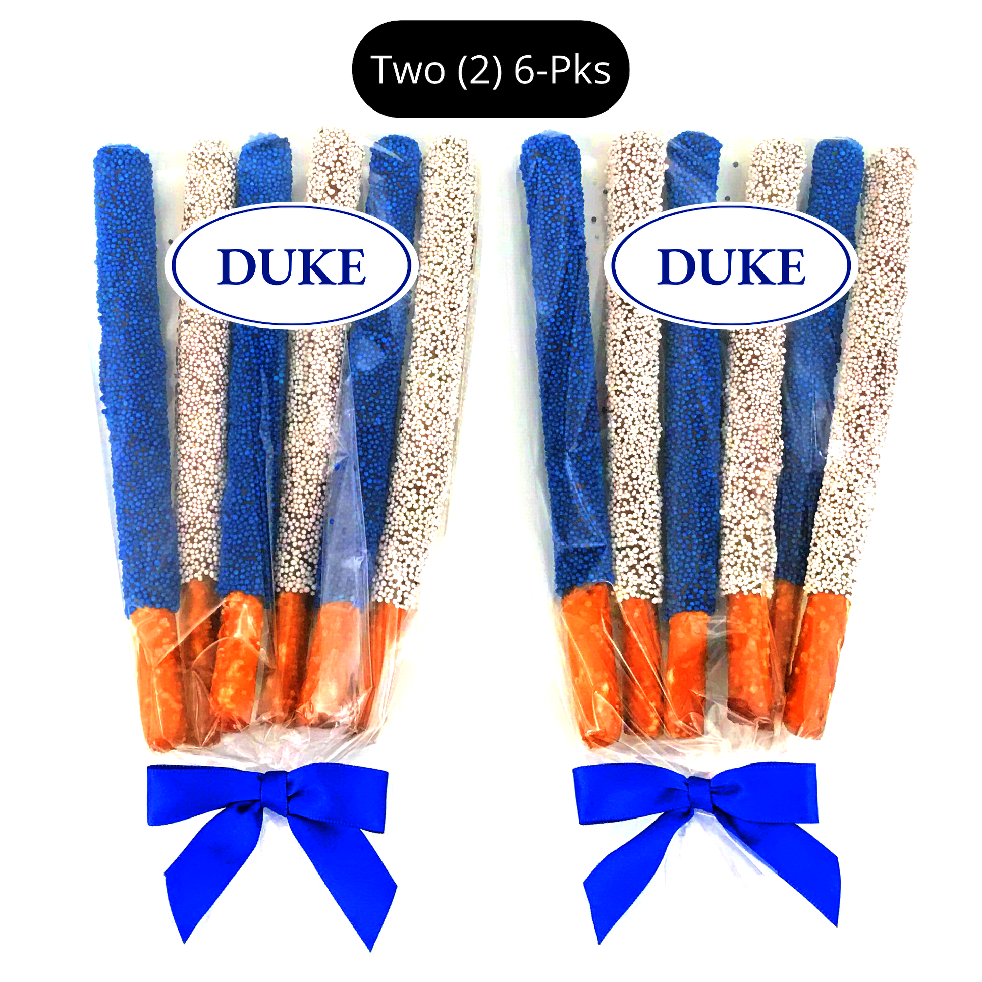 GO DUKE! These yummy chocolate pretzel rods are topped with Duke University colored sprinkles. These are the perfect sweet and salty treat and make a wonderful college acceptance gift, college care package, gift for exams, graduation, any time, birthdays, sorority/fraternity gift, for a Duke alumni, or any Duke fan. Each order is beautifully packaged. (Exact packaging/bows may vary based on packaging product availability.)