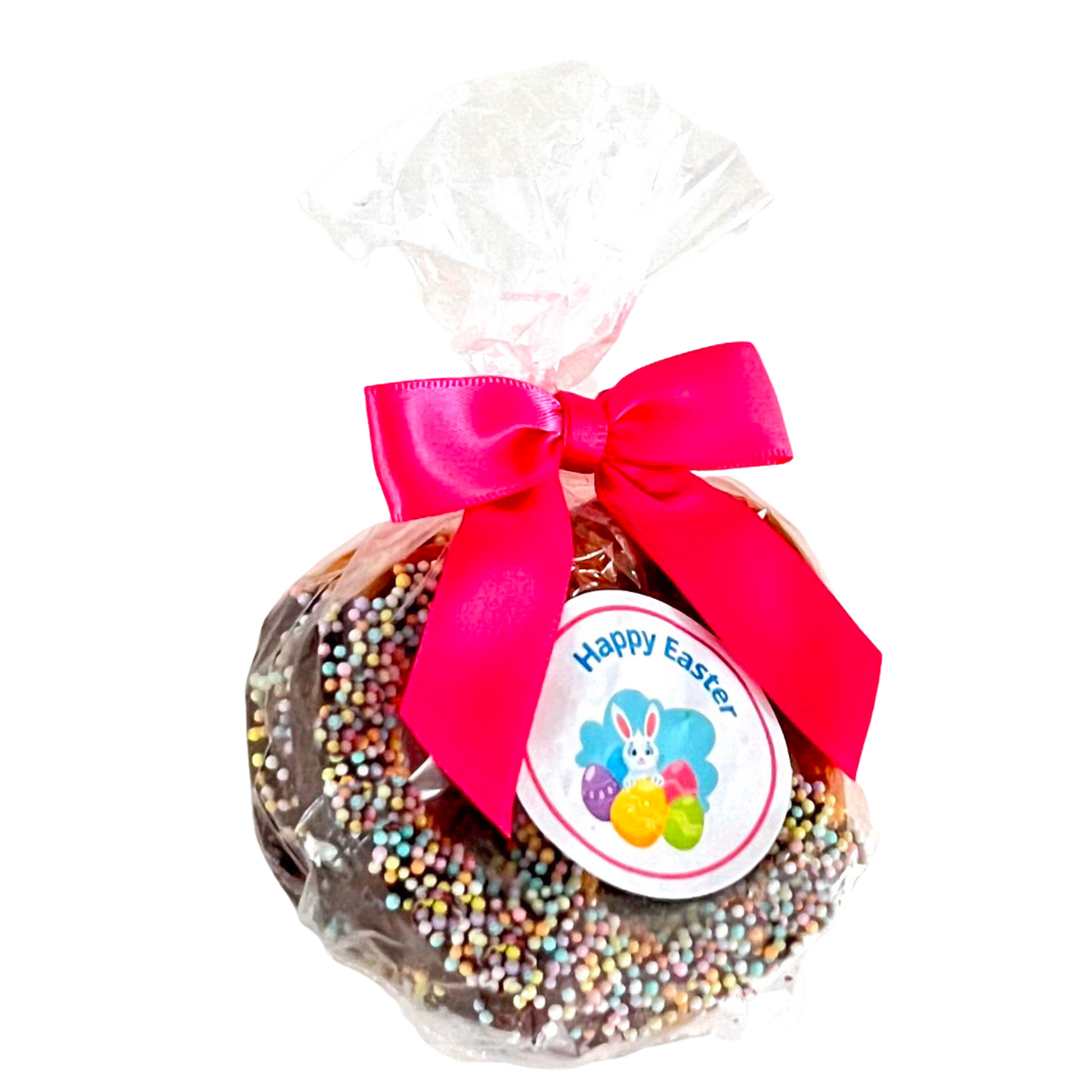Our beautiful Easter large 3" pretzels are dipped in chocolate and topped with pastel sprinkles. They are the perfect sweet and salty treat to add to your Easter basket. Each order is beautifully packaged - see additional pictures. Bows for packaging will vary between pink, blue, and white, based on availability.