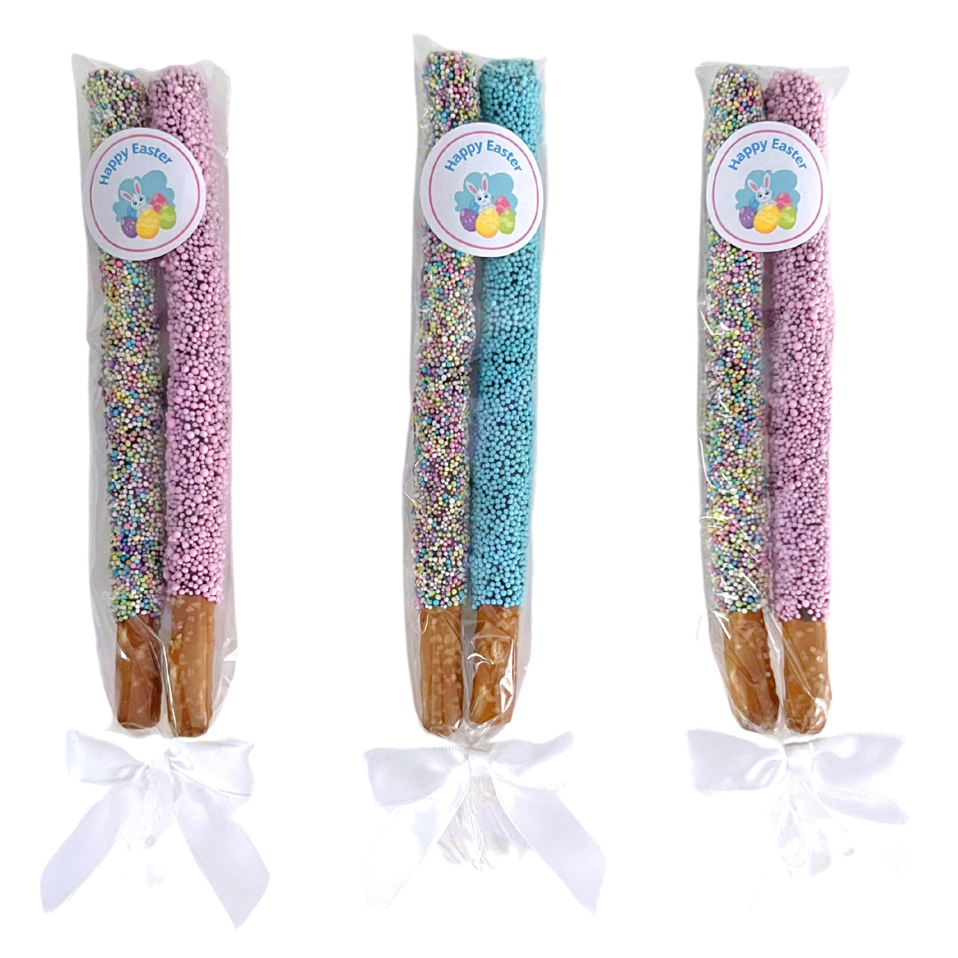- 1/2 Dozen Chocolate Covered Pretzel Rods: Three 2-Packs (as shown). Topped with Easter themed sprinkles. (Large: A full dozen Rods, Six 2-Packs.)