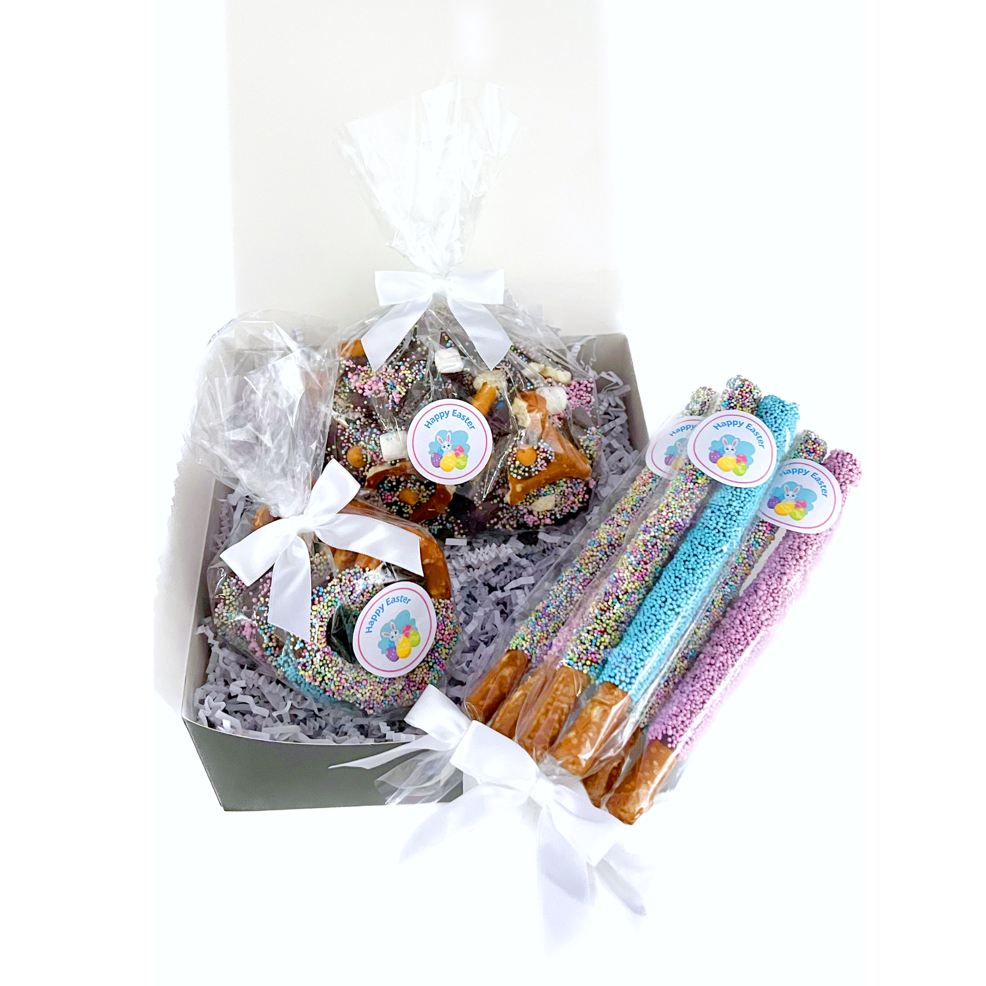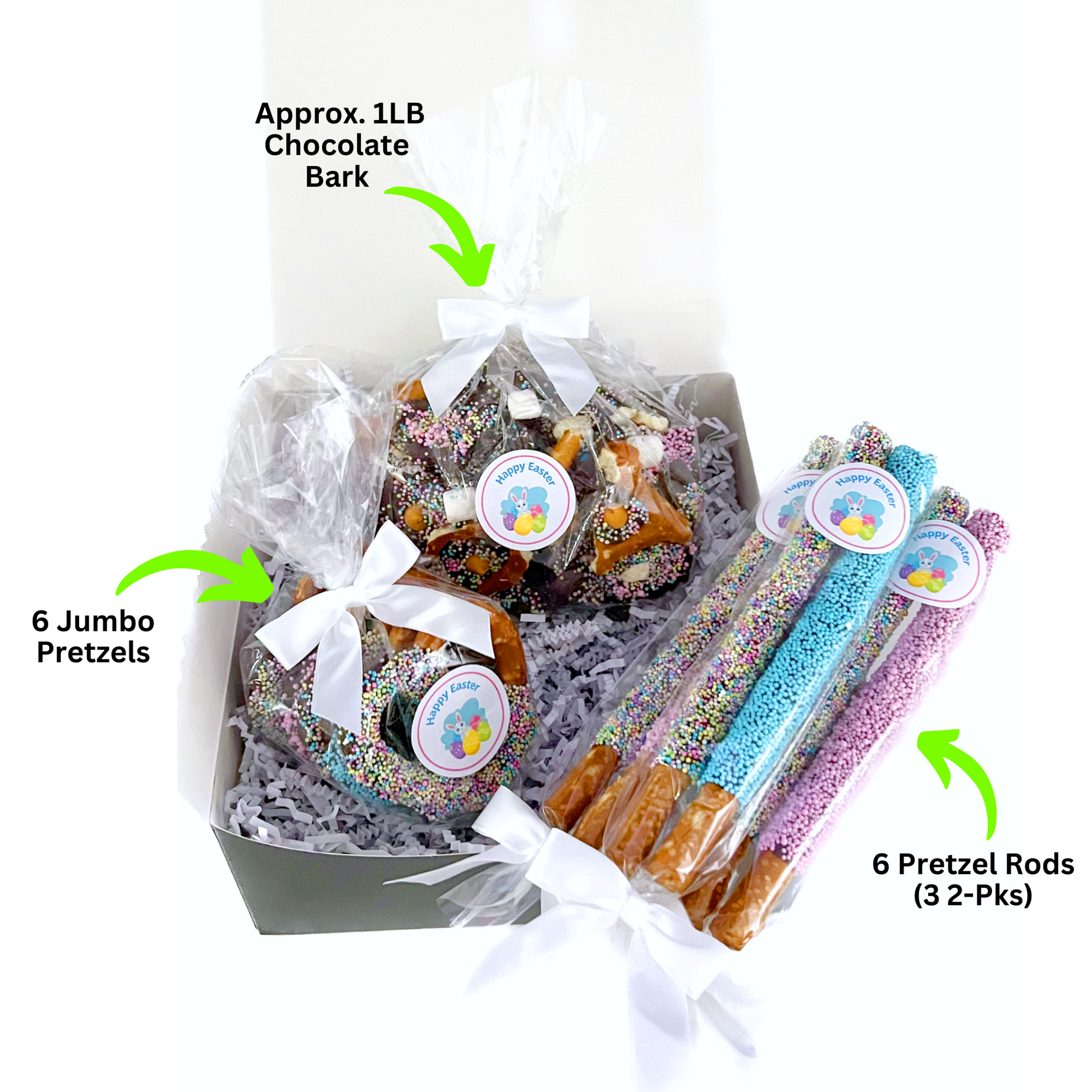 - 1/2 Dozen Chocolate Covered Jumbo 3" Pretzels: Topped with Easter themed sprinkles. (Large: A full dozen Jumbos.)