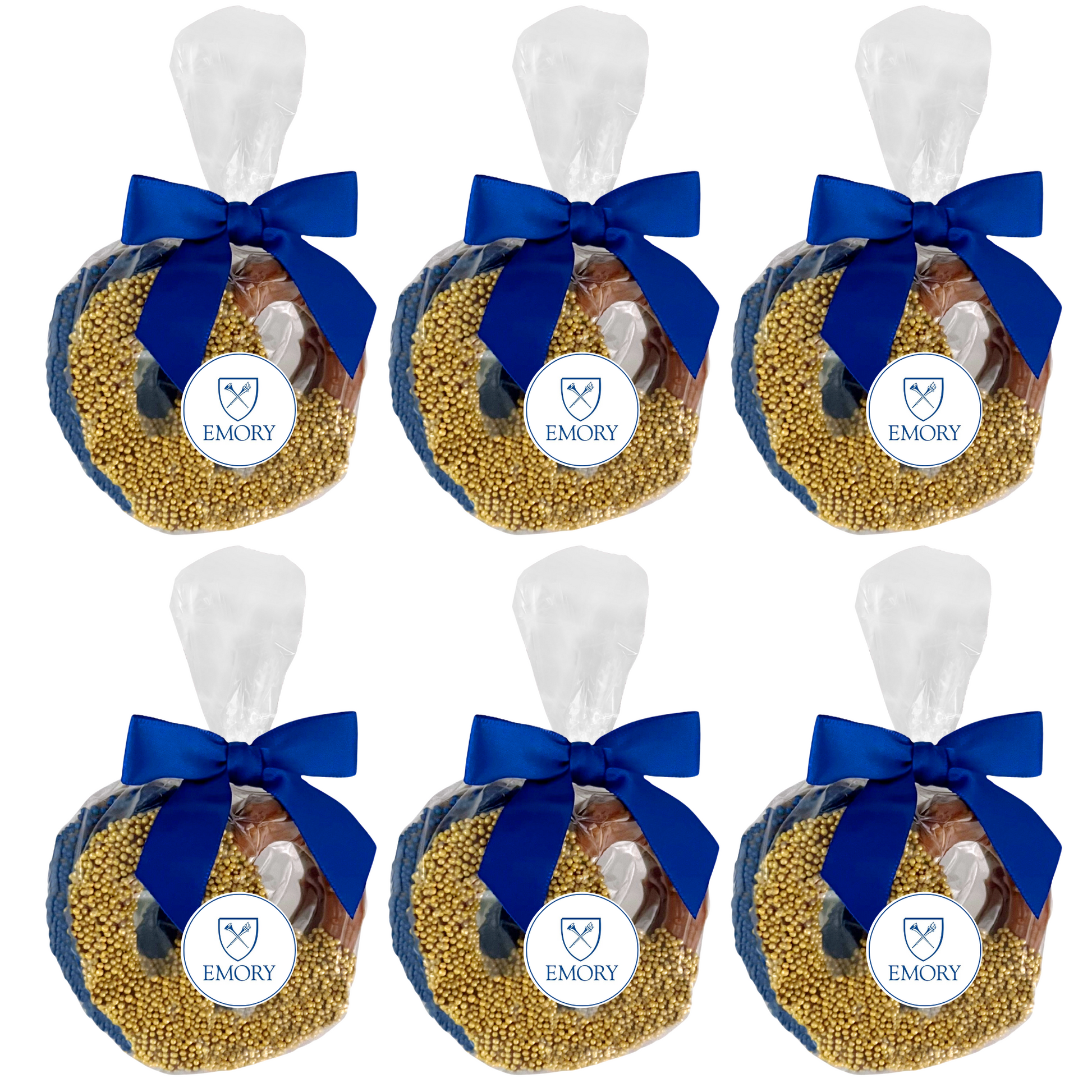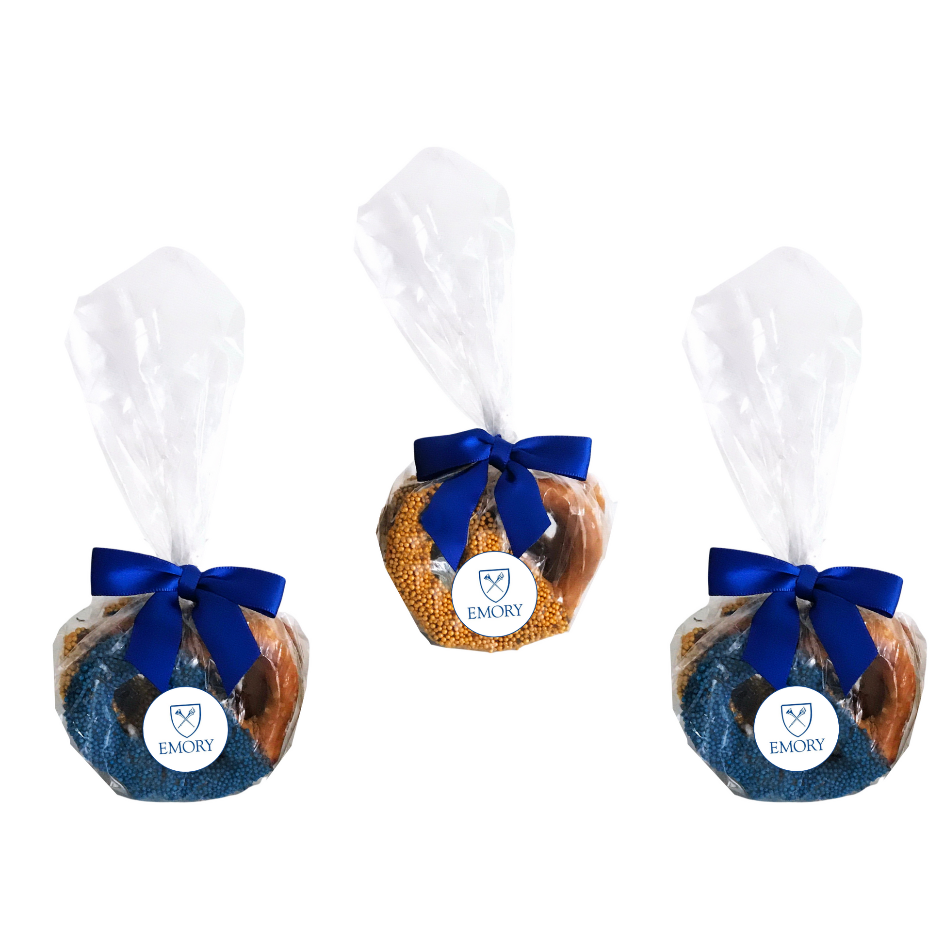 GO EAGLES! These yummy large 3" pretzels are dipped in chocolate and topped with Emory University colored sprinkles. These are the perfect sweet and salty treat and make a wonderful college care package/gift for exams, graduation, any time, birthdays, sorority/fraternity gift, for an Emory alumni, or any Emory fan. Each order is beautifully packaged. (Exact packaging may vary based on availability.)