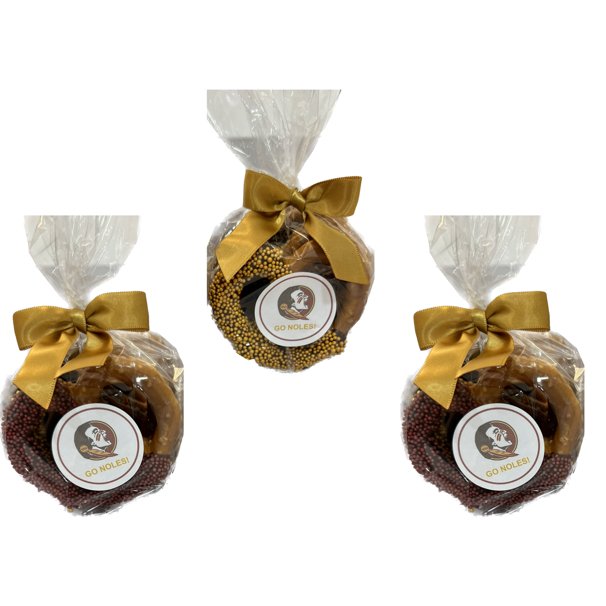 These yummy large 3" pretzels are dipped in chocolate and topped with Florida State University colored sprinkles. These are the perfect sweet and salty treat and make a wonderful college care package/gift for exams, graduation, any time, birthdays, sorority/fraternity gift, for an FSU alumni, or any FSU fan. Each order is beautifully packaged. (Exact packaging may vary based on availability.)