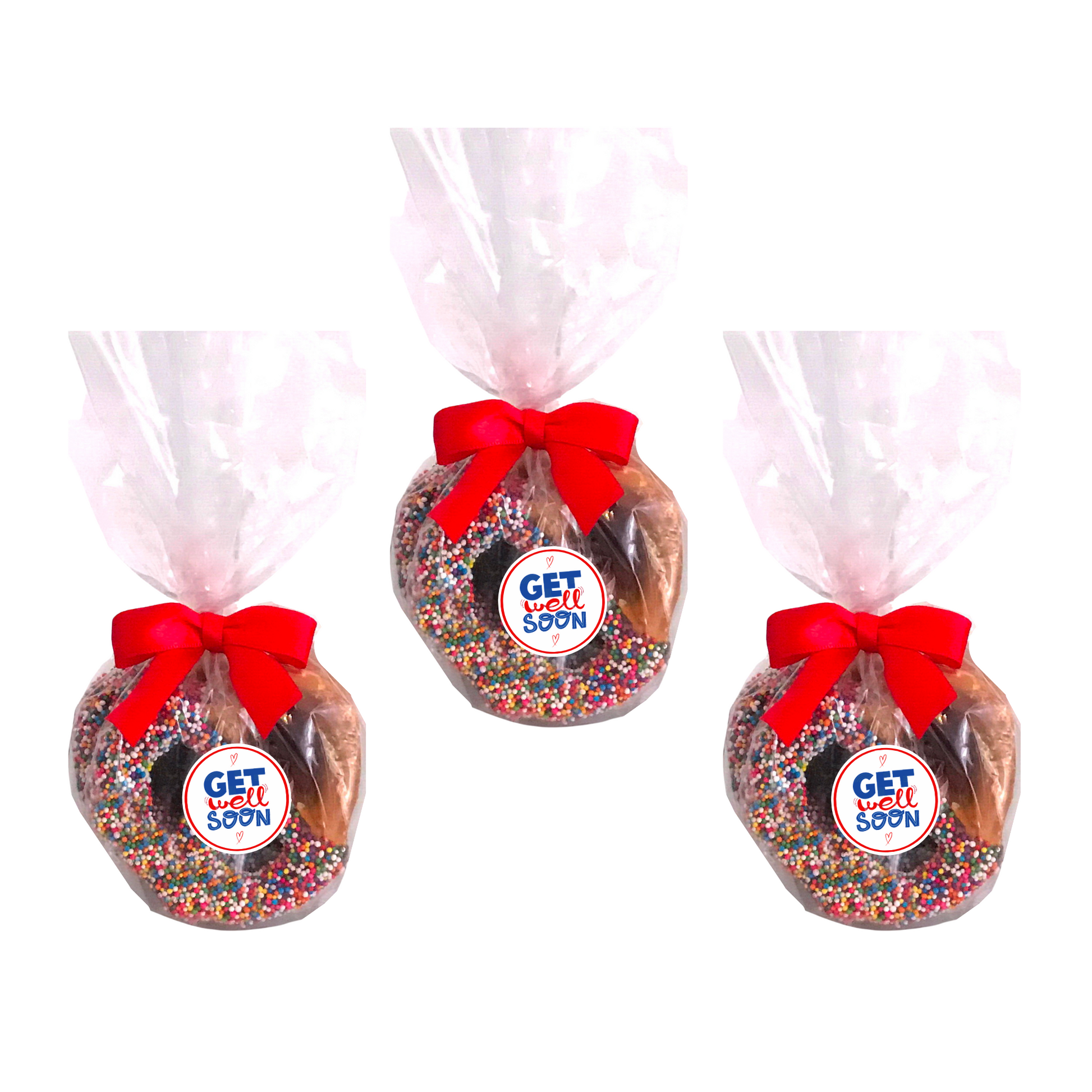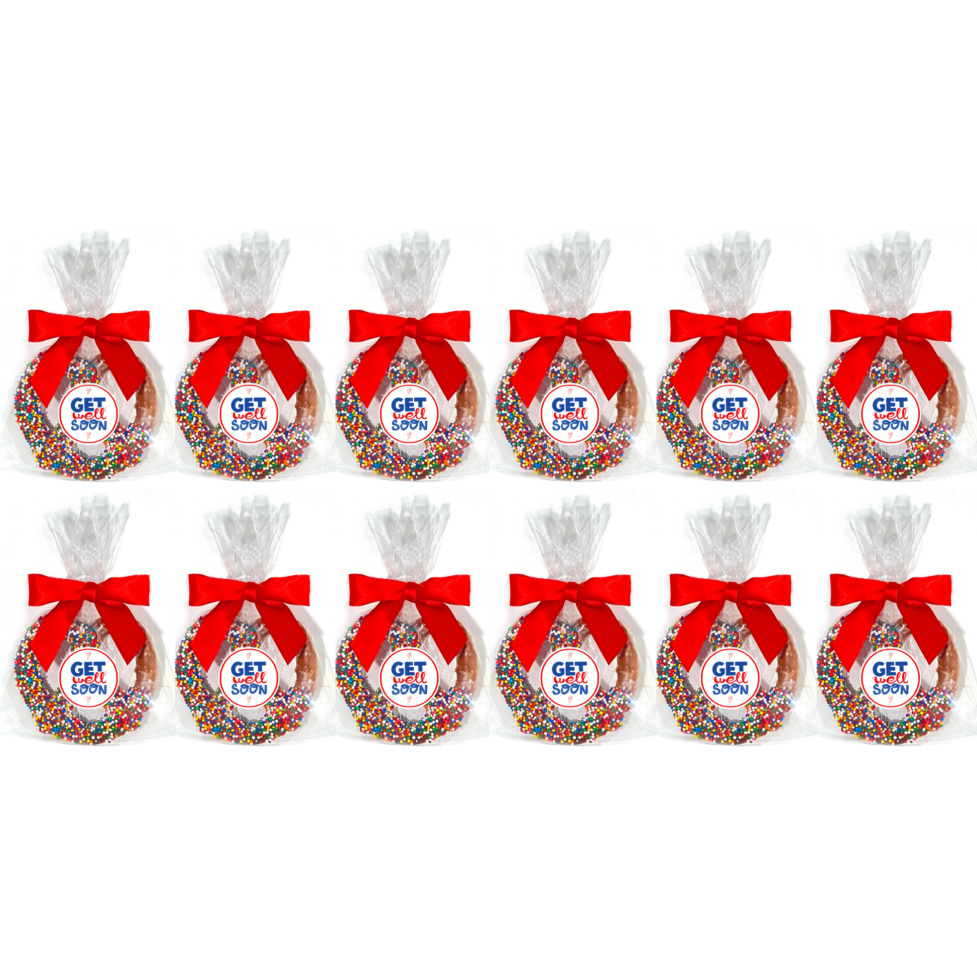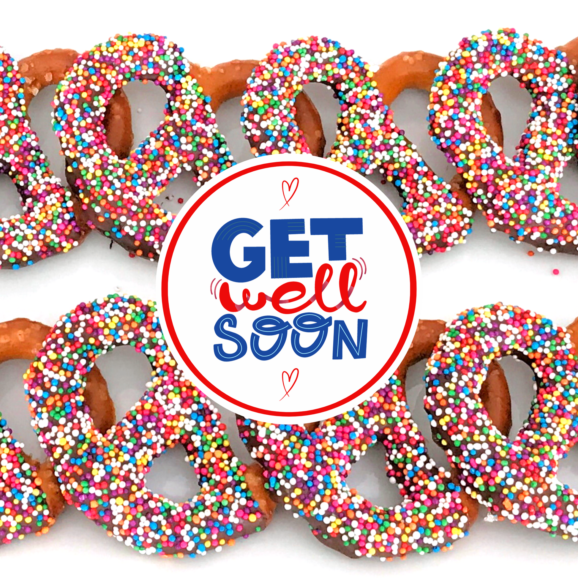 Send "Get Well" wishes to someone with our deliciously sweet and salty chocolate covered jumbo 3" pretzels topped with rainbow colored sprinkles, an adorable "Get Well" label, and coordinating bow. (Exact packaging may vary based on availability.)