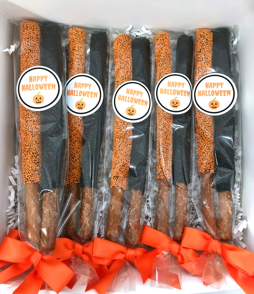 Spooky Halloween pretzel rods are dipped in delicious chocolate and topped with orange and black sprinkles. These are the perfect sweet and salty treats to celebrate Halloween. Each order is beautifully packaged.