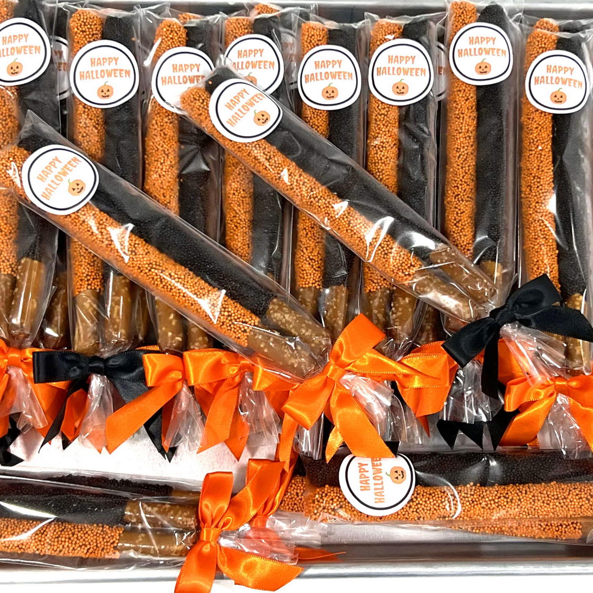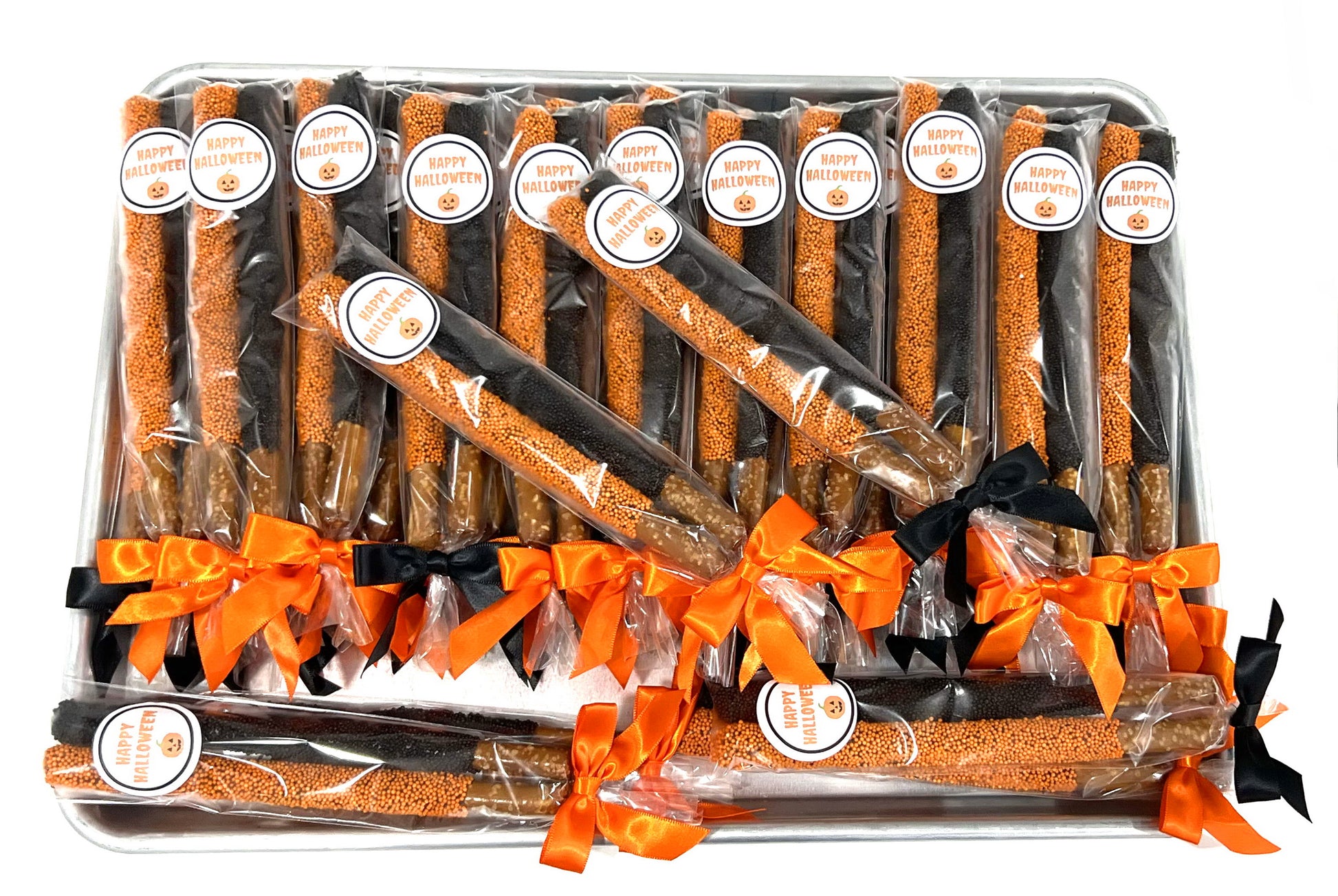 Spooky Halloween pretzel rods are dipped in delicious chocolate and topped with orange and black sprinkles. These are the perfect sweet and salty treats to celebrate Halloween. Each order is beautifully packaged.
