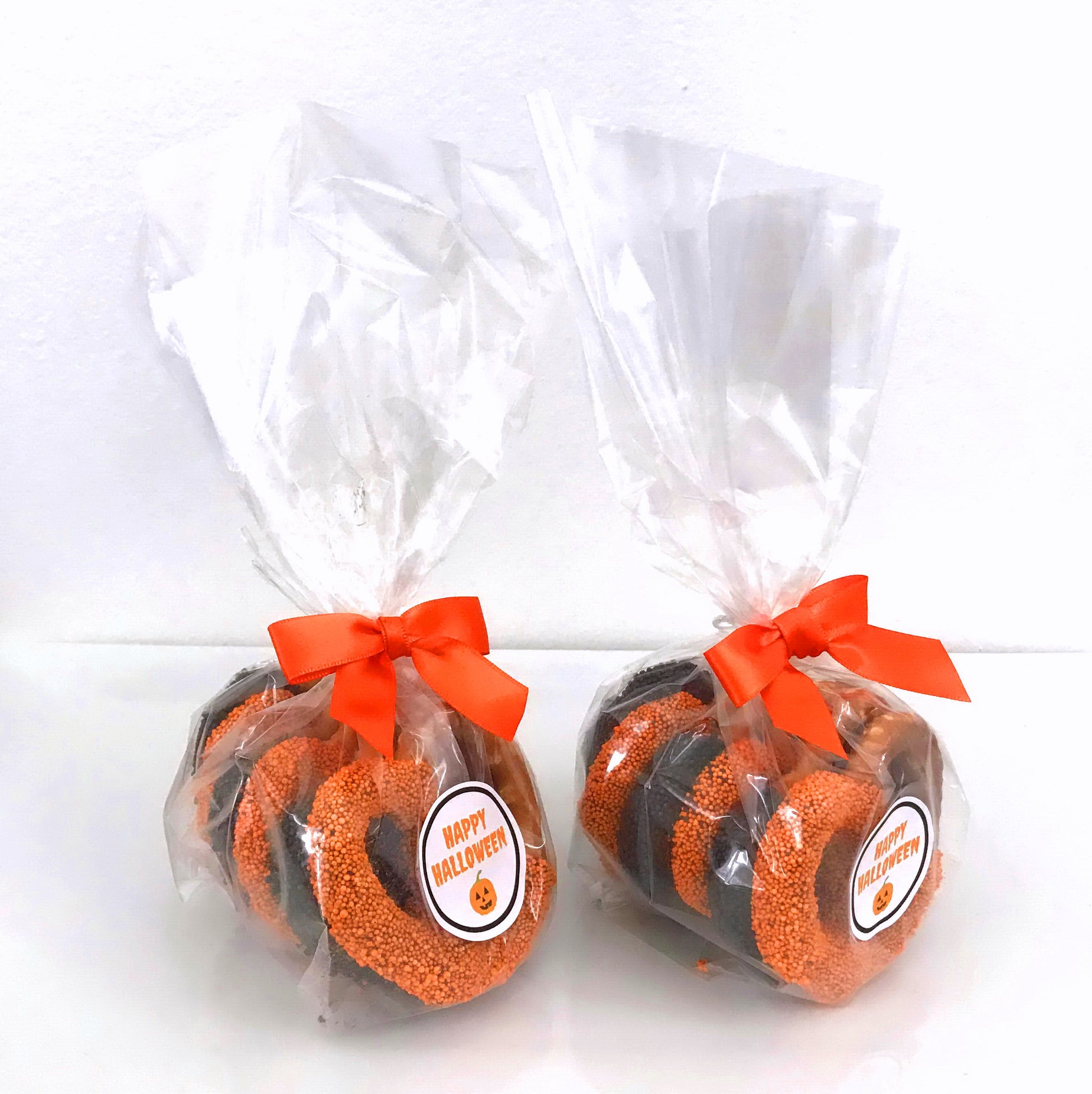 Halloween themed large 3" pretzels are dipped in chocolate and topped with orange and black sprinkles. They are the perfect sweet and salty treats to celebrate Halloween. Each order is beautifully packaged.