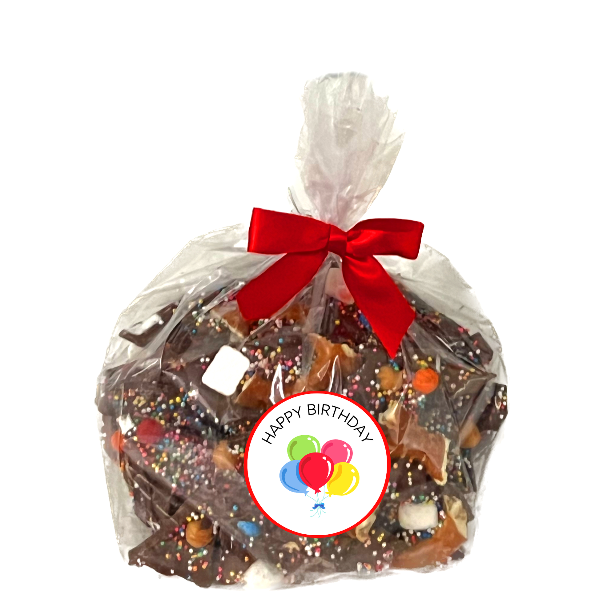 Celebrate someone's special day with our deliciously sweet and salty chocolate bark, which is big chunks of broken up chocolate and topped with pecans, pretzels, rainbow colored sprinkles as well as M&M's, marshmallows, and caramel. Adorable package includes a "Happy Birthday" label and coordinating bow.