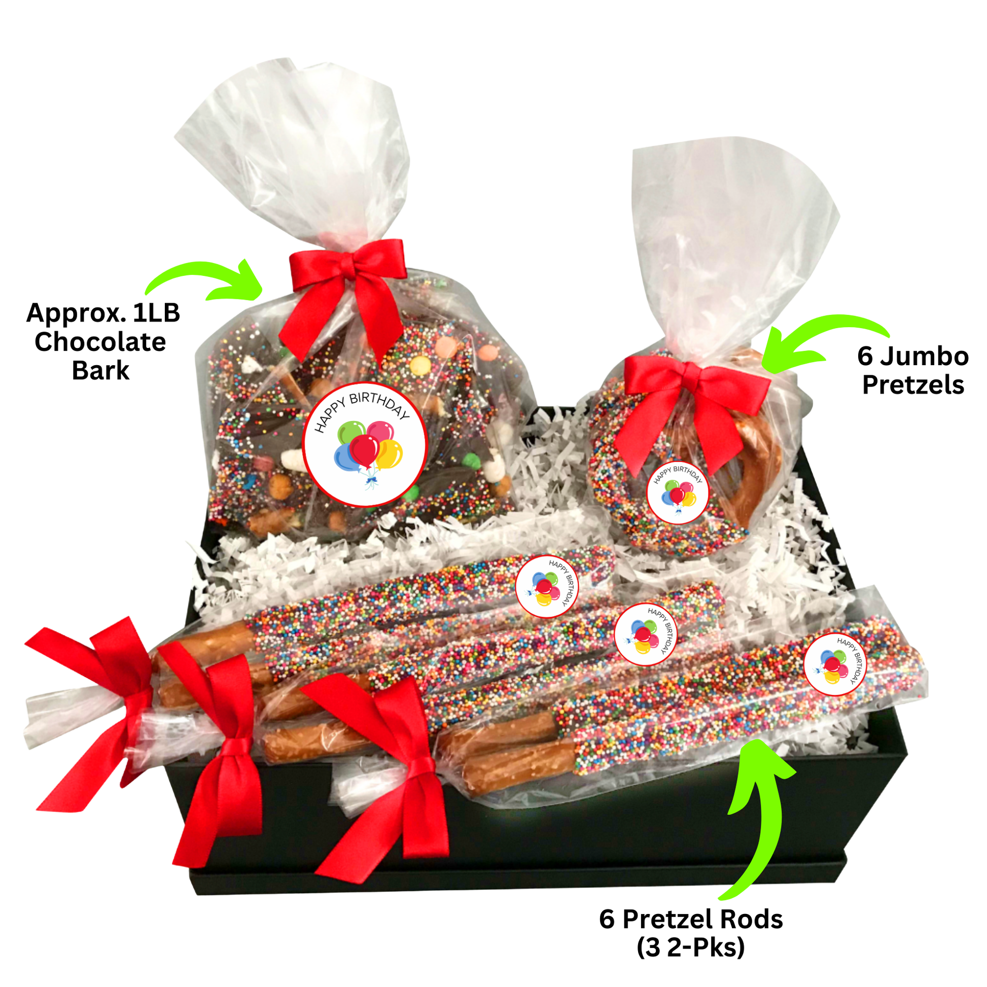 🎂 The perfect sweet & salty Happy Birthday Gift Box filled with a sampling of our most popular chocolate pretzels and chocolate bark — a delicious mix of three customer favorites. Beautifully packaged and ready to gift to someone special. Exact toppings and packaging may vary based on availability.