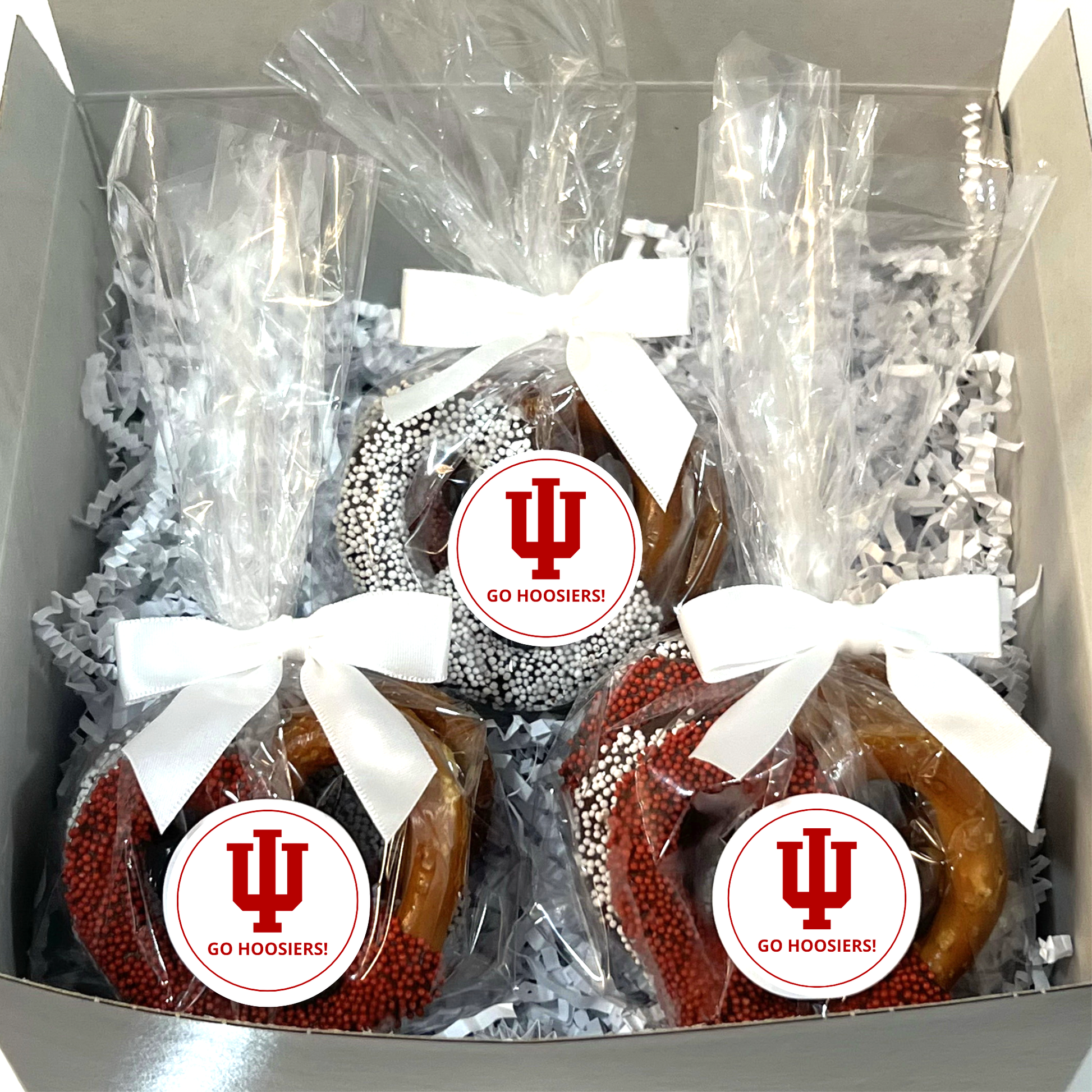 GO HOOSIERS! These yummy large 3" pretzels are dipped in chocolate and topped with Indiana University colored sprinkles. They are the perfect sweet and salty treat and make a wonderful college care package/gift for exams, graduation, any time, birthdays, sorority/fraternity gift, for an IU alumni, or any IU fan. Each order is beautifully packaged. (Exact packaging may vary based on availability.)
