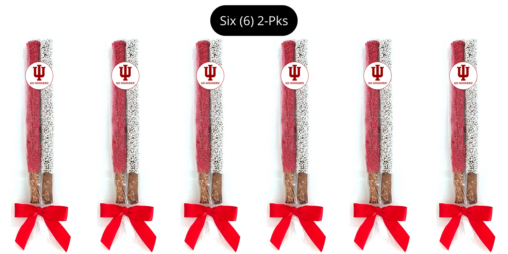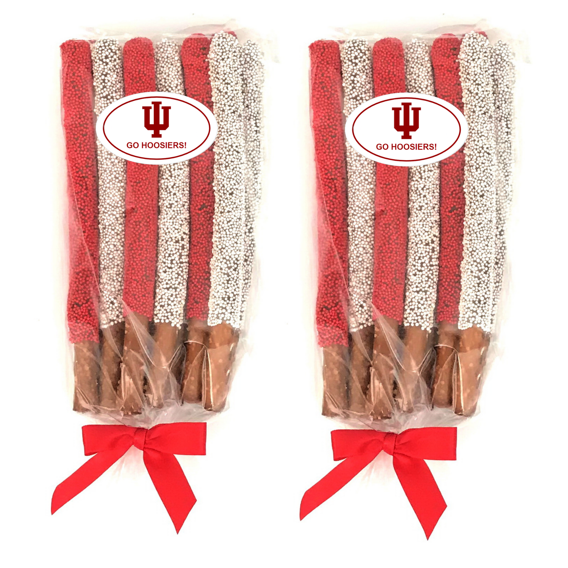 GO HOOSIERS! These yummy chocolate pretzel rods are topped with Indiana University colored sprinkles. These are the perfect sweet and salty treat and make a wonderful college care package/gift for exams, graduation, any time, birthdays, sorority/fraternity gift, for a IU alumni, or any IU fan. Each order is beautifully packaged. (Exact packaging may vary based on packaging product availability.)
