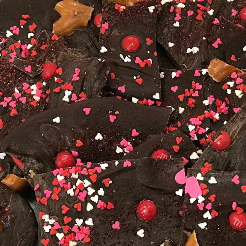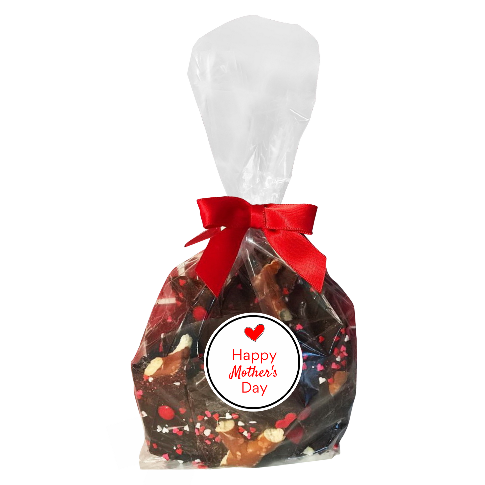 Yummy Mother's Day Chocolate Bark is big chunks of broken up chocolate that are topped with pretzels, heart sprinkles, red M&M's, marshmallows, and caramel, along with an adorable "Happy Mother's Day" label. This is a perfect sweet and salty treat to spoil all the mom's in your life - your mom, grandmothers, sisters, aunts, cousins, and friends. Each order is beautifully packaged - see additional pictures. (Exact packaging may vary based on availability.)