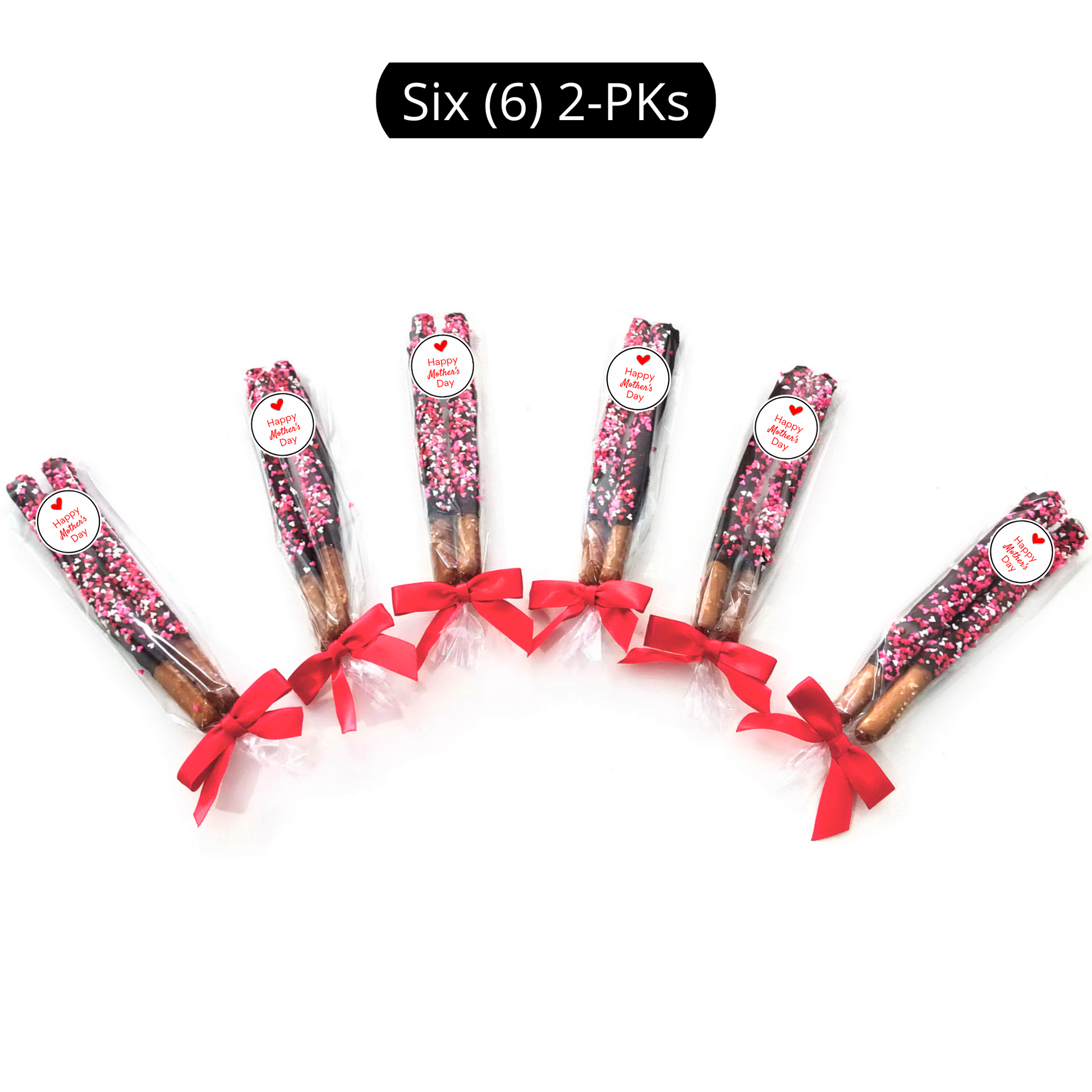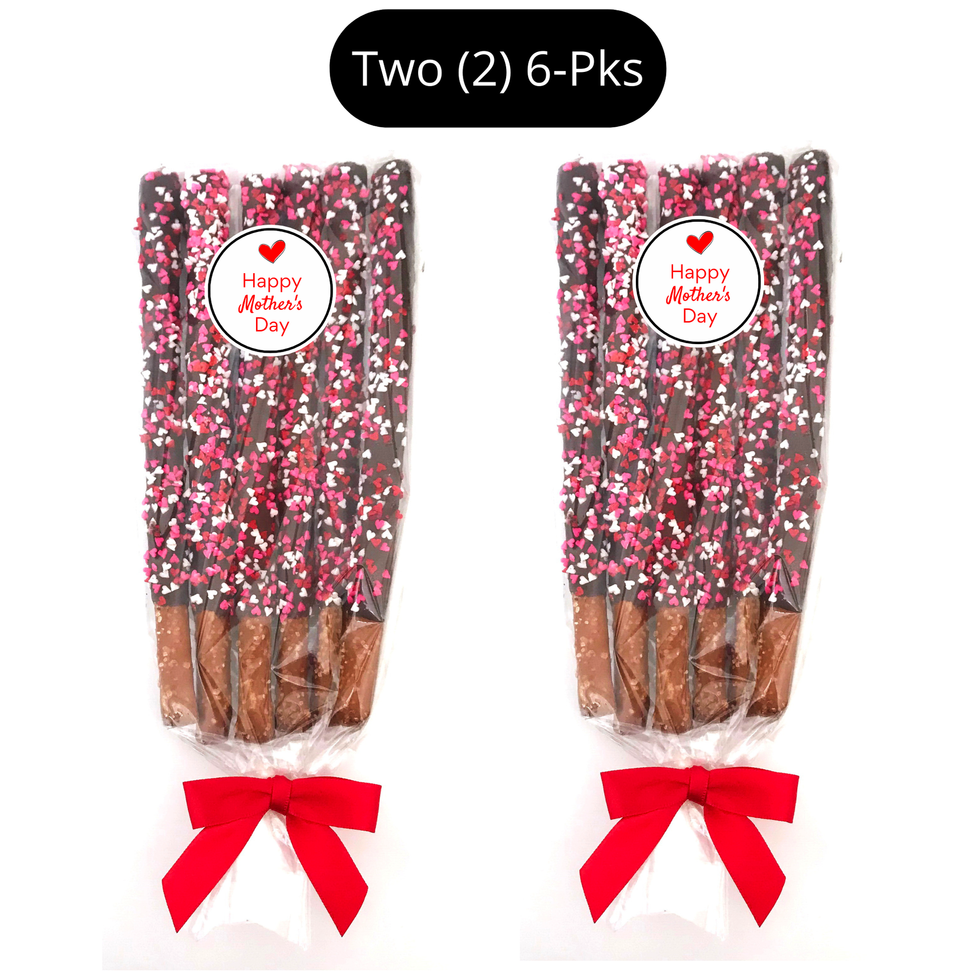 Yummy Mother's Day theme pretzel rods are dipped in delicious chocolate and topped with tiny edible hearts along with an adorable "Happy Mother's Day" label. These are the perfect sweet and salty treat to spoil all the mom's in your life - your mom, grandmothers, sisters, aunts, cousins, and friends. Each order is beautifully packaged. (Exact packaging may vary based on availability.)