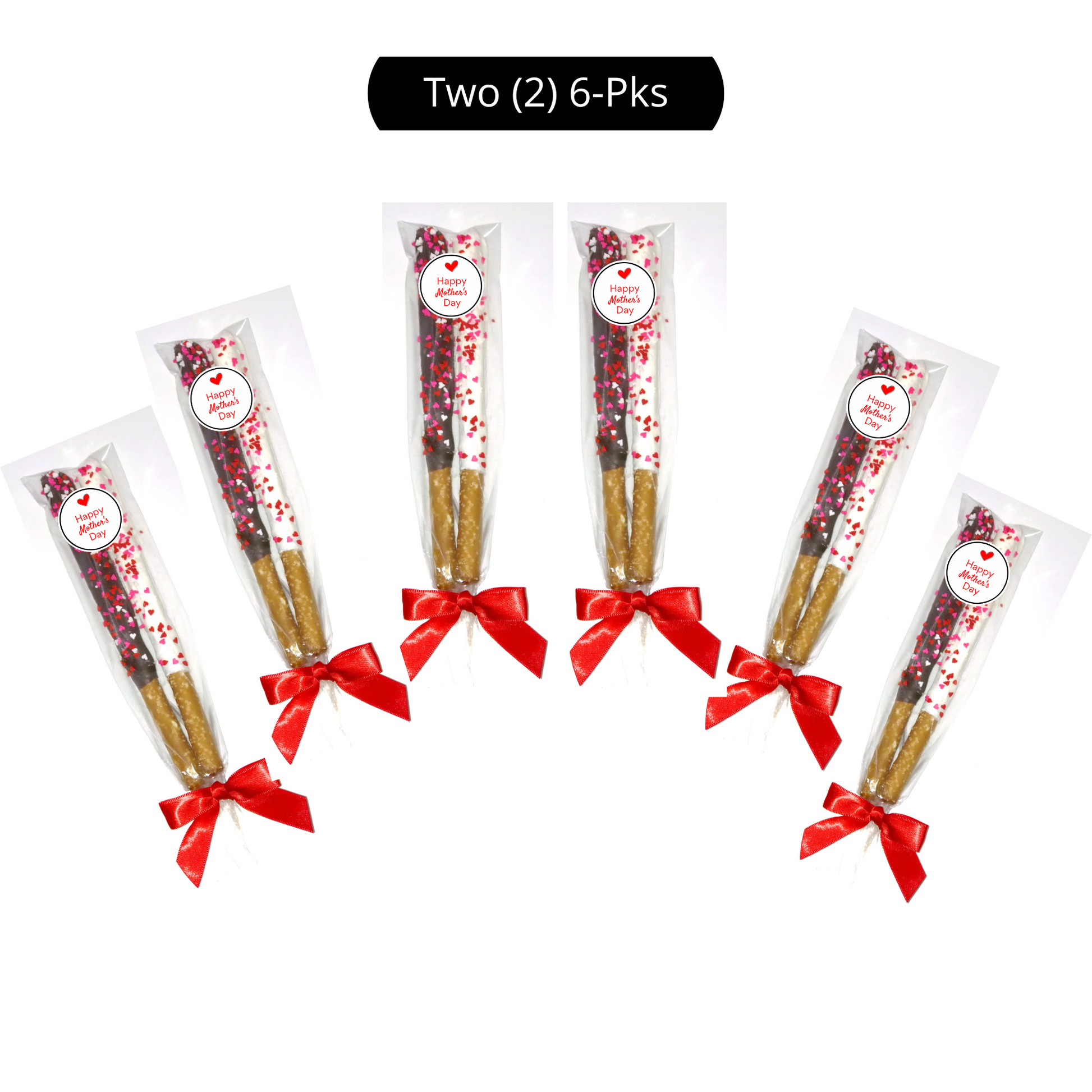 The best of both worlds is right here with this combo selection for Mother's Day! Includes: 6 pretzels dipped in delicious white chocolate and another 6 dipped in dark/milk chocolate (you choose), and then topped with tiny edible hearts along with an adorable "Happy Mother's Day" label. These are the perfect sweet and salty treat to spoil all the mom's in your life - your mom, grandmothers, sisters, aunts, cousins, and friends. Each order is beautifully packaged. (Exact packaging may vary based on availability.)
