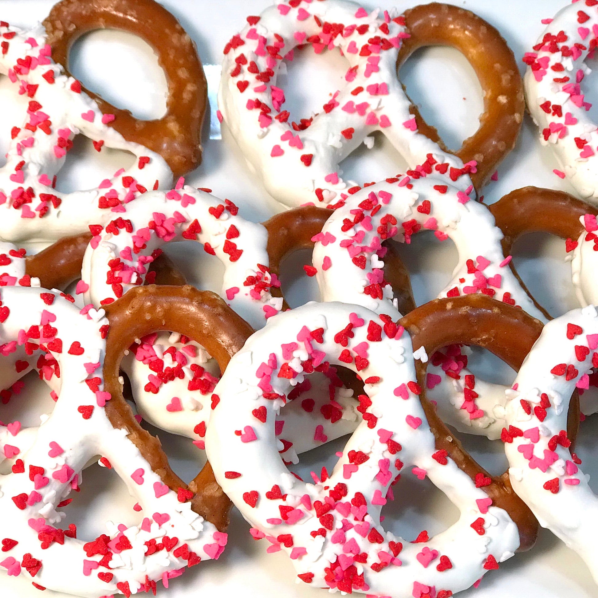 Mother's Day White Chocolate Covered Jumbo Pretzels with Heart Sprinkles