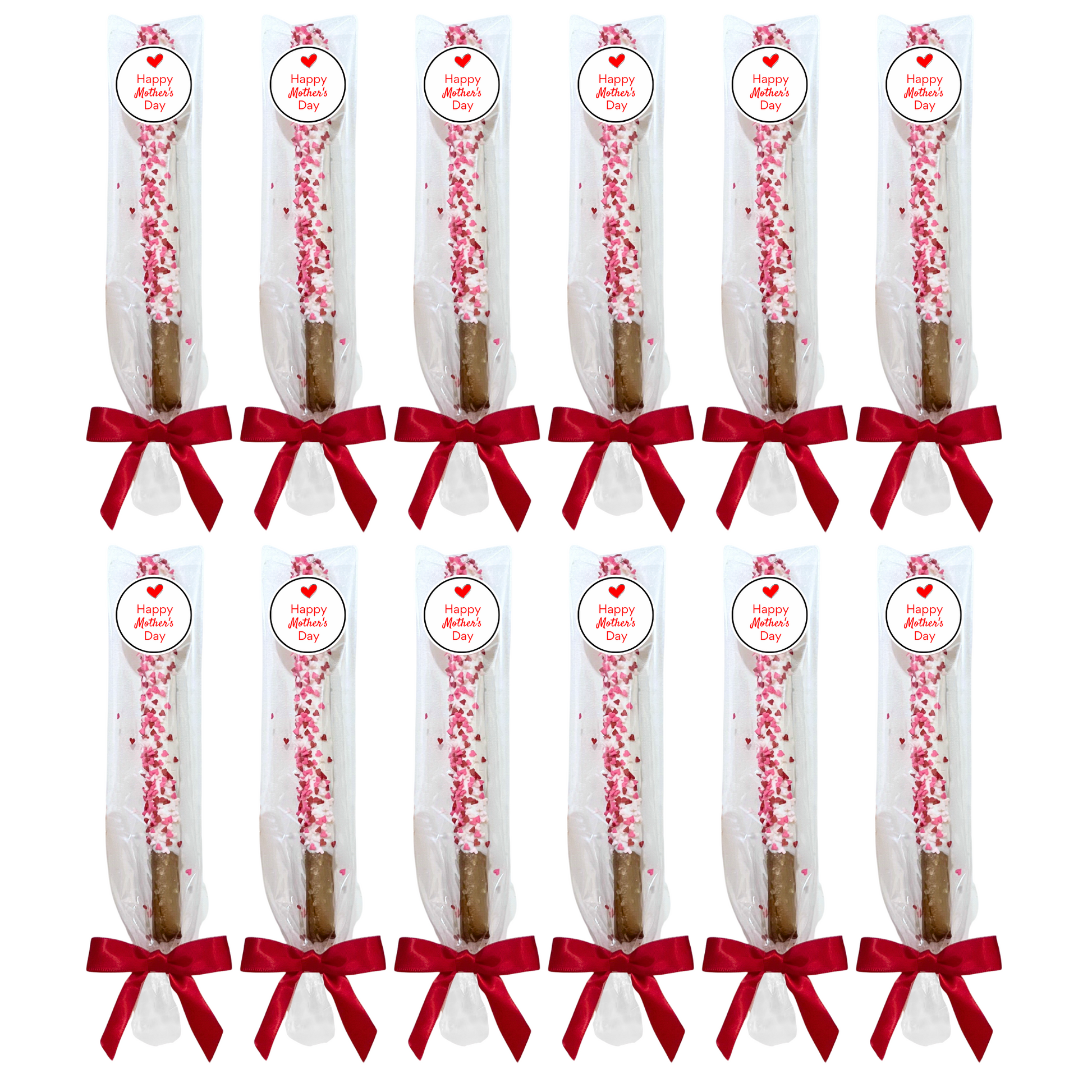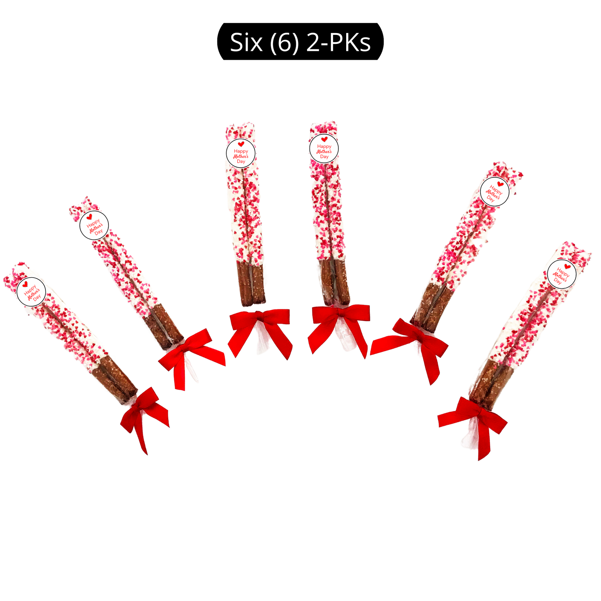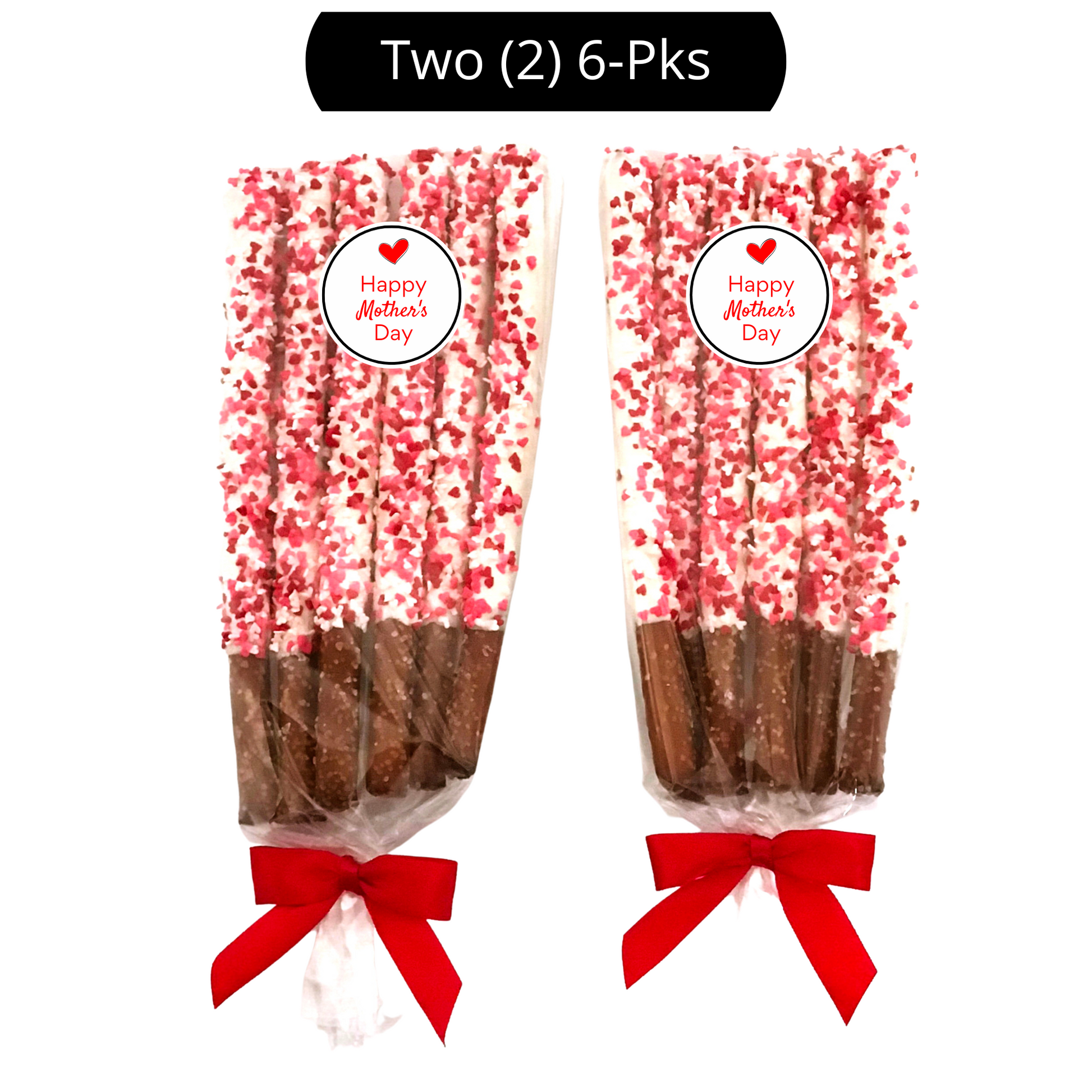 Yummy Mother's Day theme pretzel rods are dipped in delicious white chocolate and topped with tiny edible hearts along with an adorable "Happy Mother's Day" label. These are the perfect sweet and salty treat to spoil all the mom's in your life - your mom, grandmothers, sisters, aunts, cousins, and friends. Each order is beautifully packaged. (Exact packaging may vary based on availability.)