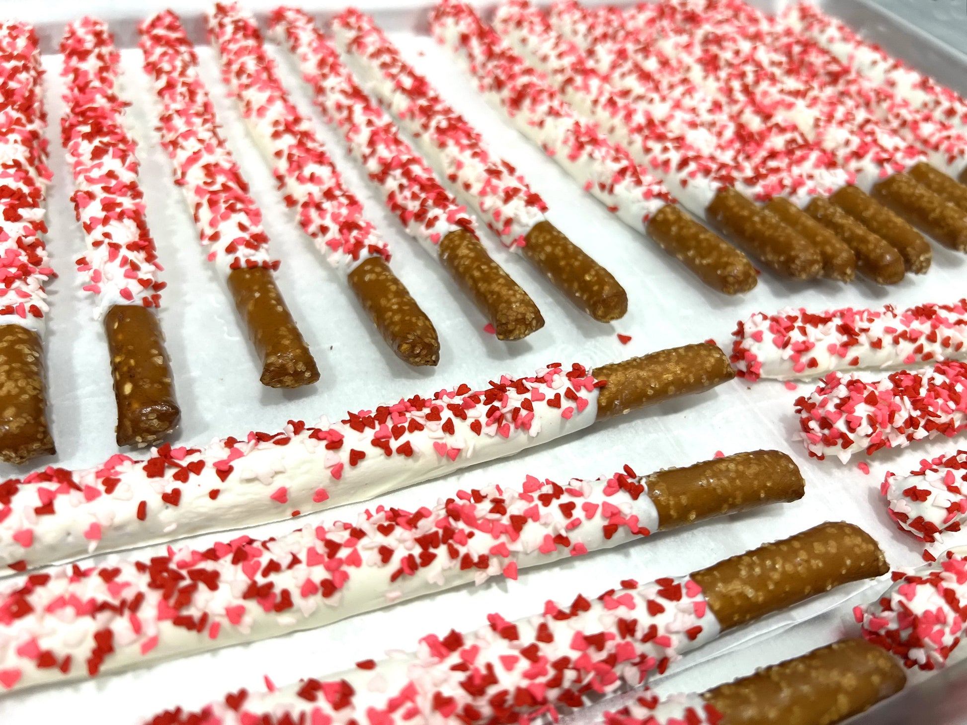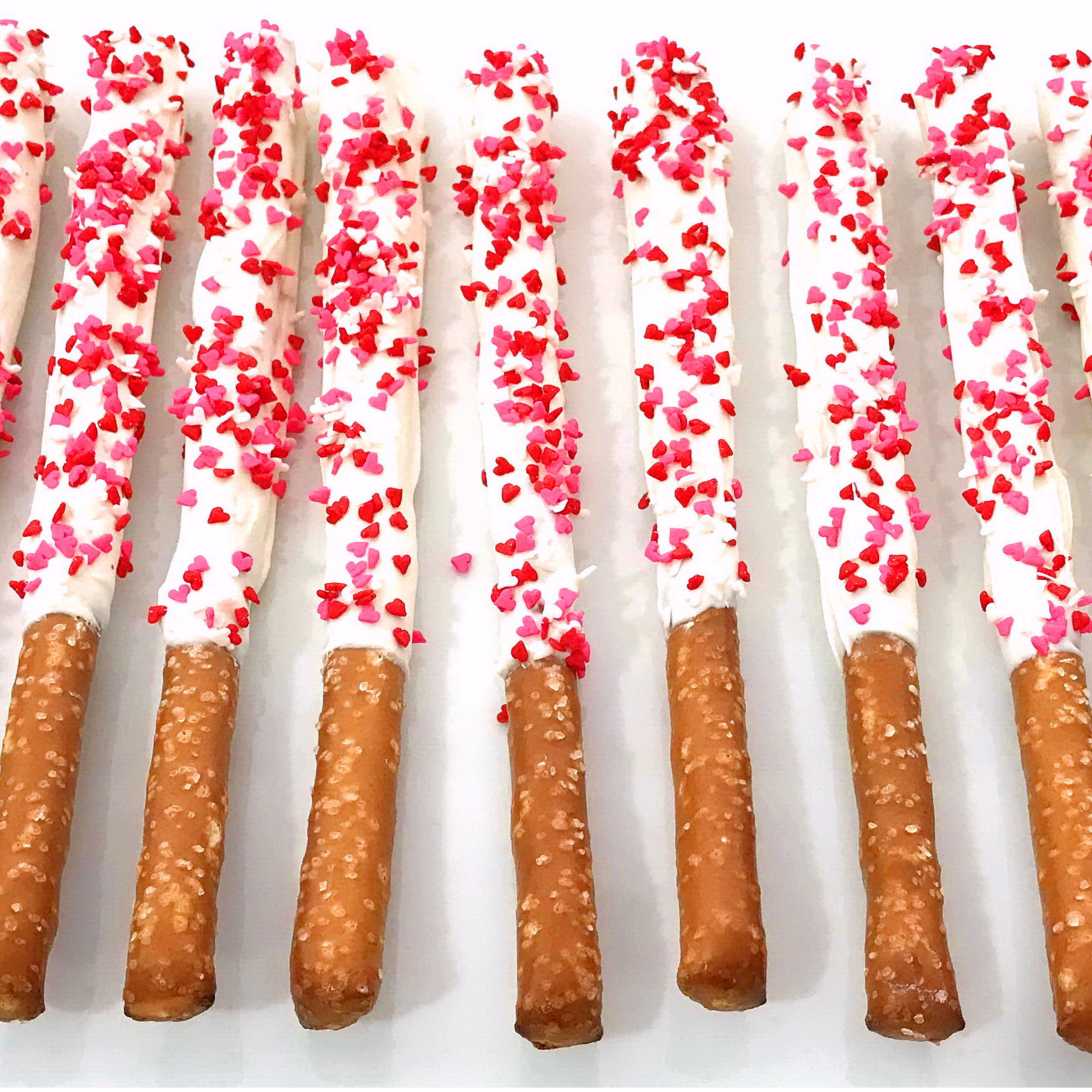 Mother's Day White Chocolate Pretzel Rods with Heart Sprinkles
