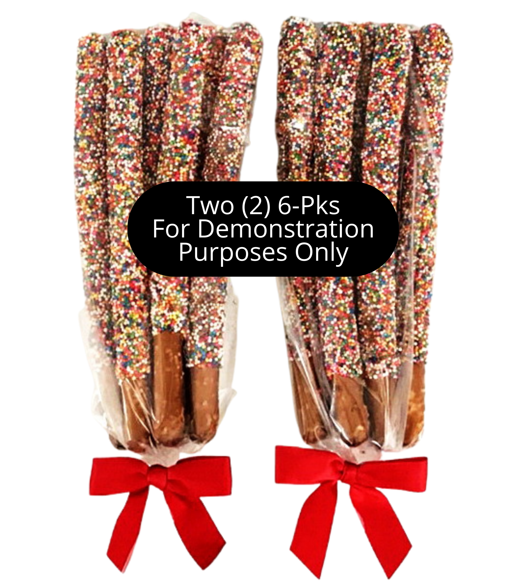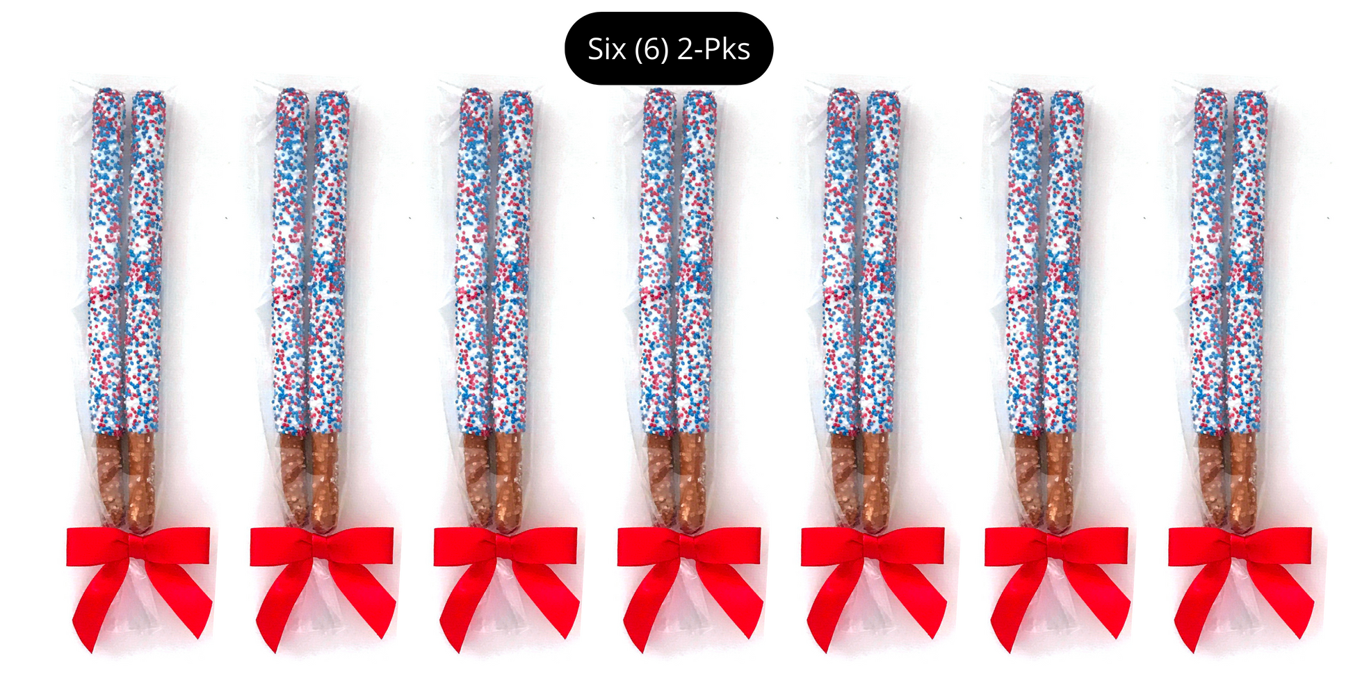 Wonderful for any patriotic celebration... Labor Day, July 4th, Election time, or whenever you're feeling patriotic! These yummy pretzel rods are dipped in chocolate and topped with red, white, and blue mixed sprinkles. They are the perfect sweet and salty treat to eat at home or give as a gift. Each order is beautifully packaged. (Exact packaging may vary based on availability.)