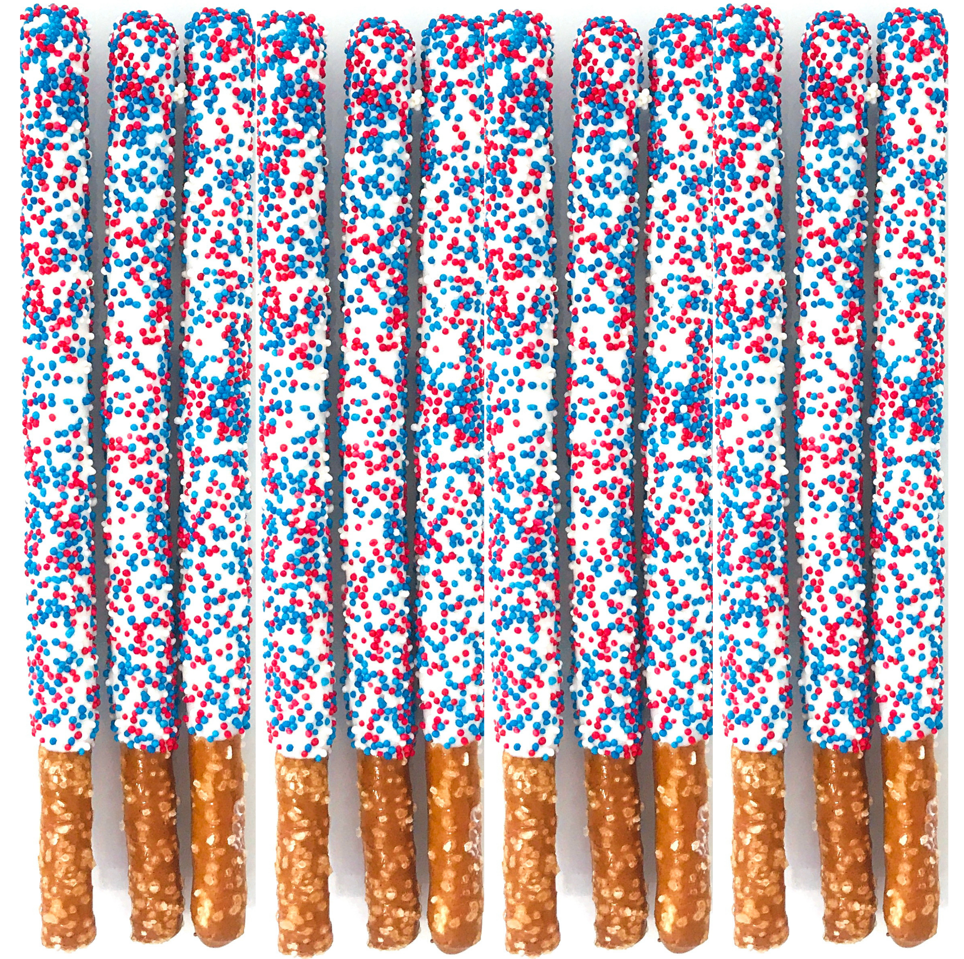 Patriotic White Chocolate Covered Pretzel Rods - Topped With Red, White, & Blue Mixed Sprinkles