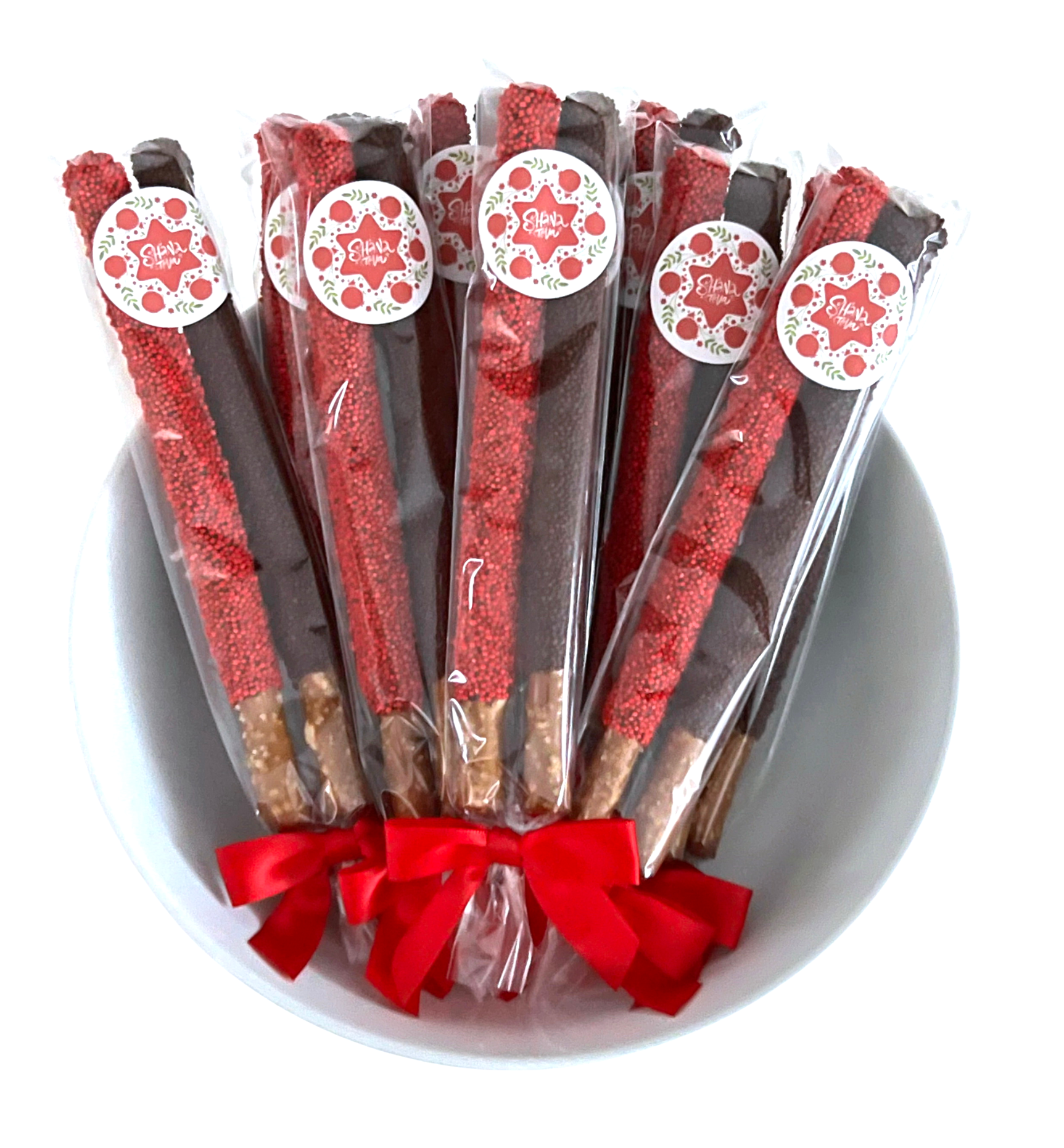 Celebrate Rosh Hashanah with these festive chocolate pretzel rods, dipped in rich chocolate and finished with red and brown sprinkles. Each set is adorned with an adorable "Shana Tova" sticker — a perfect gift for your host, or a sweet touch if you’re hosting yourself. (Exact packaging may vary based on availability.)