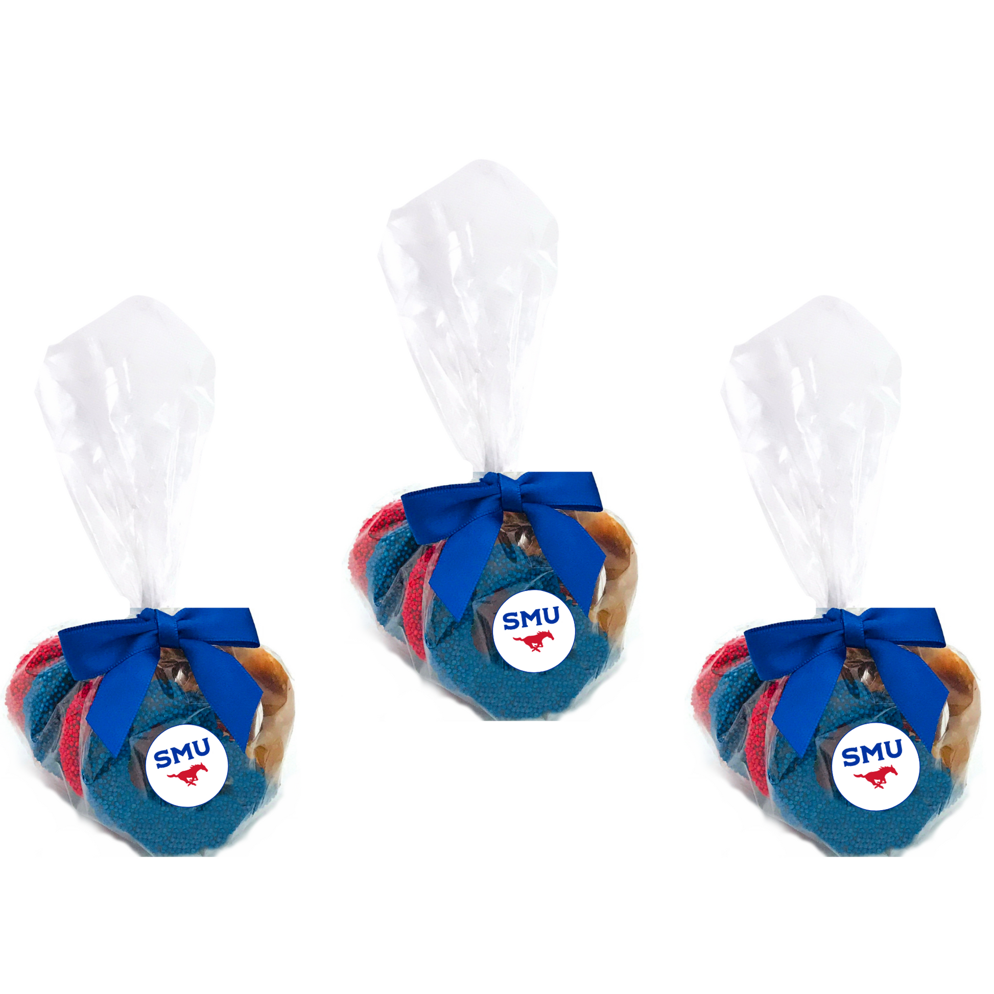 GO MUSTANGS! These yummy large 3" pretzels are dipped in chocolate and topped with Southern Methodist University colored sprinkles. These are the perfect sweet and salty treat and make a wonderful college care package/gift for exams, graduation, any time, birthdays, sorority/fraternity gift, for a SMU alumni, or any SMU fan. Each order is beautifully packaged. (Exact packaging may vary based on availability.)