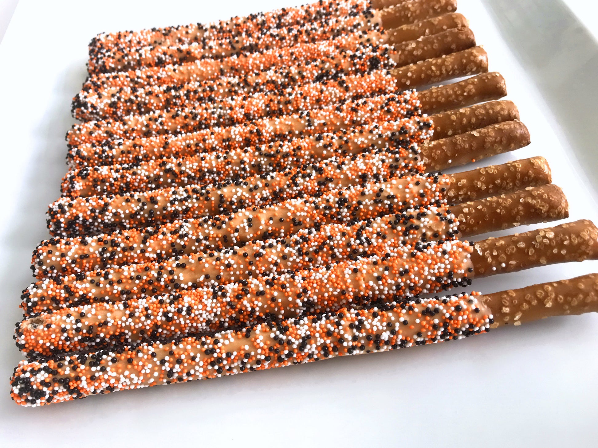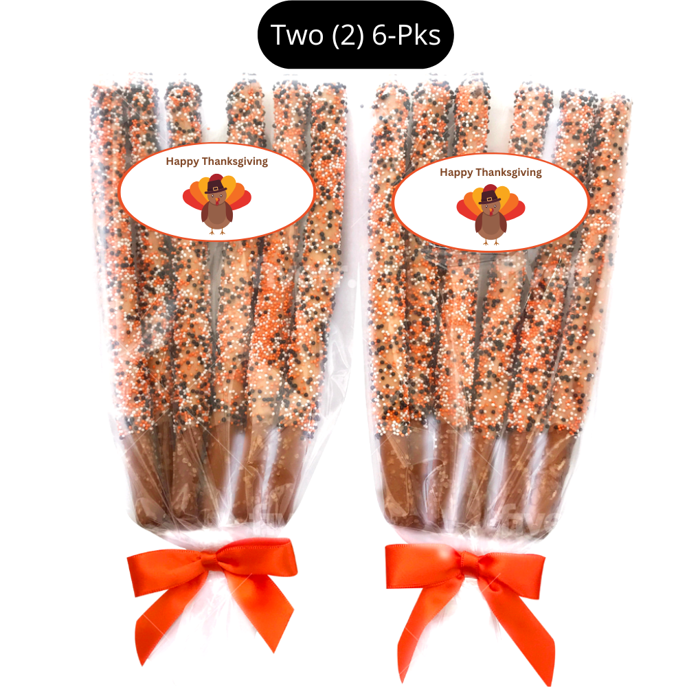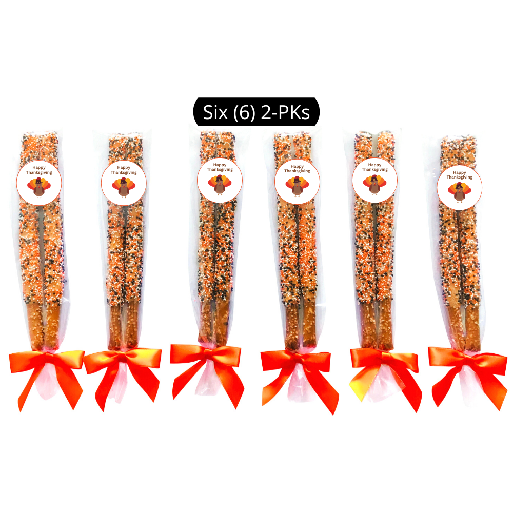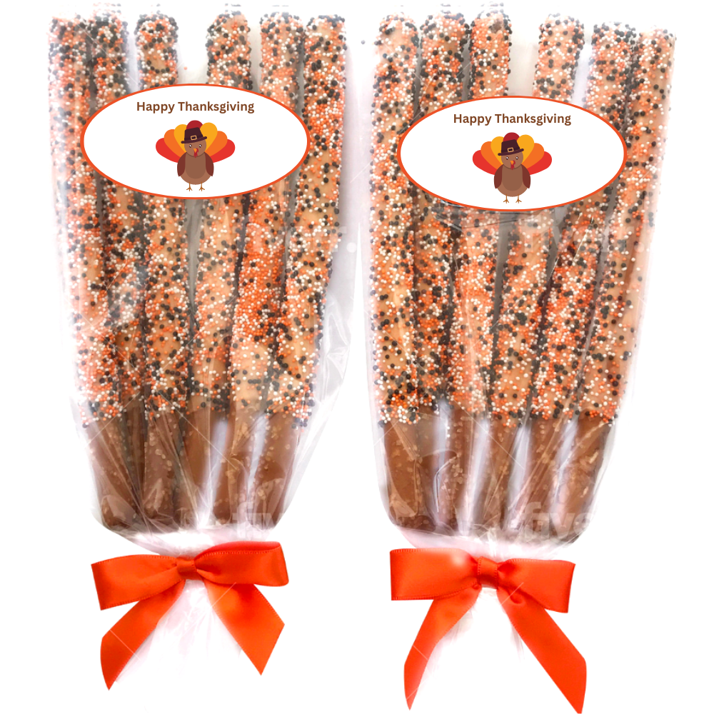 These delicious Pumpkin Spice Pretzel Rods are the perfect sweet and salty treat for the fall and Thanksgiving. They are topped with orange, black, and white sprinkles. Each order is beautifully packaged with an adorable "Happy Thanksgiving" label - see additional pictures. (Exact packaging may vary based on availability.)