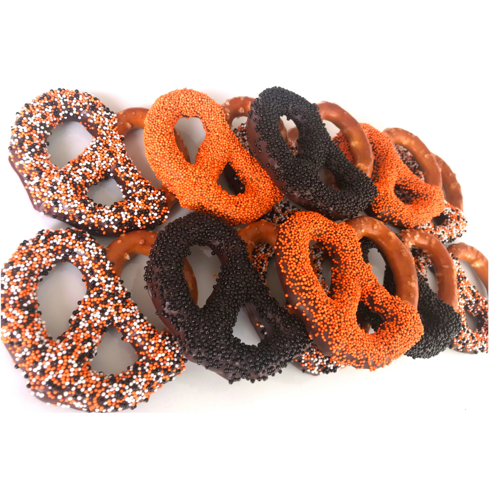 DeliciousĀ Thanksgiving Tri-Colored Chocolate Covered JumboĀ large 3" pretzels are topped with orange, black, and white sprinkles.Ā They are the perfect sweet and salty treats to celebrateĀ Thanksgiving.Ā Each order is beautifully packaged with an adorable "Happy Thanksgiving" label - see additional pictures. (Exact packaging may vary based on availability.)