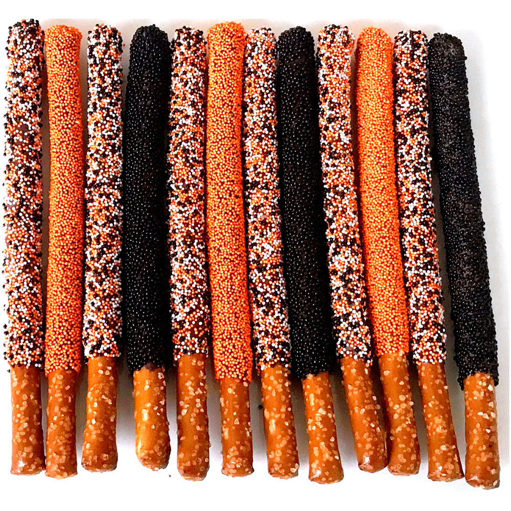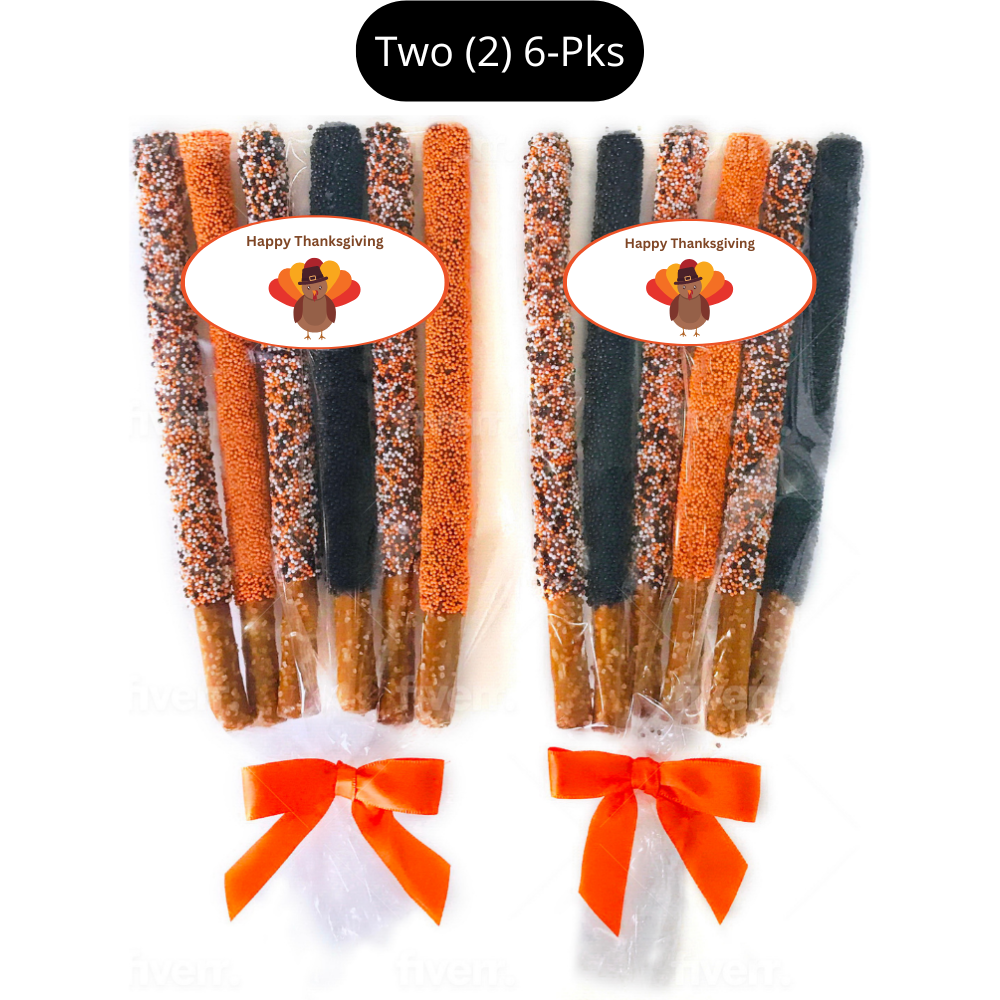 These delicious tri-colored pretzel rods are the perfect sweet and salty treat for the fall and Thanksgiving. They are topped with orange, black, and white sprinkles. Each order is beautifully packaged with an adorable "Happy Thanksgiving" label. (Exact packaging may vary based on availability.)