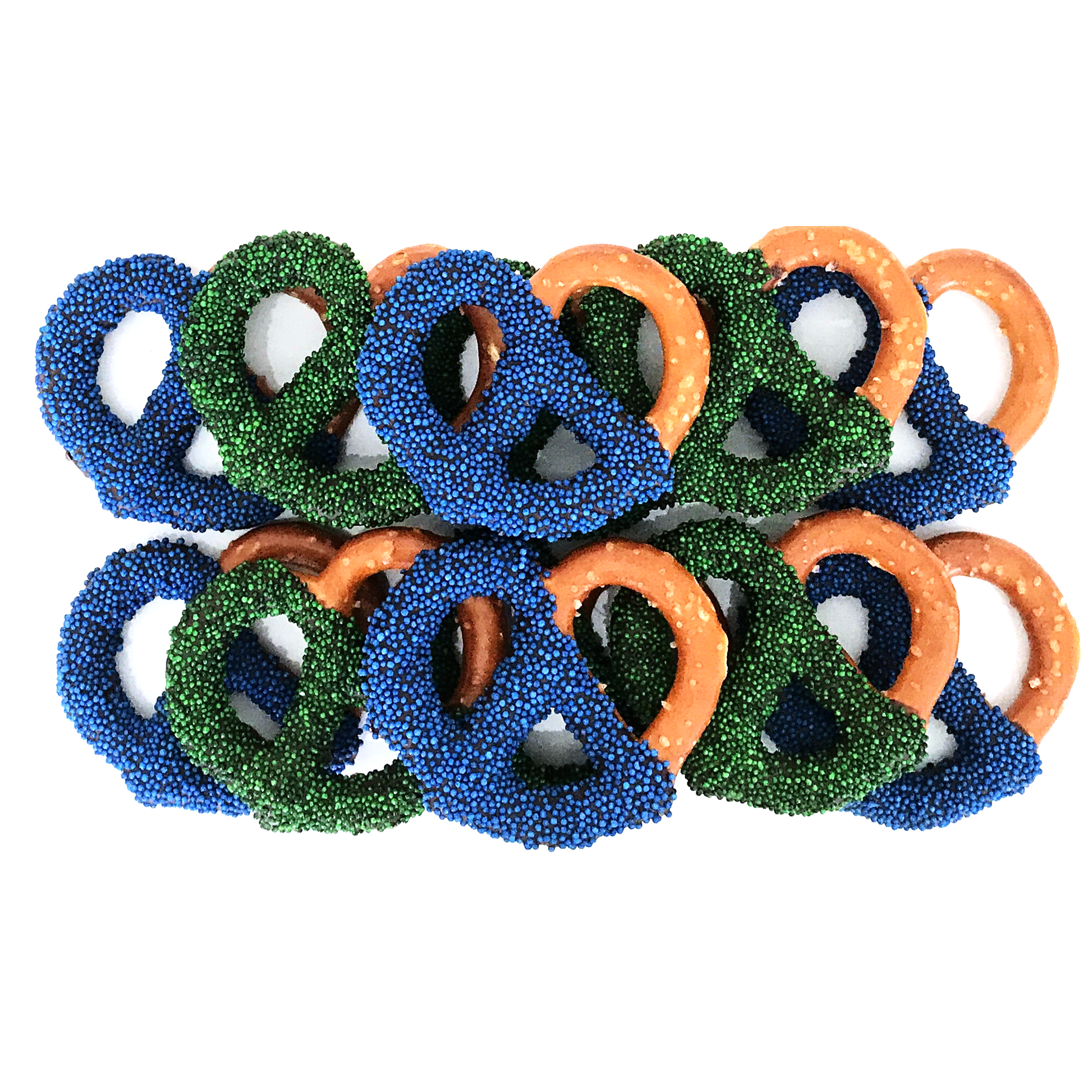 For all of you Tulane fans, these yummy large 3" pretzels are dipped in chocolate and topped with Tulane University colored sprinkles. These are the perfect sweet and salty treat and make a wonderful college acceptance gift, college care package, gift for exams, graduation, any time, birthdays, sorority/fraternity gift, for a Tulane alumni, or any Tulane fan. Each order is beautifully packaged. (Exact packaging may vary based on availability.)