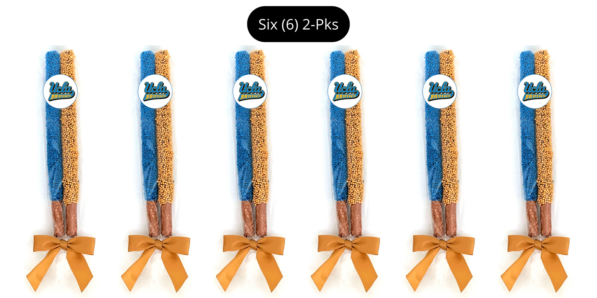 GO BRUINS! These yummy chocolate pretzel rods are topped with UCLA colored sprinkles. These are the perfect sweet and salty treat and make a wonderful college care package/gift for exams, graduation, any time, birthdays, sorority/fraternity gift, for a UCLA alumni, or any UCLA fan. Each order is beautifully packaged. (Exact packaging may vary based on availability.)