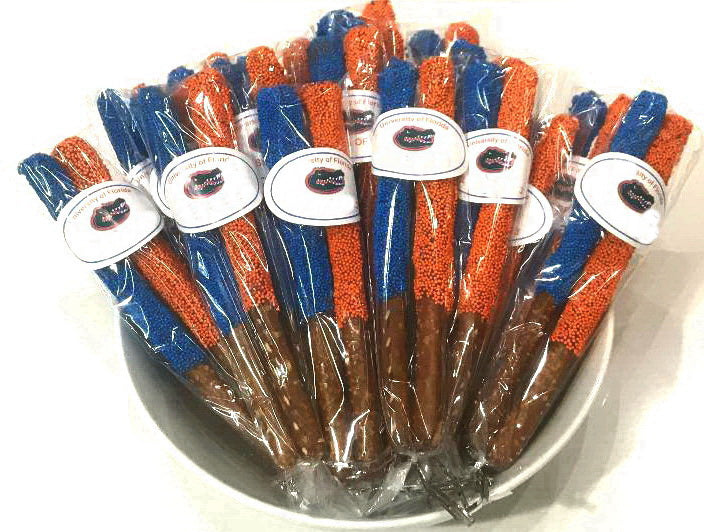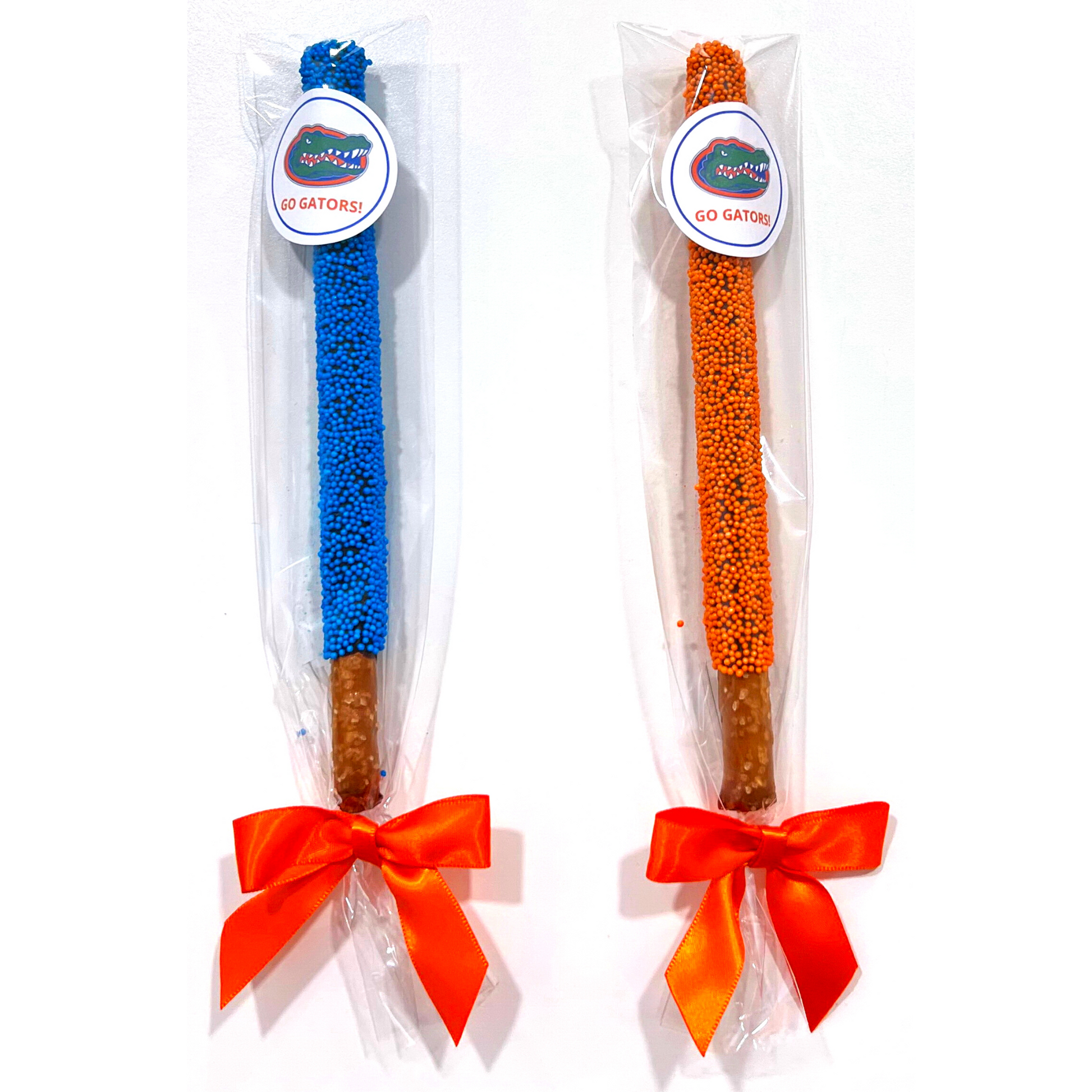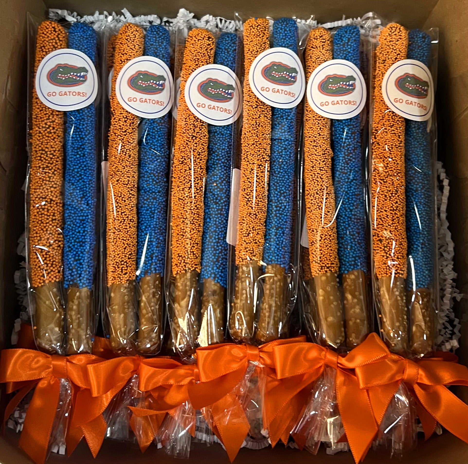 GO GATORS! These yummy chocolate pretzel rods are topped with University of Florida colored sprinkles. These are the perfect sweet and salty treat and make a wonderful college care package/gift for exams, graduation, any time, birthdays, sorority/fraternity gift, for a UF alumni, or any UF fan. Each order is beautifully packaged. (Exact packaging may vary based on packaging product availability.)