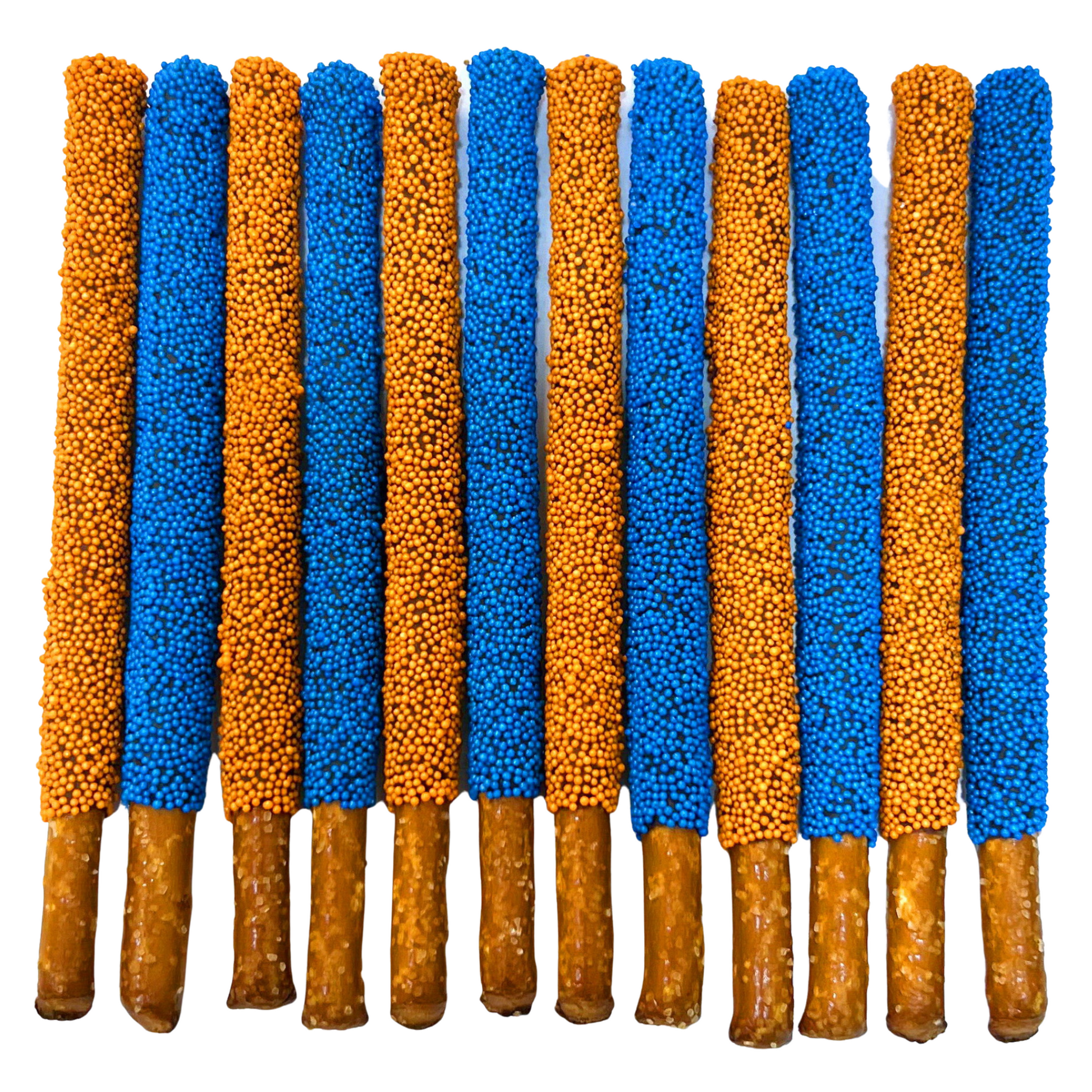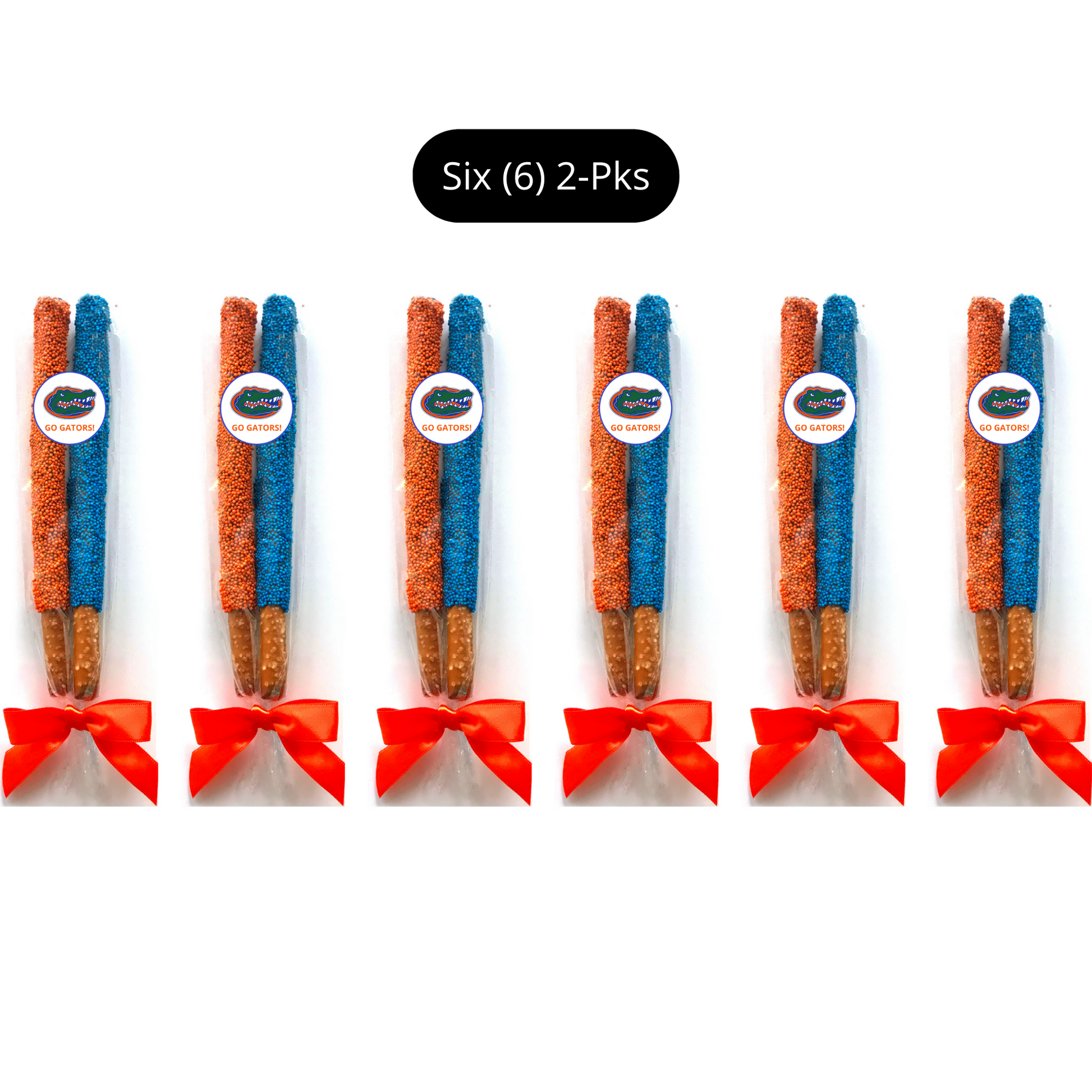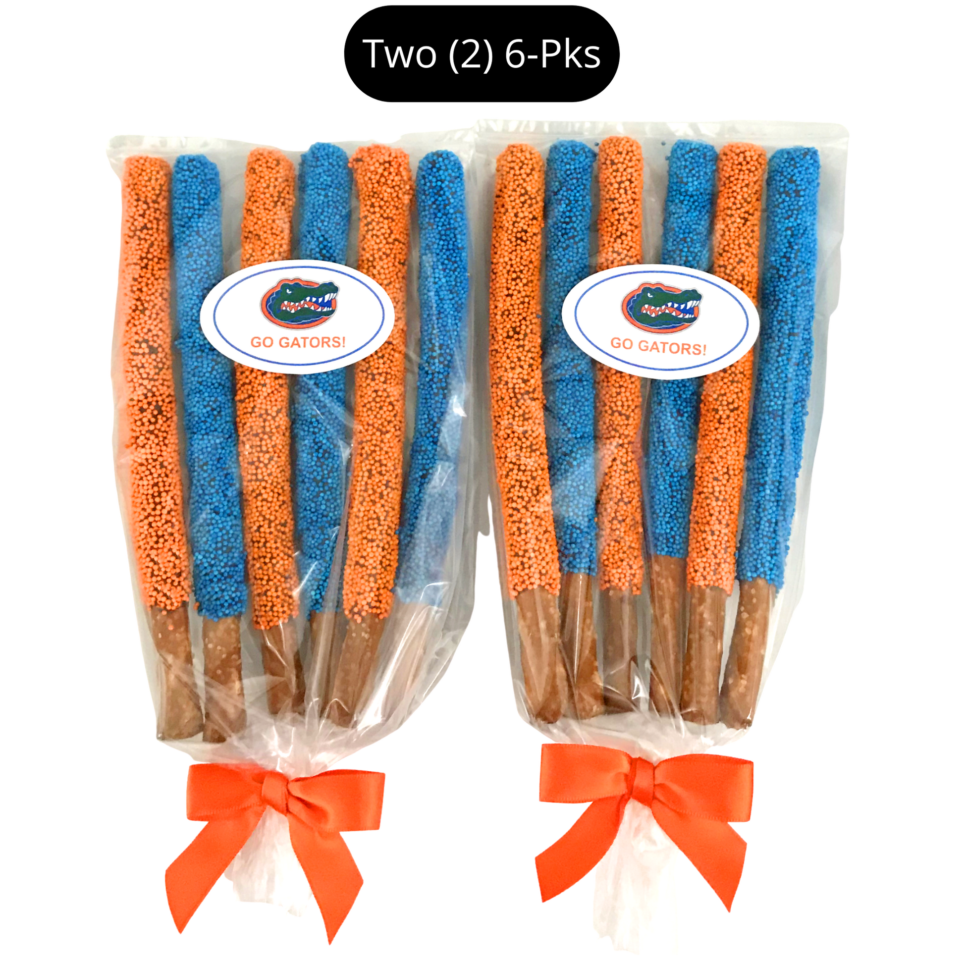 GO GATORS! These yummy chocolate pretzel rods are topped with University of Florida colored sprinkles. These are the perfect sweet and salty treat and make a wonderful college care package/gift for exams, graduation, any time, birthdays, sorority/fraternity gift, for a UF alumni, or any UF fan. Each order is beautifully packaged. (Exact packaging may vary based on packaging product availability.)