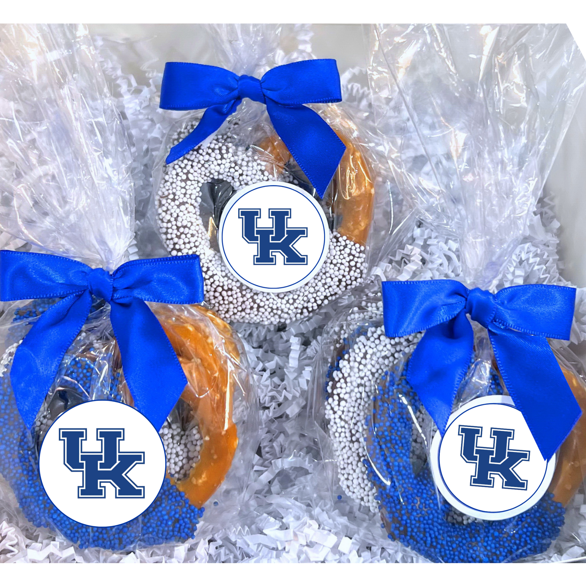 GO WILDCATS! These yummy large 3" pretzels are dipped in chocolate and topped with University of Kentucky colored sprinkles. These are the perfect sweet and salty treat and make a wonderful college acceptance gift, college care package, gift for exams, graduation, any time, birthdays, sorority/fraternity gift, for a UK alumni, or any UK fan. Each order is beautifully packaged. (Exact packaging may vary based on availability.)