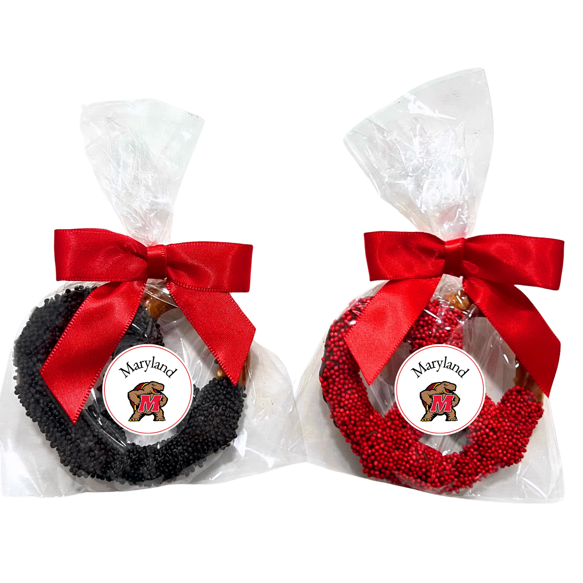 GO TERPS! These yummy large 3" pretzels are dipped in chocolate and topped with University of Maryland colored sprinkles. These are the perfect sweet and salty treat and make a wonderful college acceptance gift, college care package, gift for exams, graduation, any time, birthdays, sorority/fraternity gift, for a UM alumni, or any UM fan. Each order is beautifully packaged. (Exact packaging may vary based on availability.)