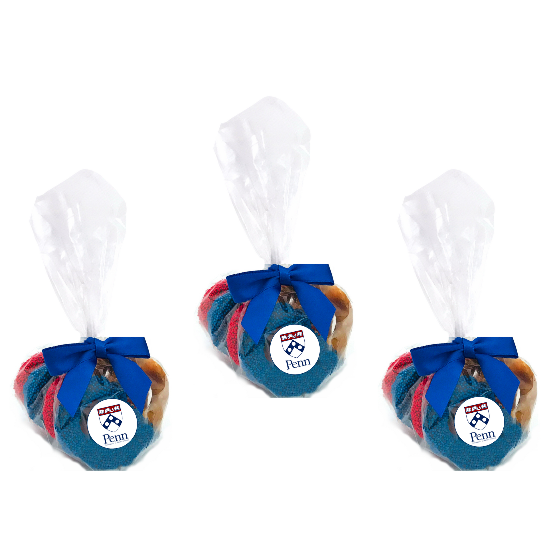GO QUAKERS! These yummy large 3" pretzels are dipped in chocolate and topped with University of Pennsylvania colored sprinkles. These are the perfect sweet and salty treat and make a wonderful college care package/gift for exams, graduation, any time, birthdays, sorority/fraternity gift, for a UPenn alumni, or any UPenn fan. Each order is beautifully packaged. (Exact packaging may vary based on availability.)
