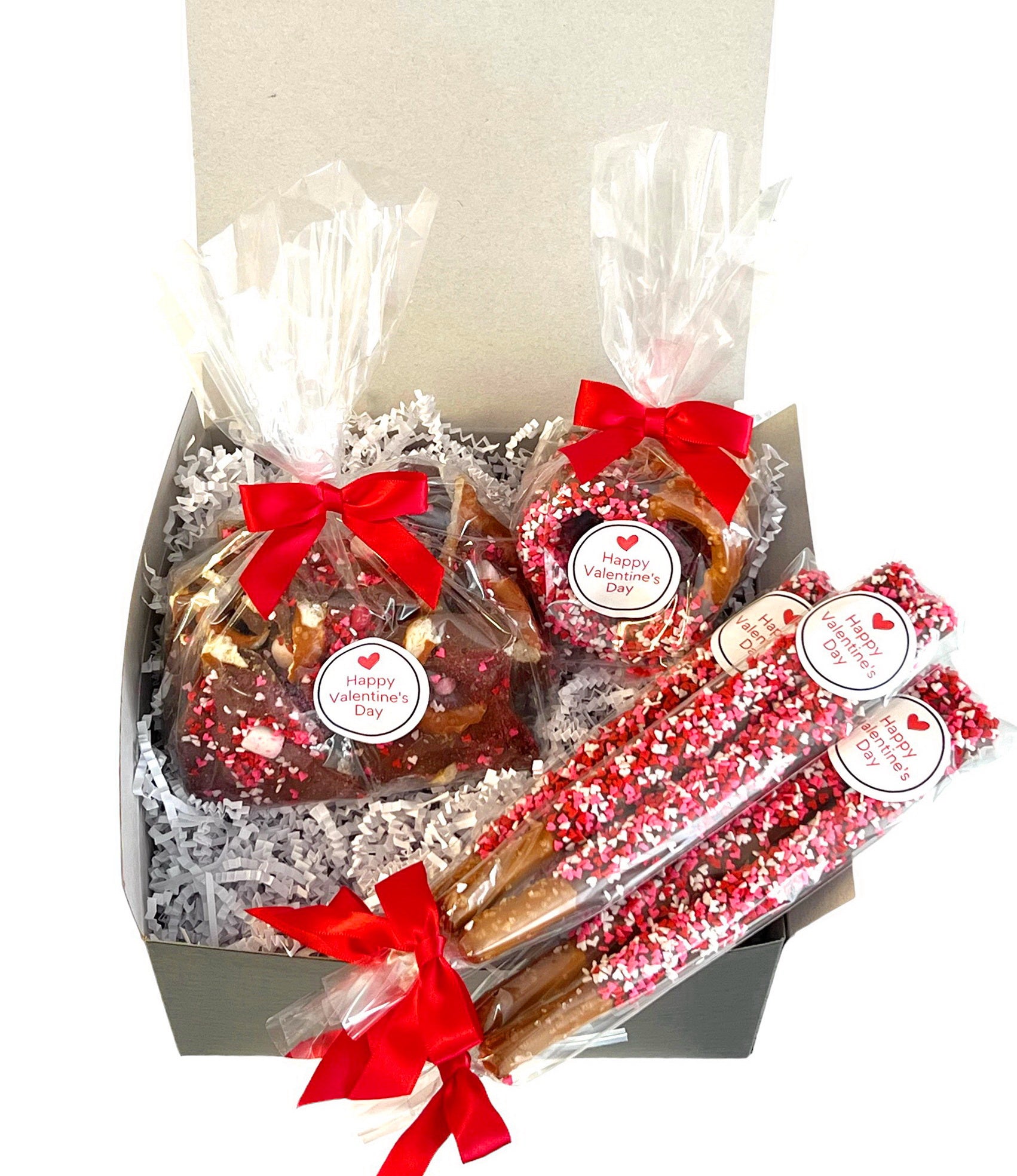 - 1/2 Dozen Chocolate Covered Pretzel Rods: Three 2-Packs (as shown). Topped with tiny heart sprinkles. (Large: A full dozen Rods, Six 2-Packs.)